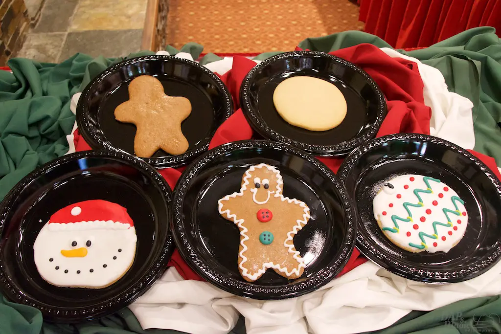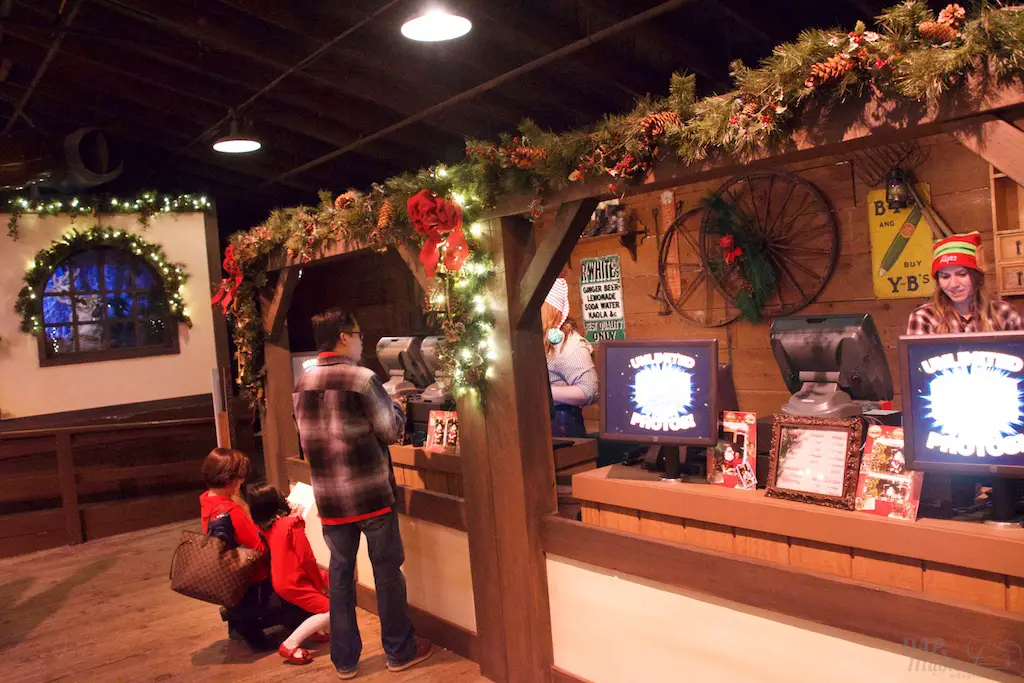 Desserts are scattered throughout the park as well. A frosted churro cane is available at the Churro Stand. Peppermint cotton candy is at various locations, including Santa’s Christmas Cabin. Mrs. Claus Cabin near Santa’s in Ghost Town has a cookie decoration opportunity. Toppings are available for visitors to decorate their own Christmas cookie.