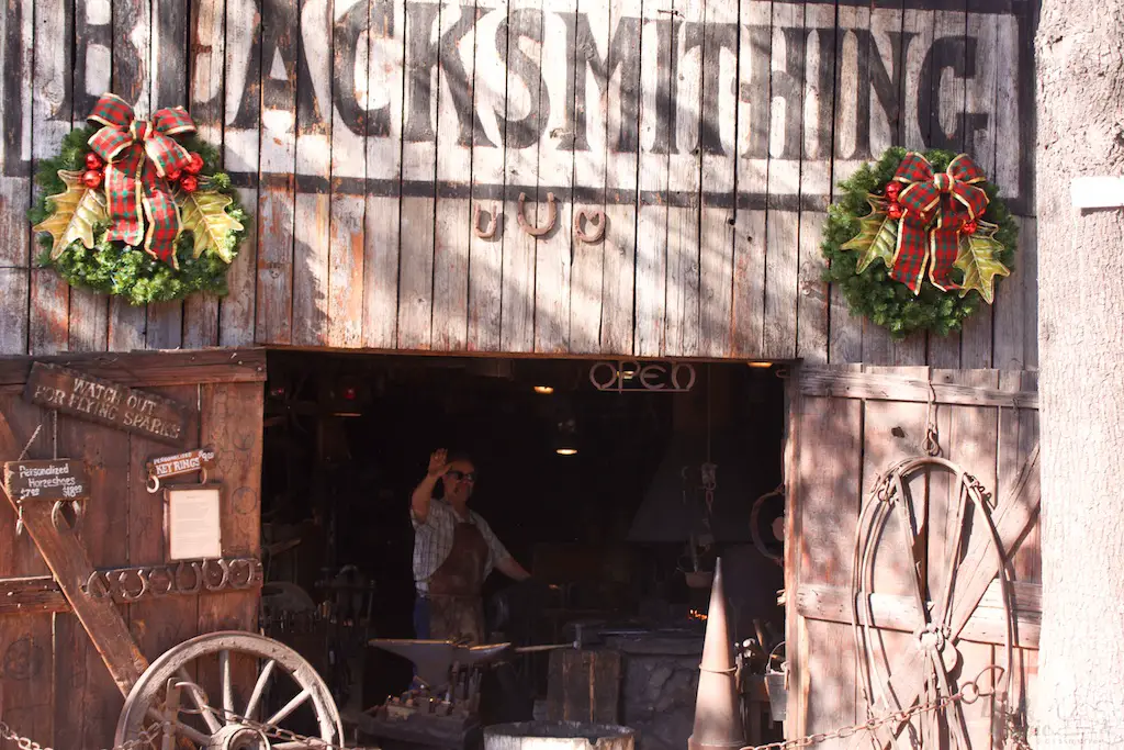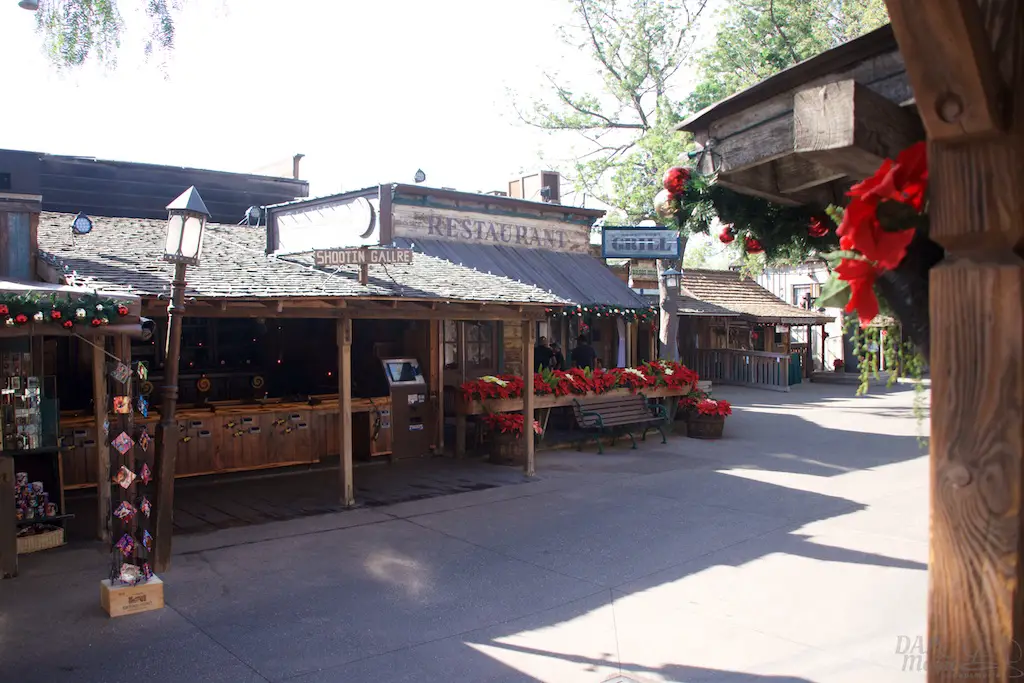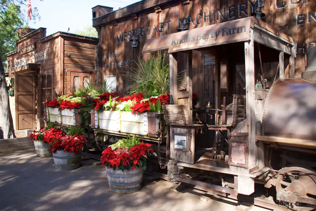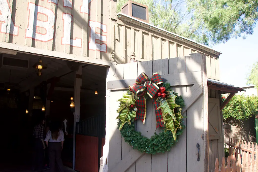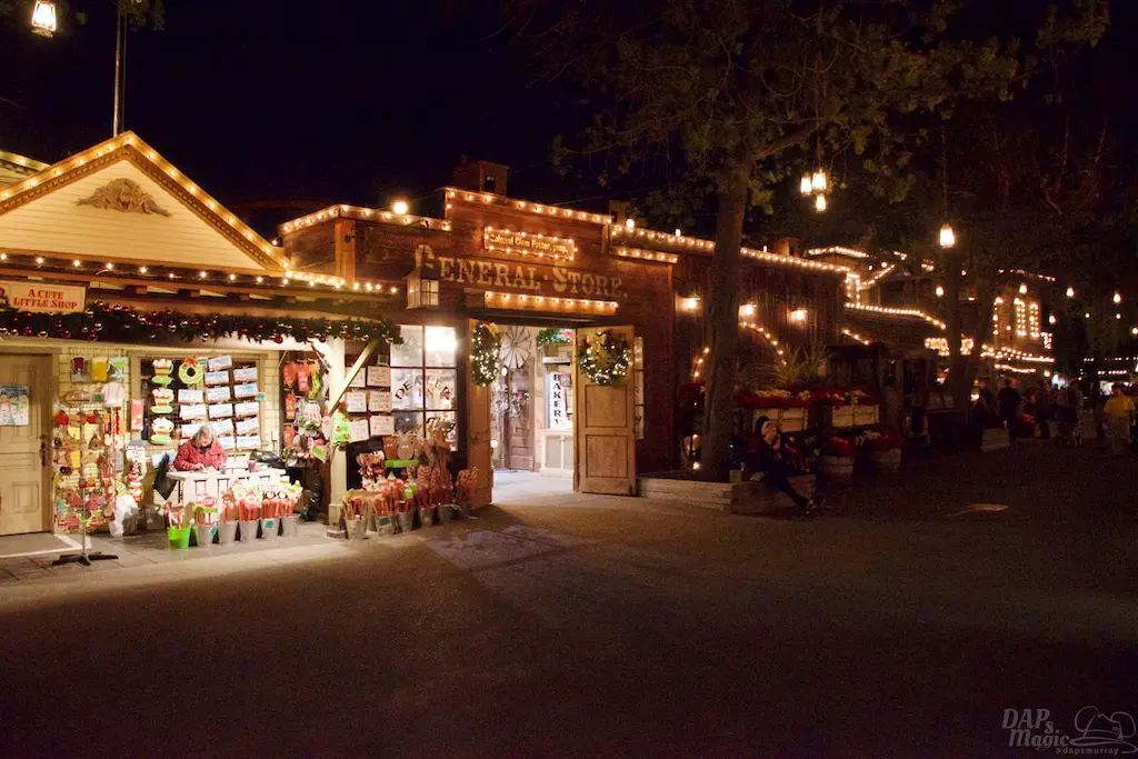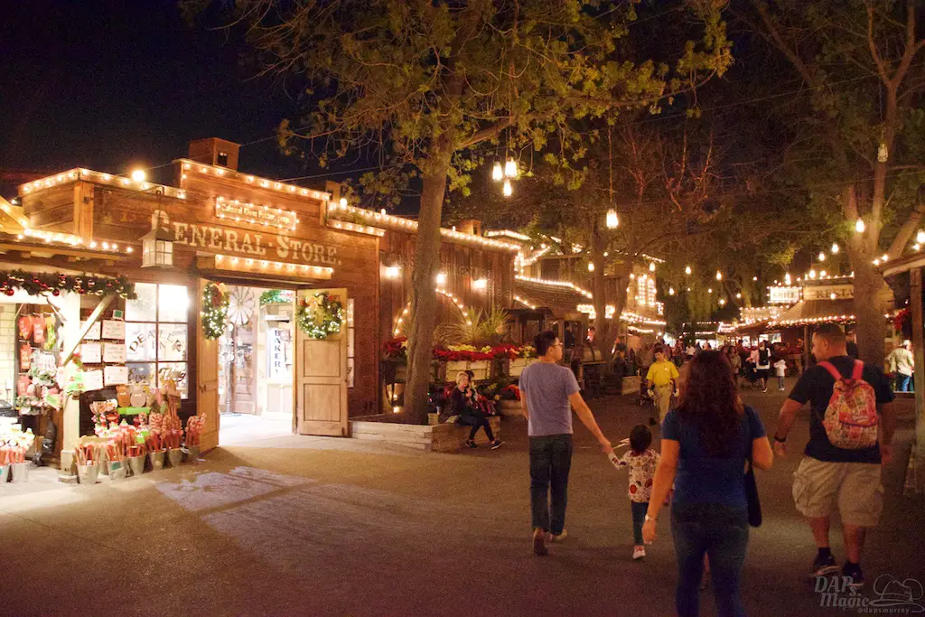 Ghost Town is the most spectacular with many wreaths, poinsettias, and garland all over. Lights adorn the buildings at night. Also at night is periodic snowfall that makes it a white Christmas in California.