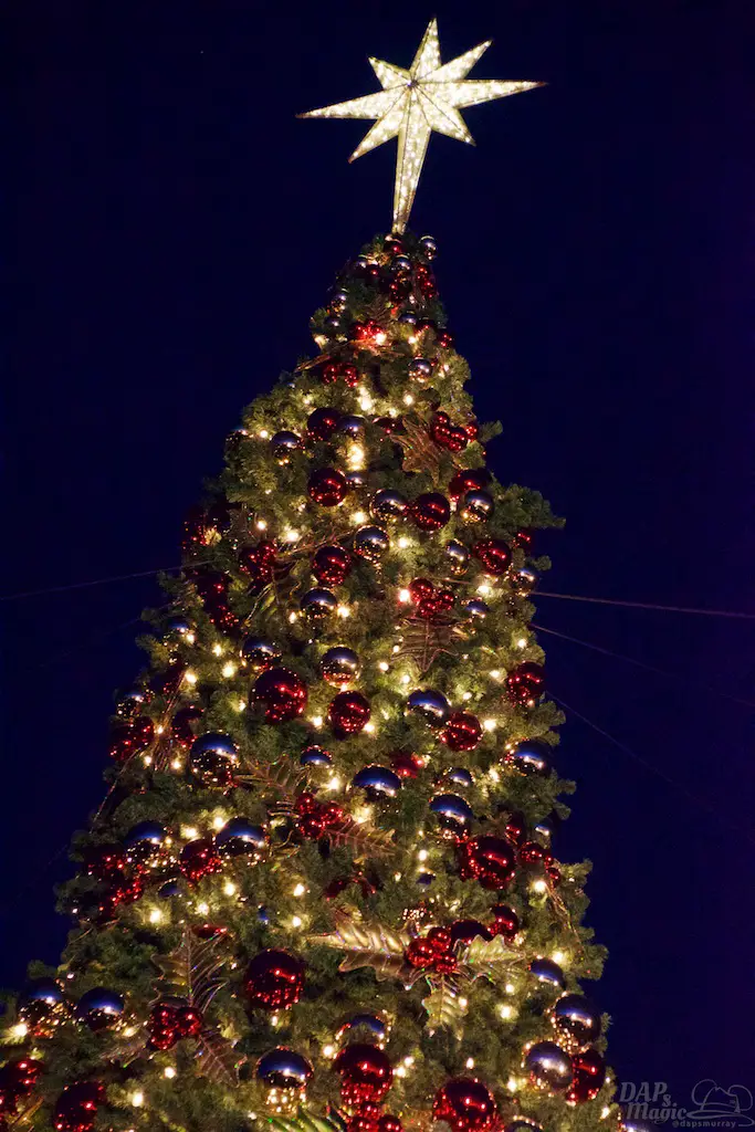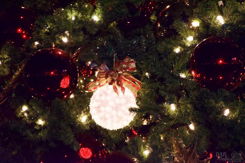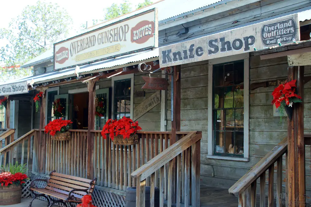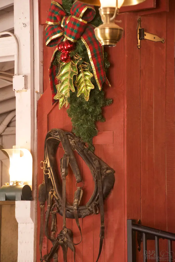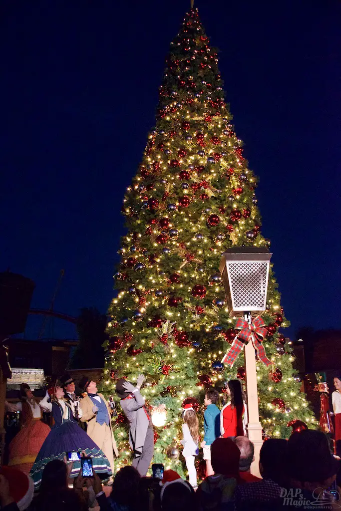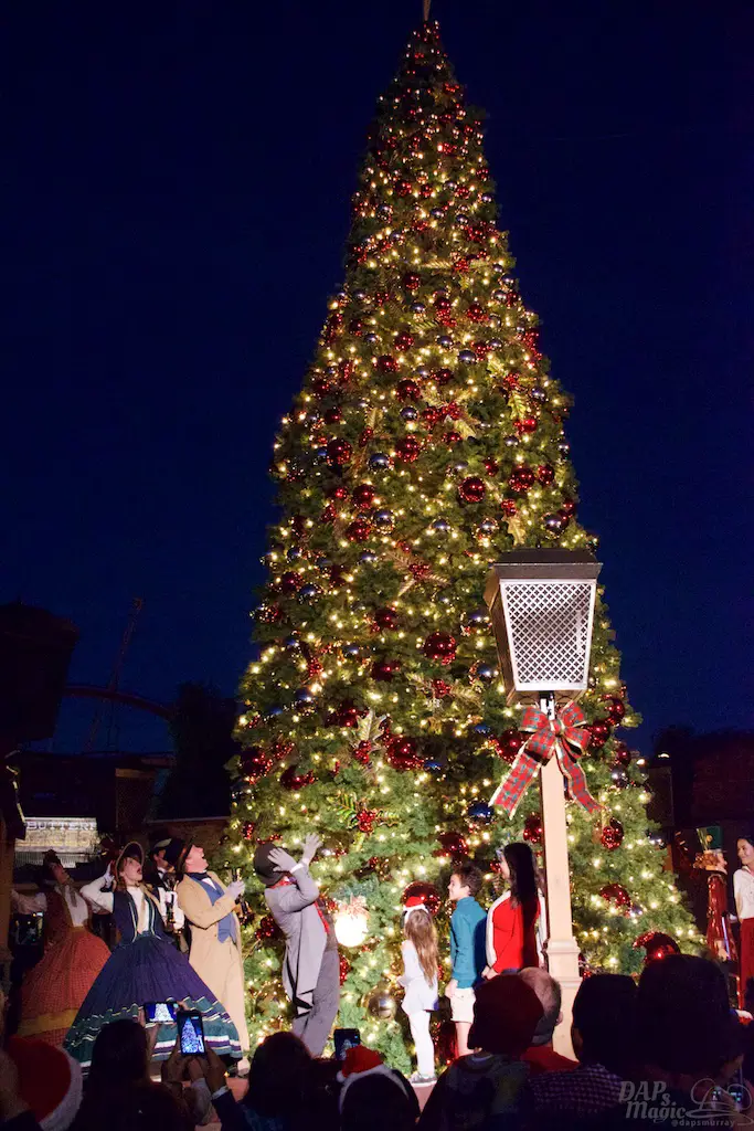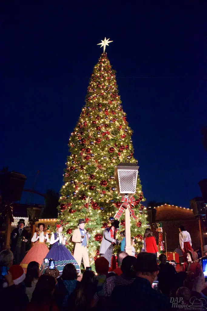 Ghost Town is the most spectacular with many wreaths, poinsettias, and garland all over. Lights adorn the buildings at night. Also at night is periodic snowfall that makes it a white Christmas in California.