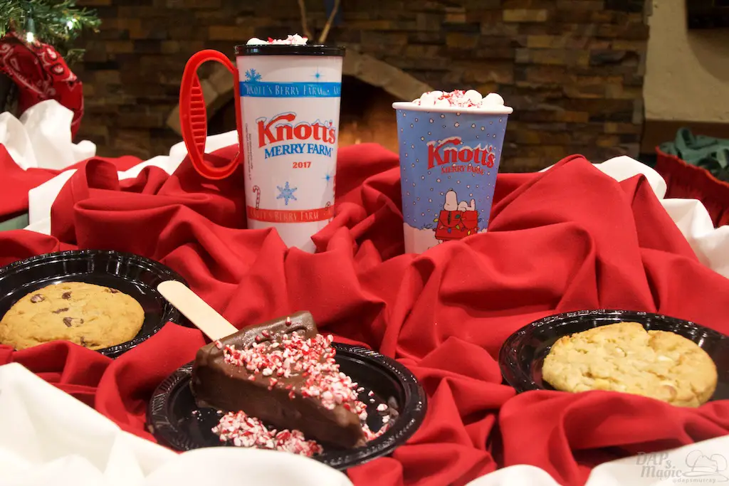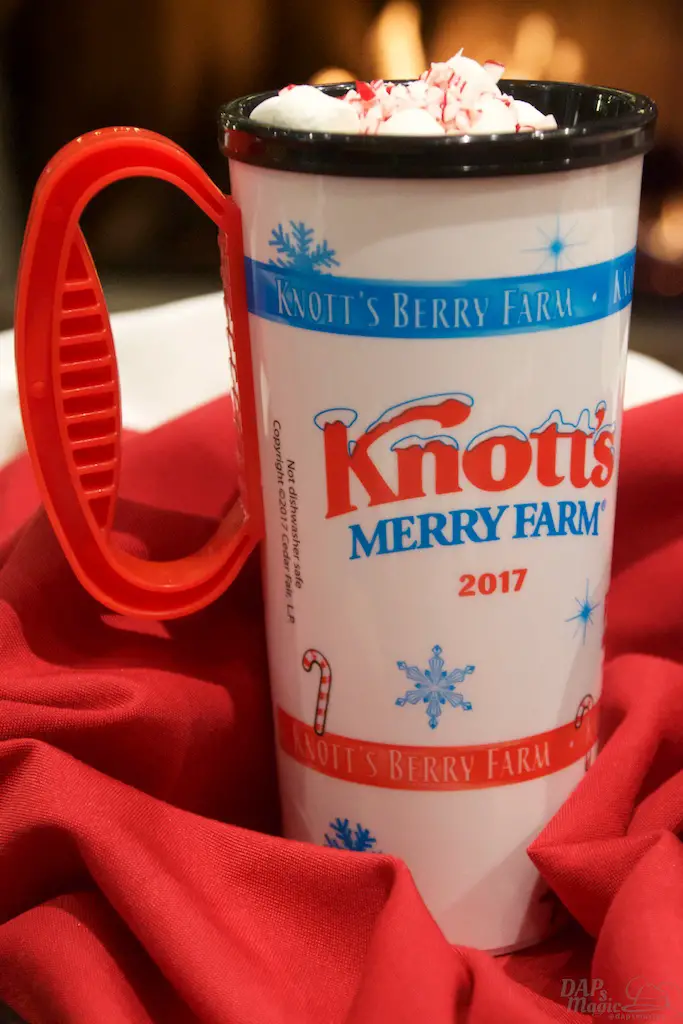 This year the menu has expanded at Knott’s Merry Farm. Wilderness Hall has often hosted Santa’s Christmas Cabin with Santa himself. Inside are some great treats, but this year they have really outdone themselves. Returning to the cabin are milk and cookies, egg nog, coffee and hot chocolate, and roasted nuts. Added are tamales, cheesecake on a stick with peppermint, specially flavored kettle corn, and crepes. The hot chocolate also has the option of having peppermint crumbles and marshmallows added, and the Snoopy inspired cup is adorable.