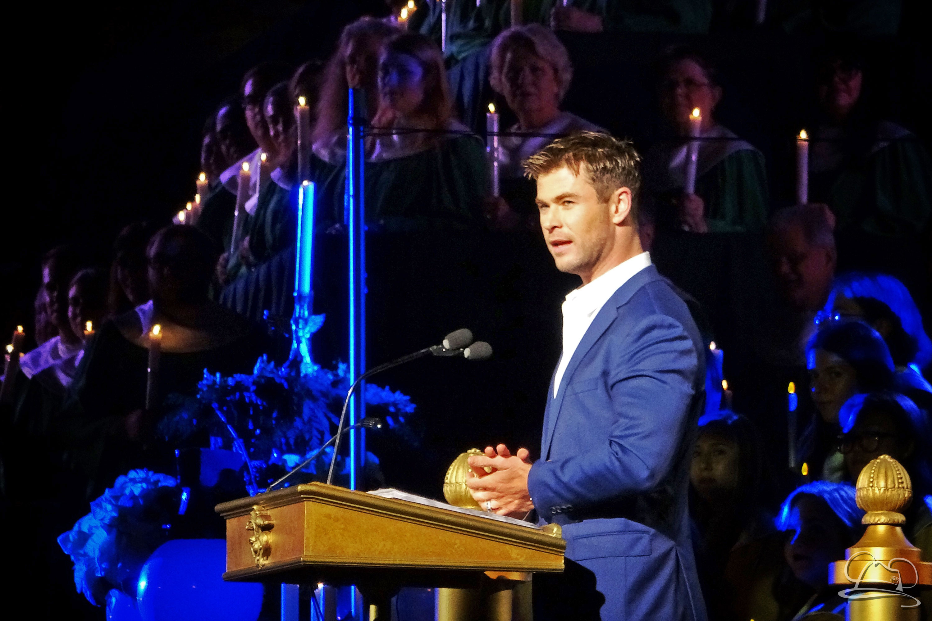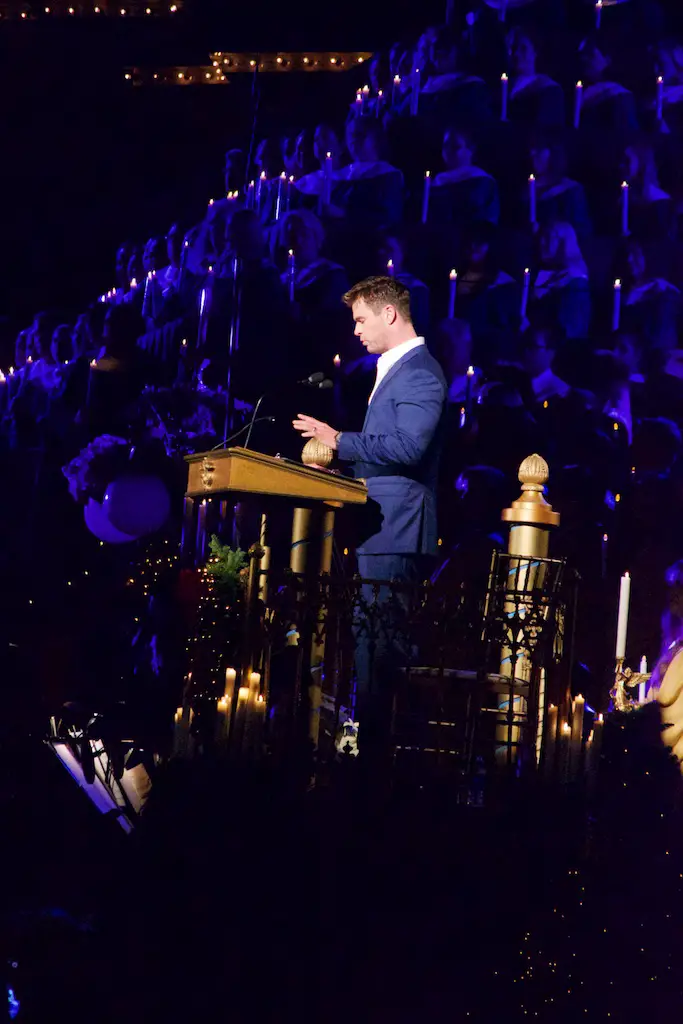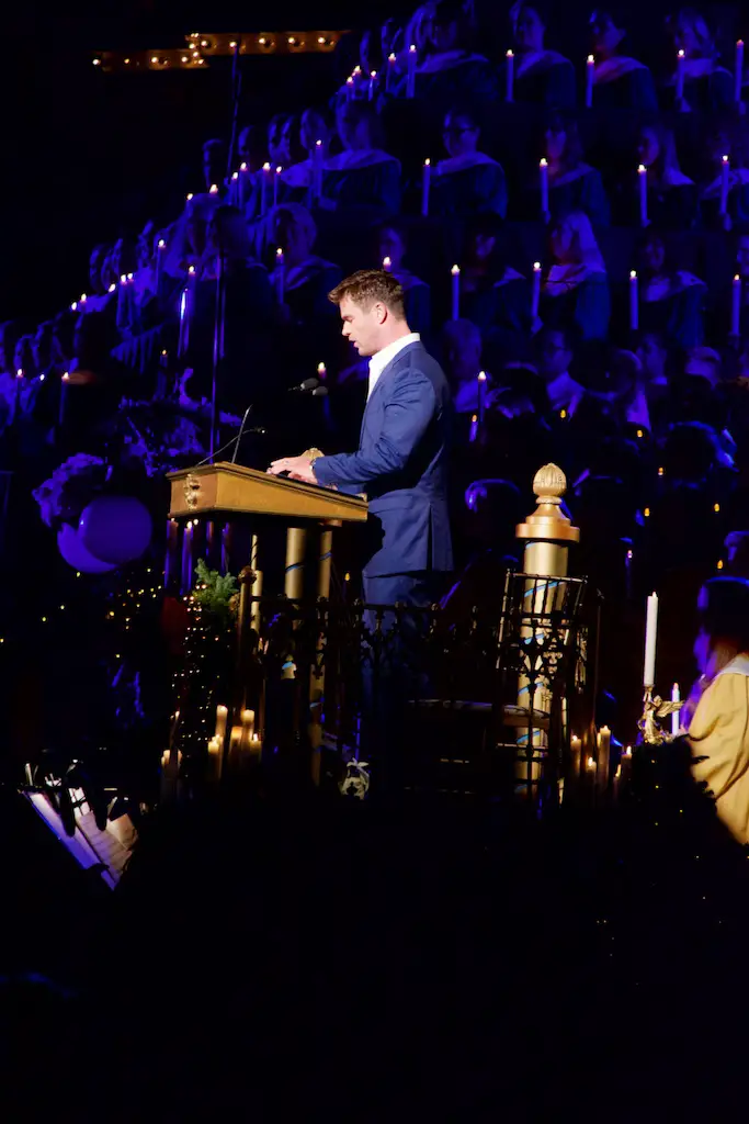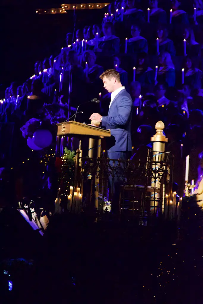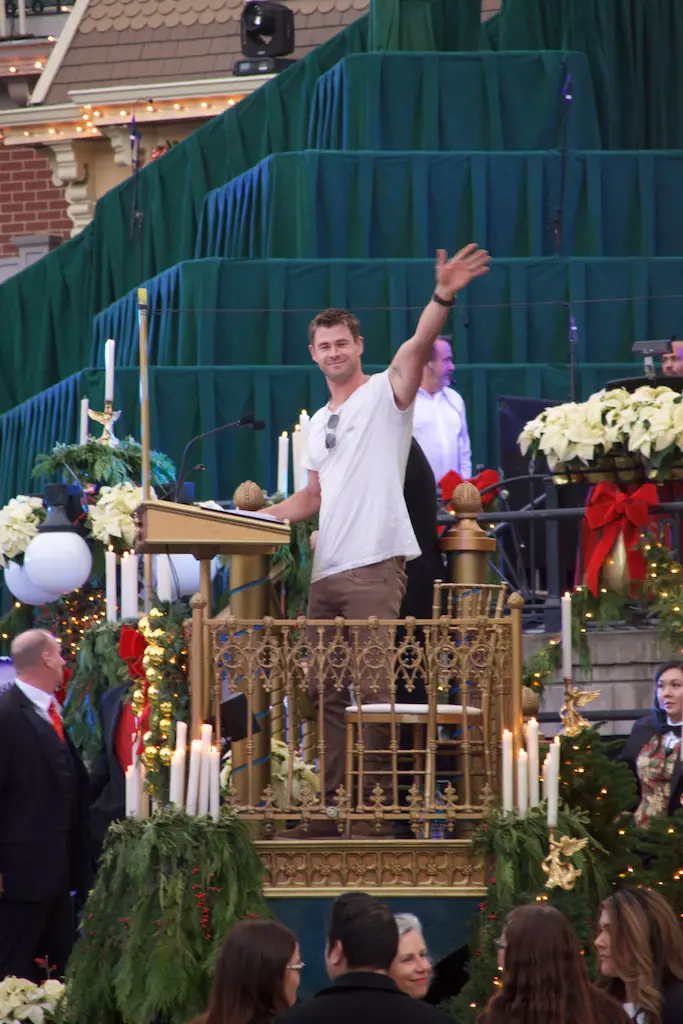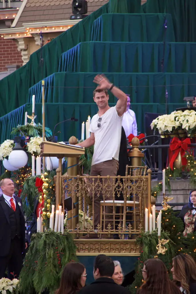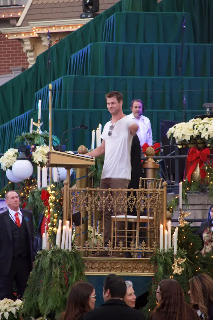 The choir is comprised of multiple choirs from schools, colleges, churches, and the Disney cast choirs. This year on Saturday the celebrity narrator was Chris Hemsworth. Hemsworth, most known for his role as Thor, was received with cheers from those waiting during the mic check and then again for the actual ceremonies.