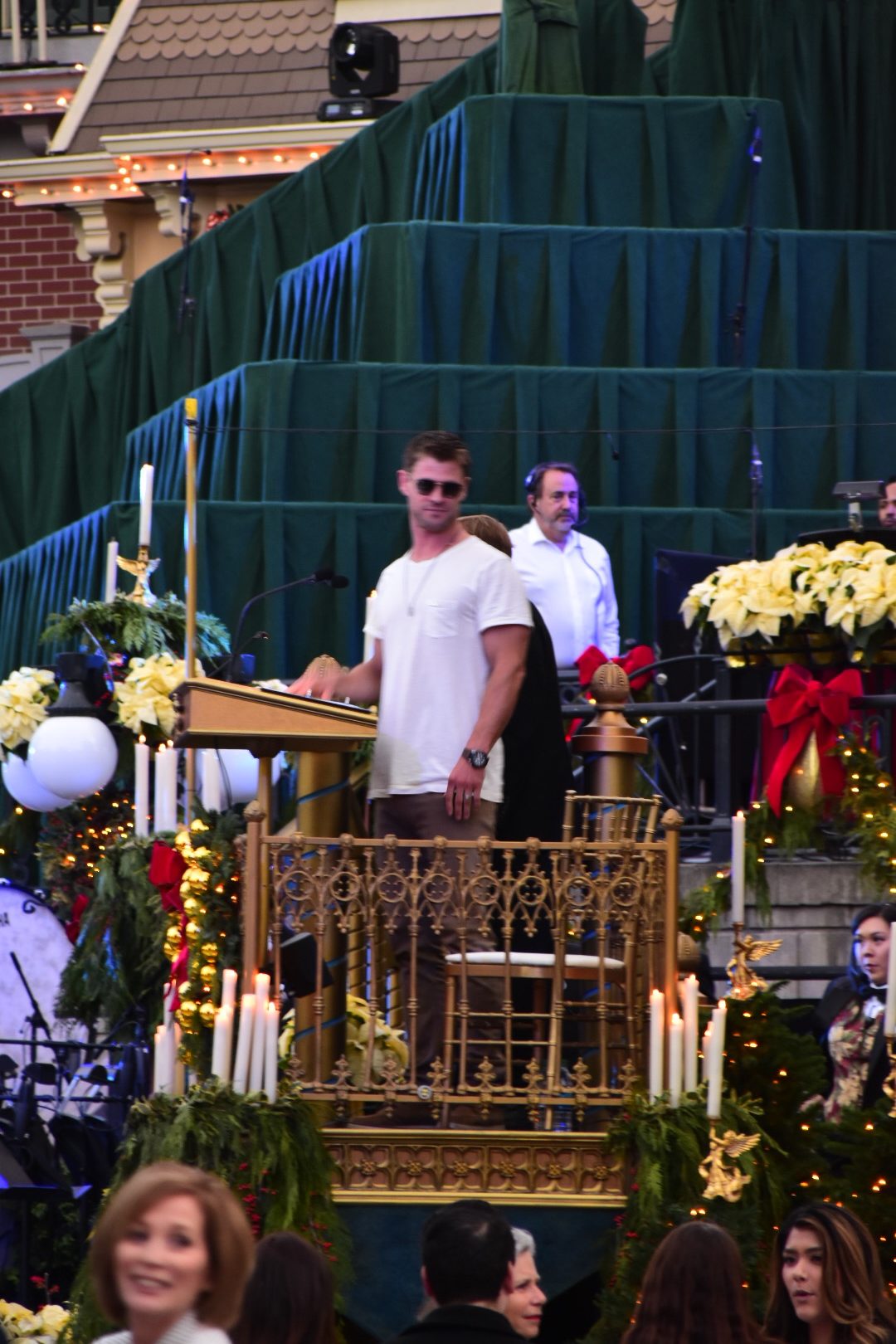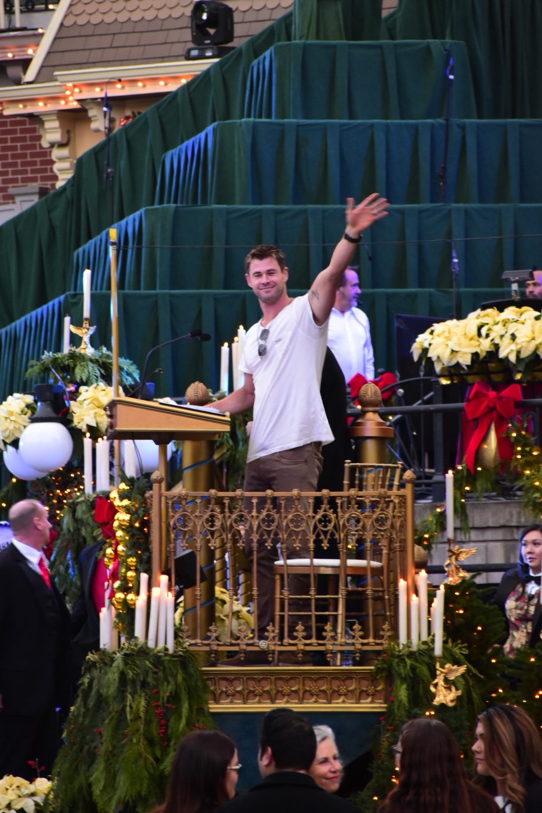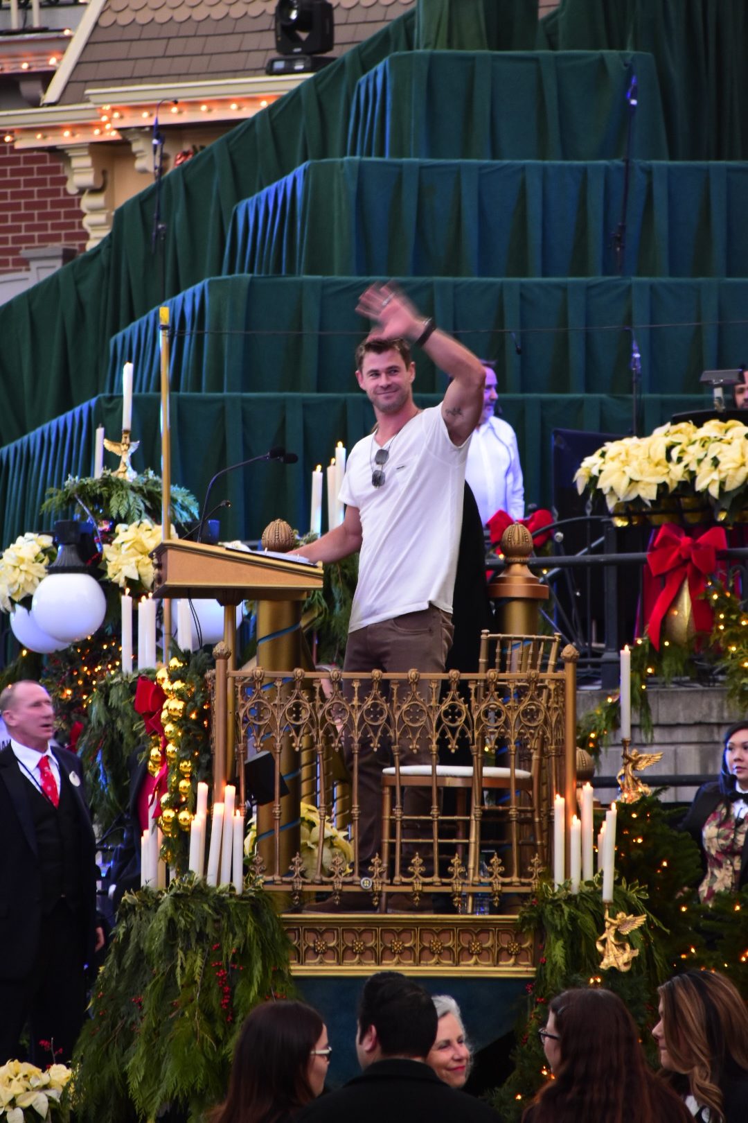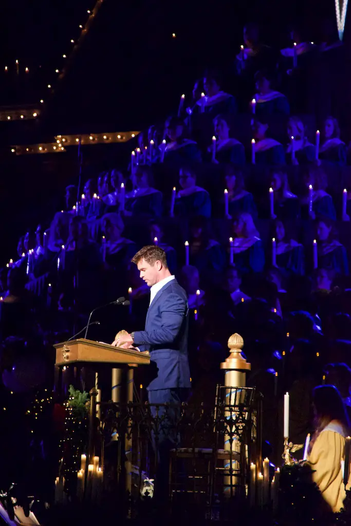 The choir is comprised of multiple choirs from schools, colleges, churches, and the Disney cast choirs. This year on Saturday the celebrity narrator was Chris Hemsworth. Hemsworth, most known for his role as Thor, was received with cheers from those waiting during the mic check and then again for the actual ceremonies.