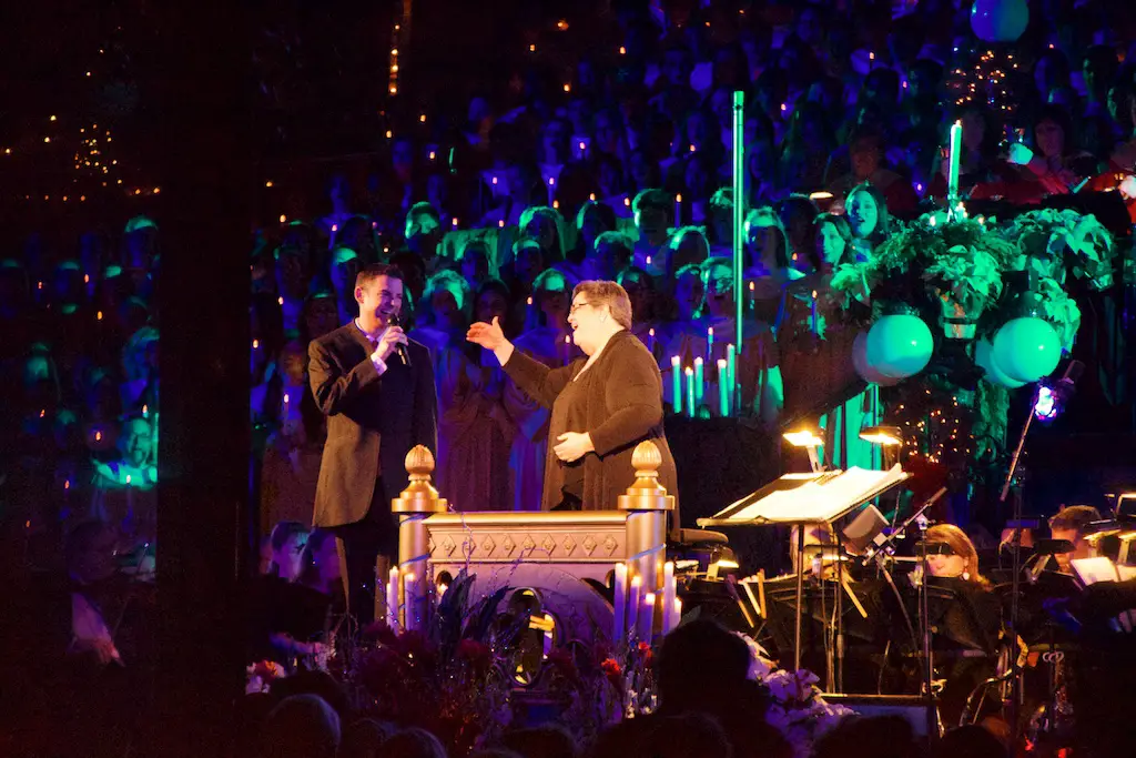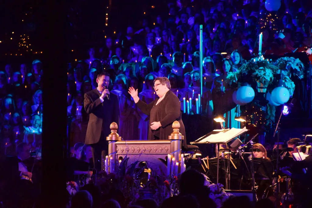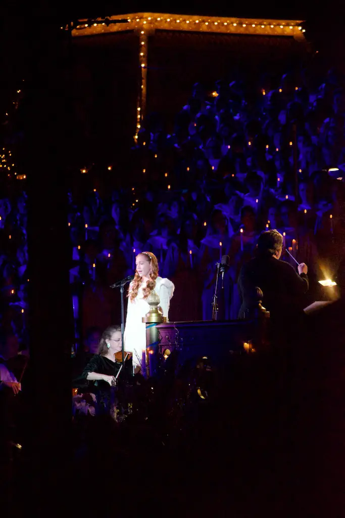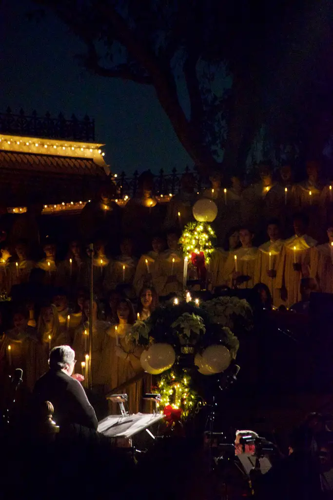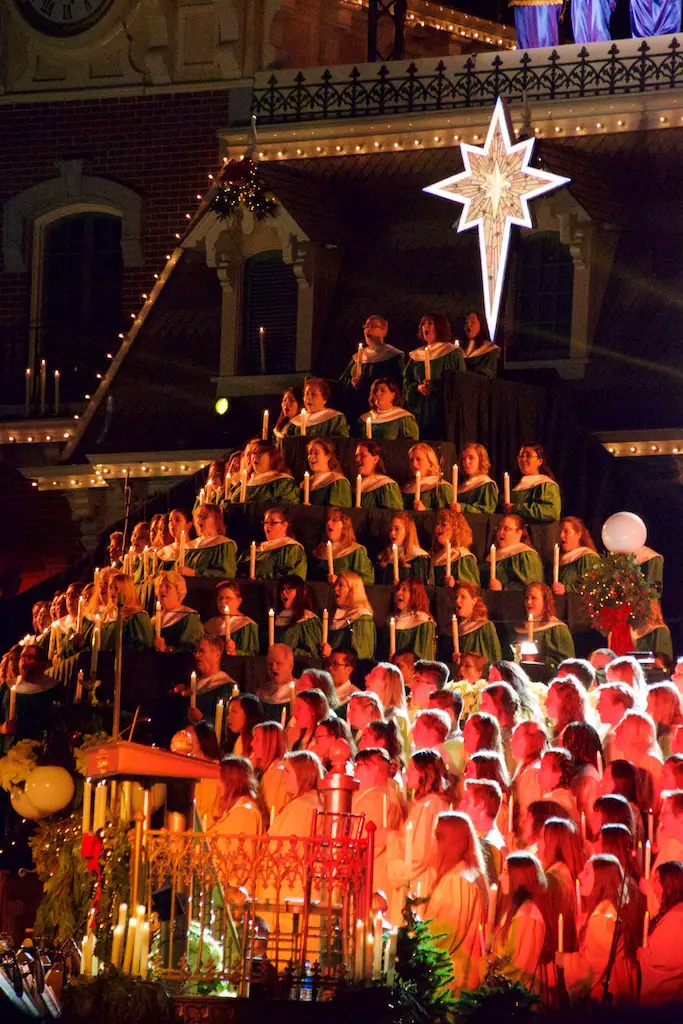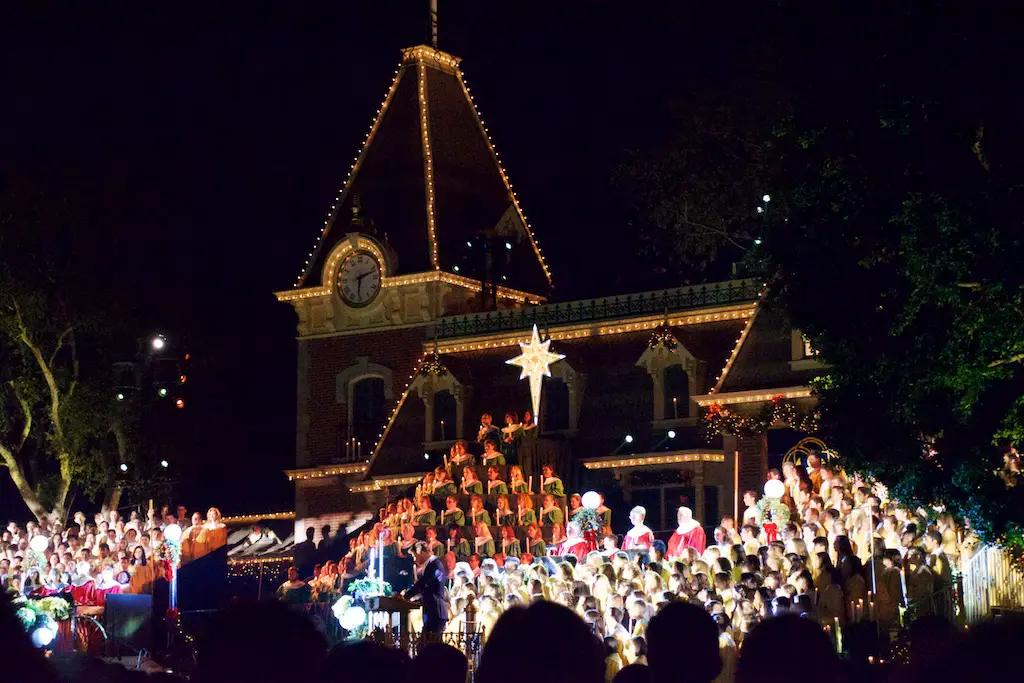 Disneyland took the Christmas season to a whole new level as it shares the story of Christmas with the annual Candlelight Processional and Ceremony. Every year on the first weekend of December the front of Main Street Station is transformed into a giant stage that will accommodate a choir of 600, handbells, orchestra, soloists, and a celebrity narrator. Together they chronicle the events of the very first Christmas. This is a tradition that dates back to 1958.