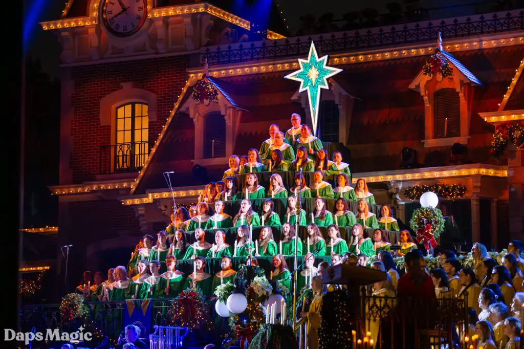 After the success of Candlelight the first year and the lessons learned from it, bleachers were built next to the Main Street, USA Station so that it would be easier for people to watch the performance in Town Square. In 1959, there were 2,574 singers, making it the largest choir to perform in the Candlelight Ceremony at Disneyland. The Candlelight Ceremony became closer to what is known and loved today in 1960 when a stage was built on the front of the Main Street, USA Station. With this came the “living Christmas tree.” It originally was made up of the Western High School A’Capella Choir. This choir continued to make up the “living Christmas tree” until 1981, when its conductor retired. The following year, the Disney Employee Choir filled the tree. They have continued to do so ever since.