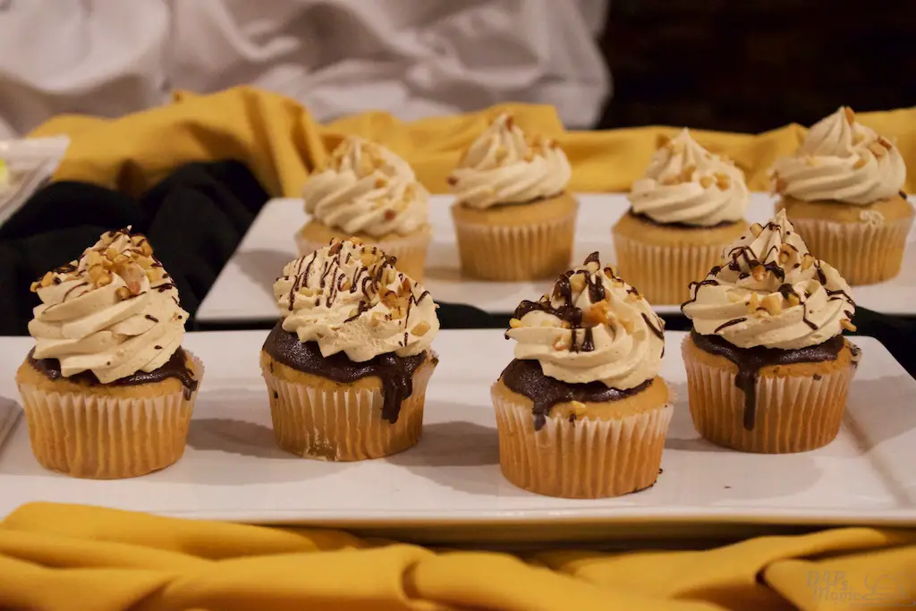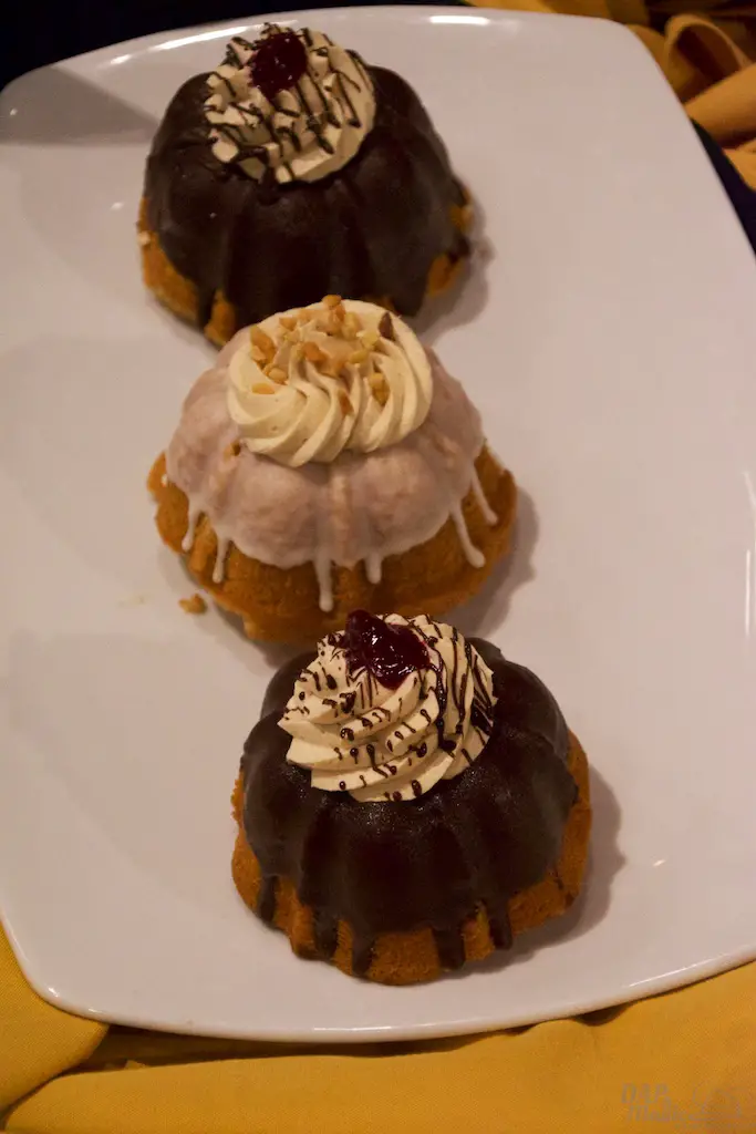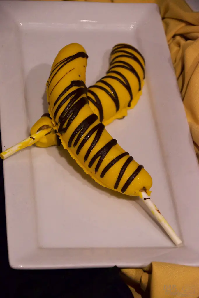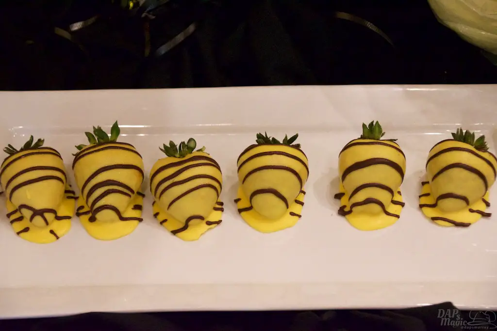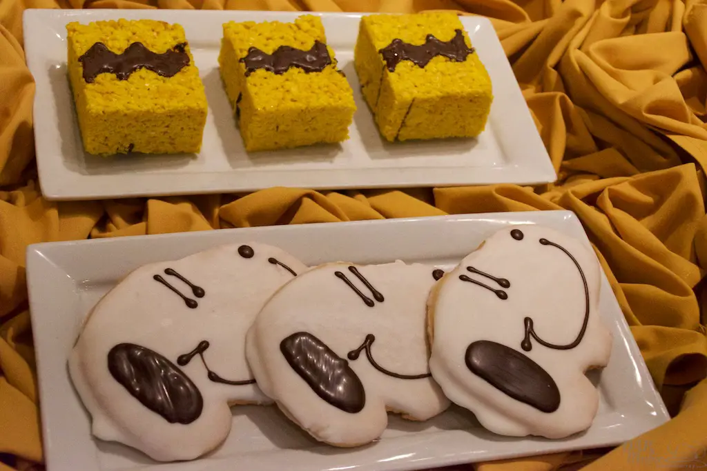 Charlie Brownies feature the signature stripe from the main character. A Marshmallow Pop does the same, as well as Cotton Candy, a cupcake, and Krispy square. There are Snoopy cupcakes and a peanut butter raspberry mousse cupcake (my personal favorite). Peanut Butter funnel cake has strawberries with it making it like a peanut butter and jelly sandwich. A white chocolate dipped frozen banana features the Charlie Brown colors, and a dipped strawberry does too. White chocolate peanut butter raspberry bundt cake looks like a meal in itself. Rounding it all out are cookies, peanut butter moon pie, fruit loops crisp bar, and chocolate dipped apples! It will take a couple days just to get through all this food! And they are all excellent! If you couldn’t see, the theme is peanuts as it is a Peanuts Celebration, so just beware of allergies.