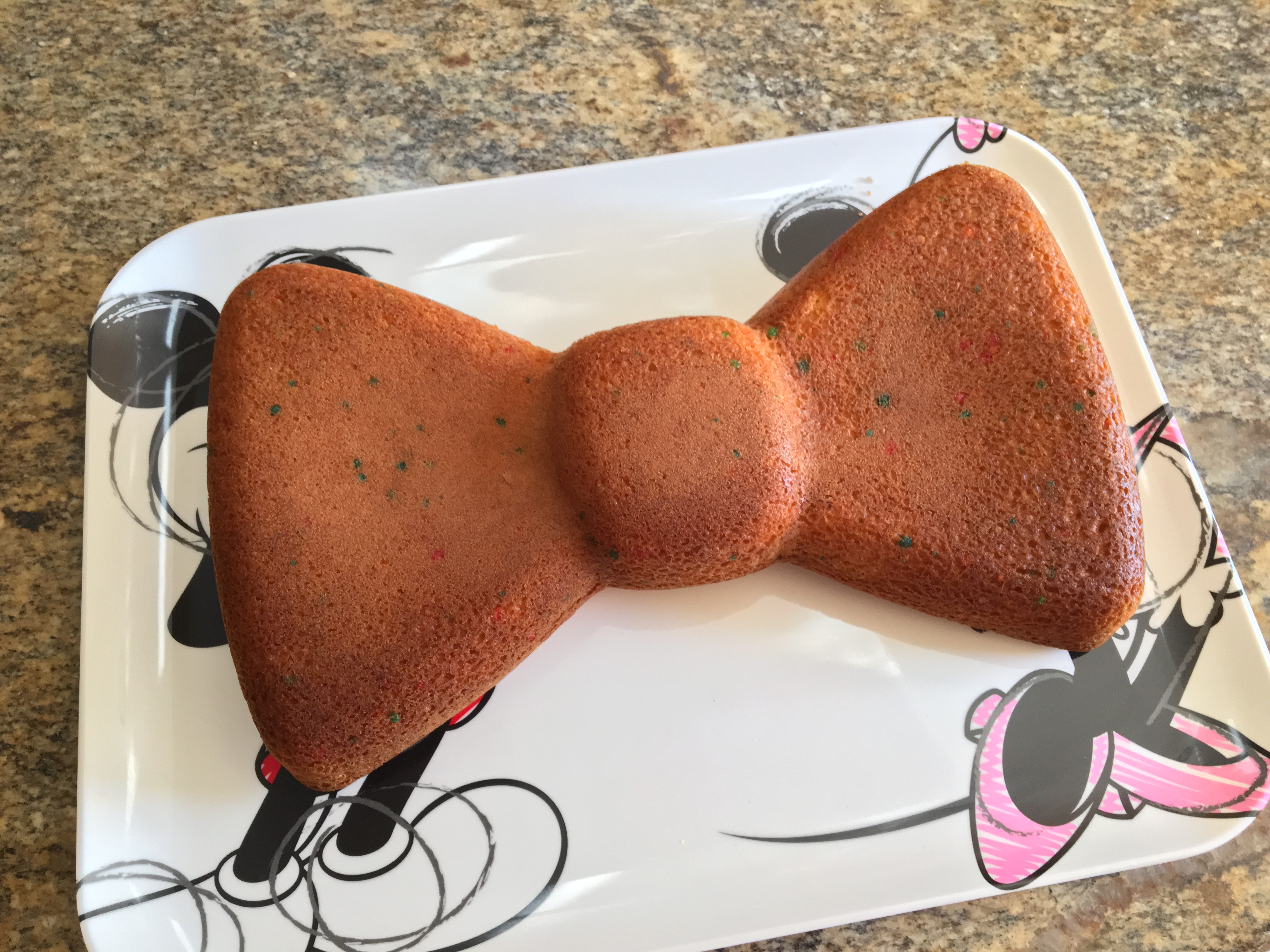 Now, I did actually find a bow cake pan, and this was the perfect way to use it! It worked great with one box of cake mix, and then I shaved it to make the bottom flat. If you have a rectangular shaped pan, you could cut two triangles and a small circle to achieve a similar shape. I went with party chip cake mix, because it’s a polka dot cake!