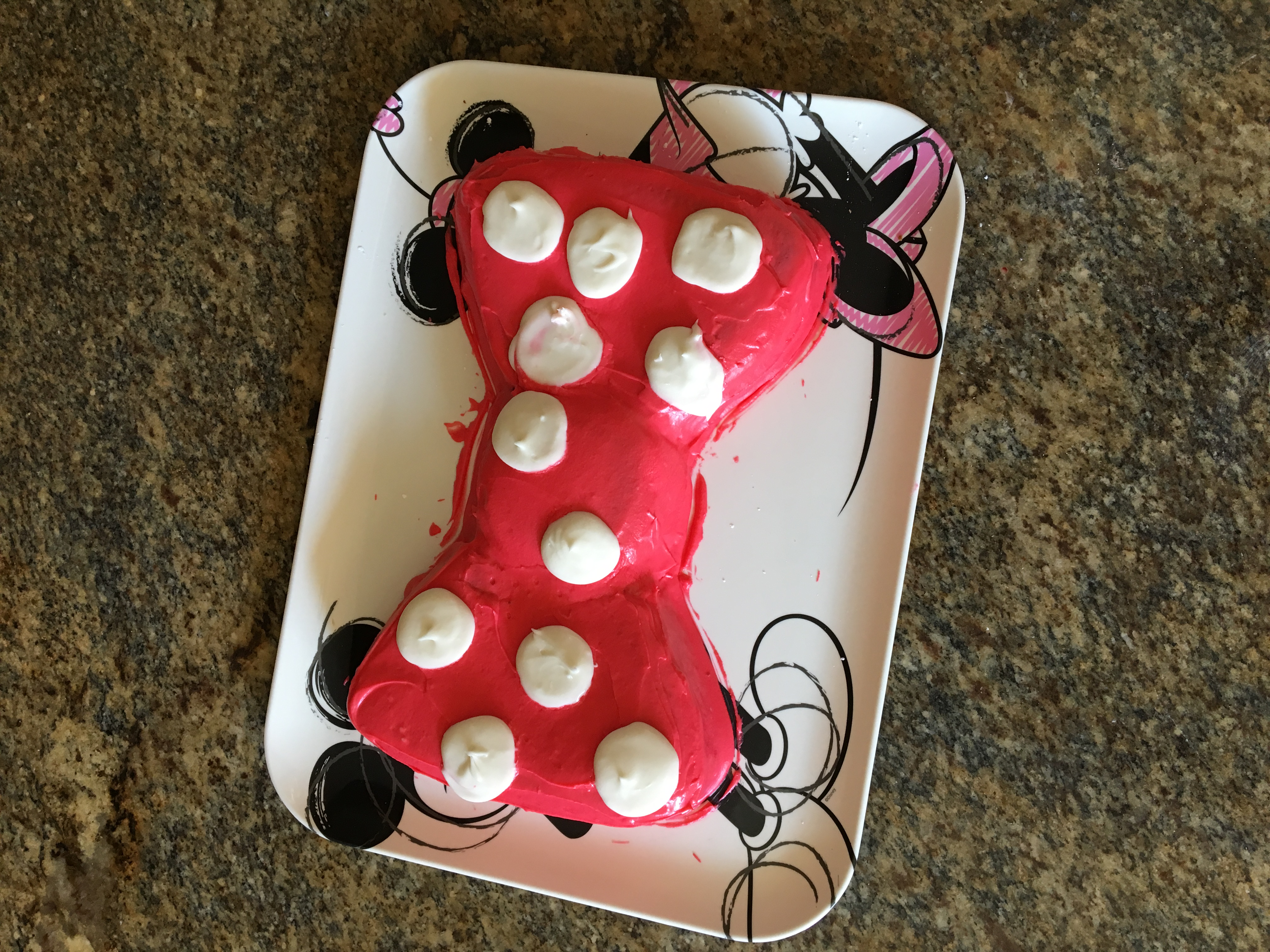 In honor of #RocktheDots and Minnie Mouse getting her star on the walk of fame (and National Polka Dot Day), I did something fun and made a Minnie Mouse bow cake, and wanted to share the recipe with you! Now, I am no professional baker by any means, and yes, I did use a box mix, but I made the frosting from scratch. It may not look perfect, but it was fun and delicious!