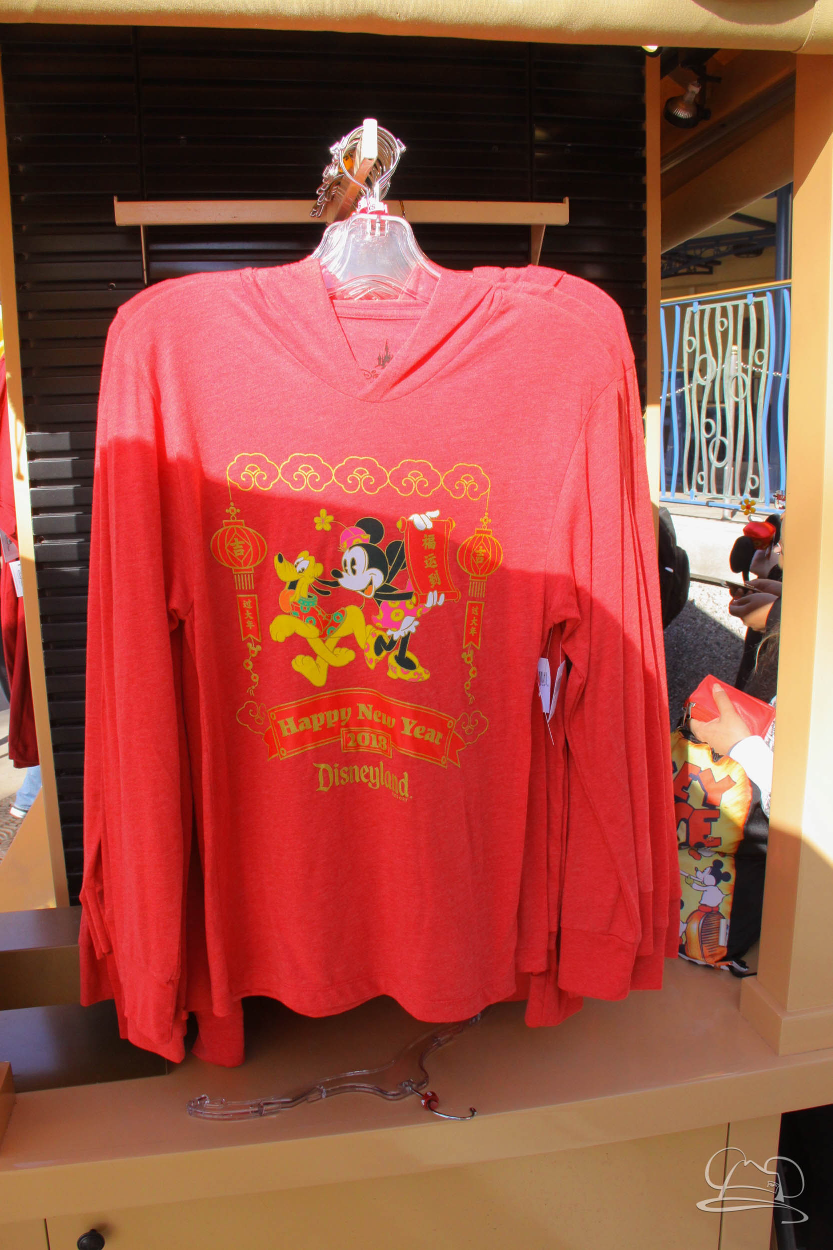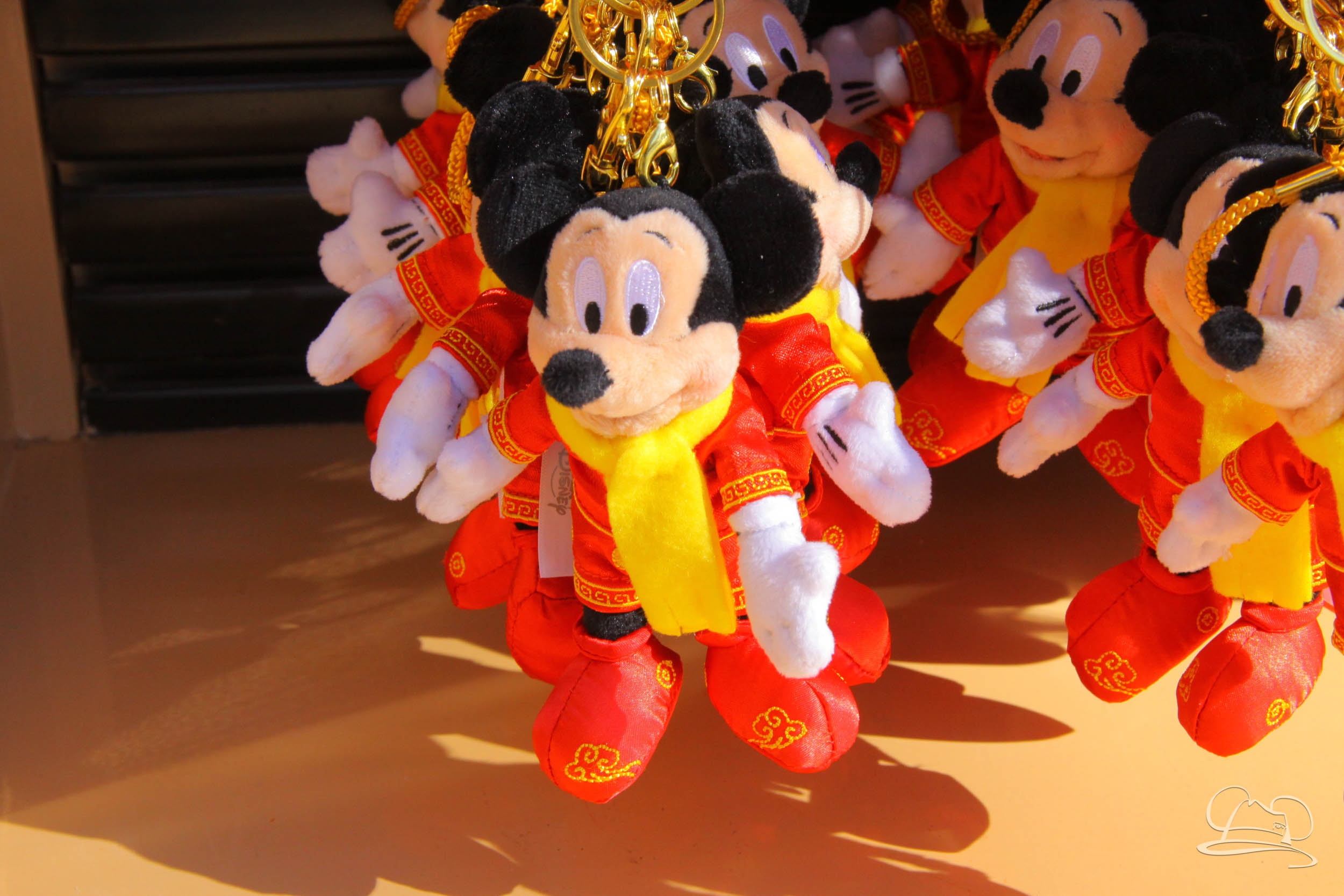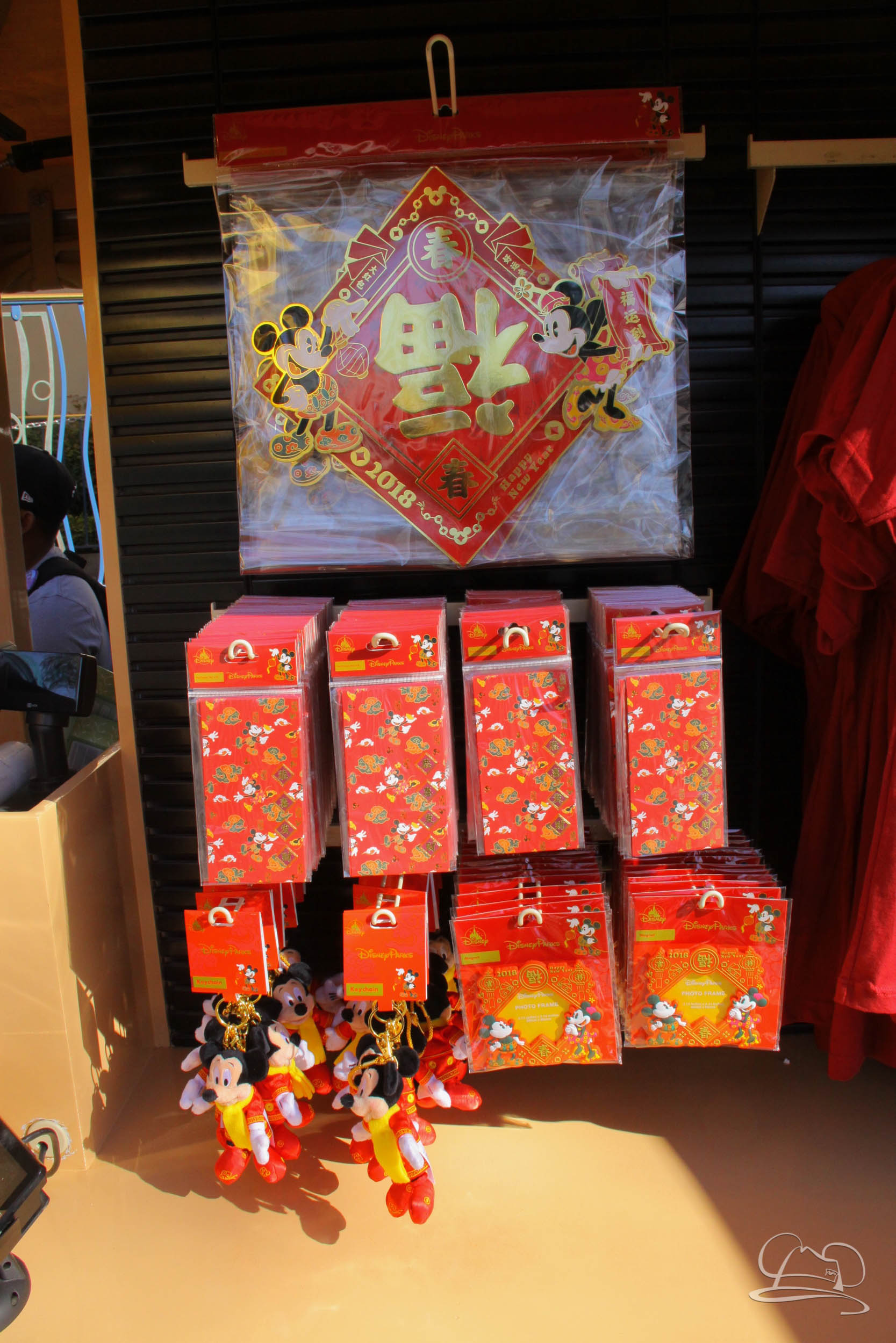 There is a fun collection of merchandise for sale to remember the Lunar New Year Festival. There are Minnie ears, clothes, a Mickey Mouse plush, a decorative headband, a door decoration, a photo frame, a festival snow globe, and traditional red envelopes. The red envelopes appeared to be one of the more popular offerings and were seen being carried around by a lot of people.