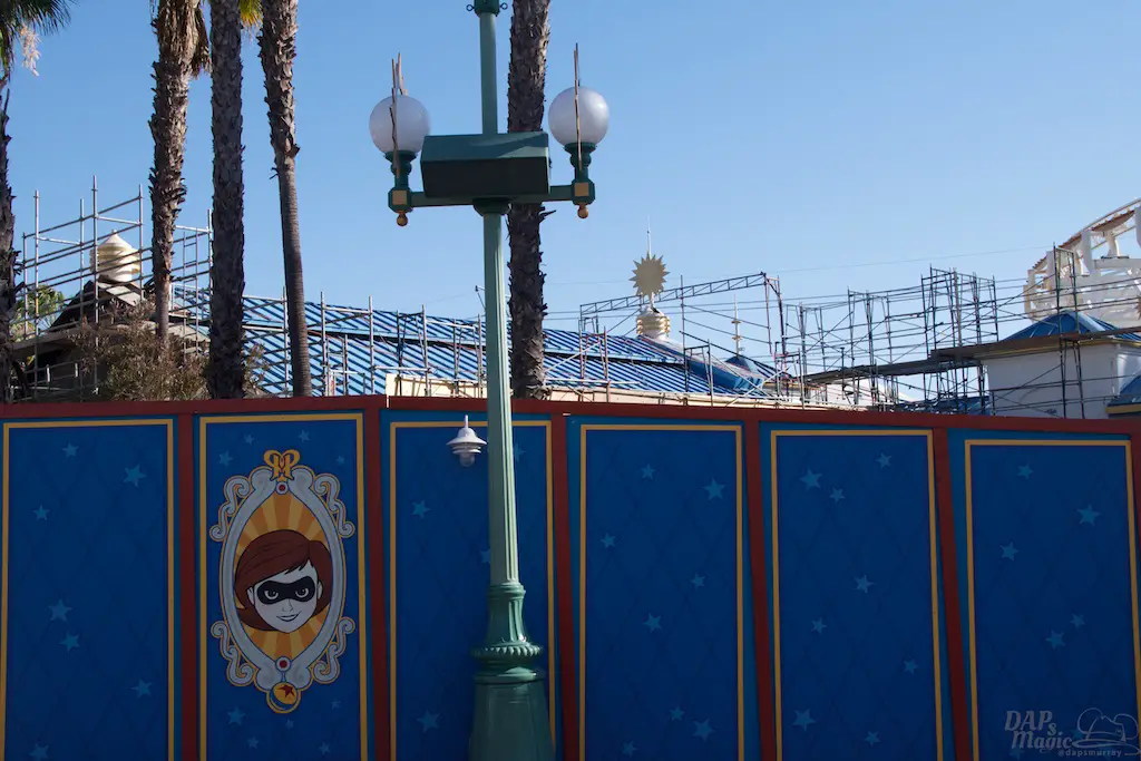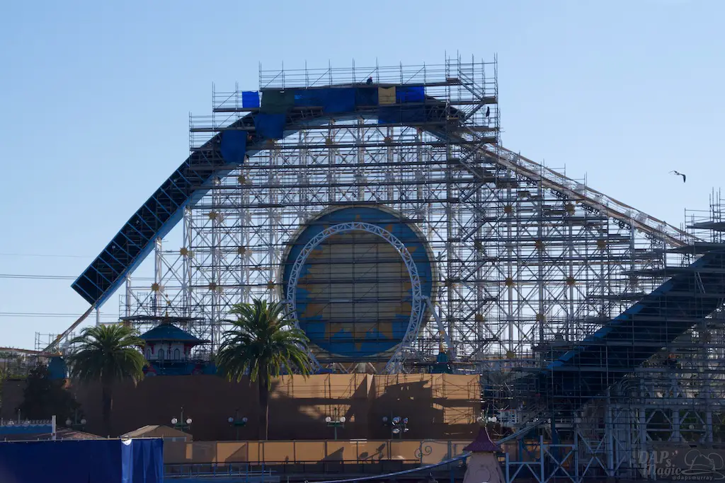 Disney California Adventure still has a lot of construction over at Pixar/Paradise Pier. Lots of scaffolding. California Screamin’ remnants are disappearing more and more. New color for the roofs of Toy Story Mania has appeared. Recently it’s been announced Pixar Pier will open June 23, but there is quite a lot to go.