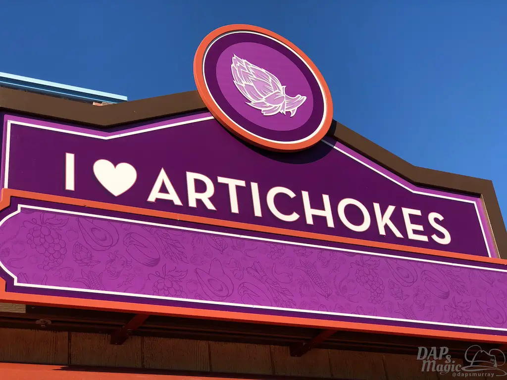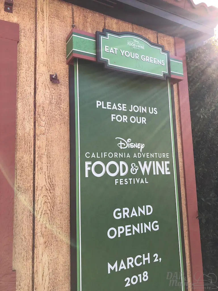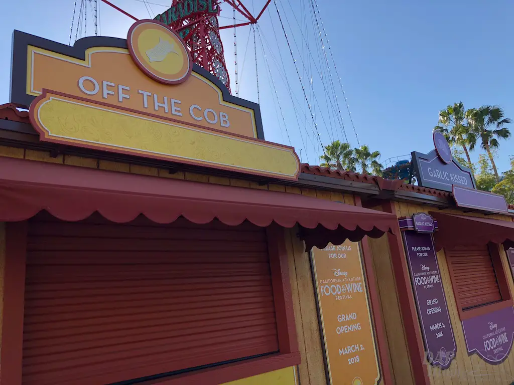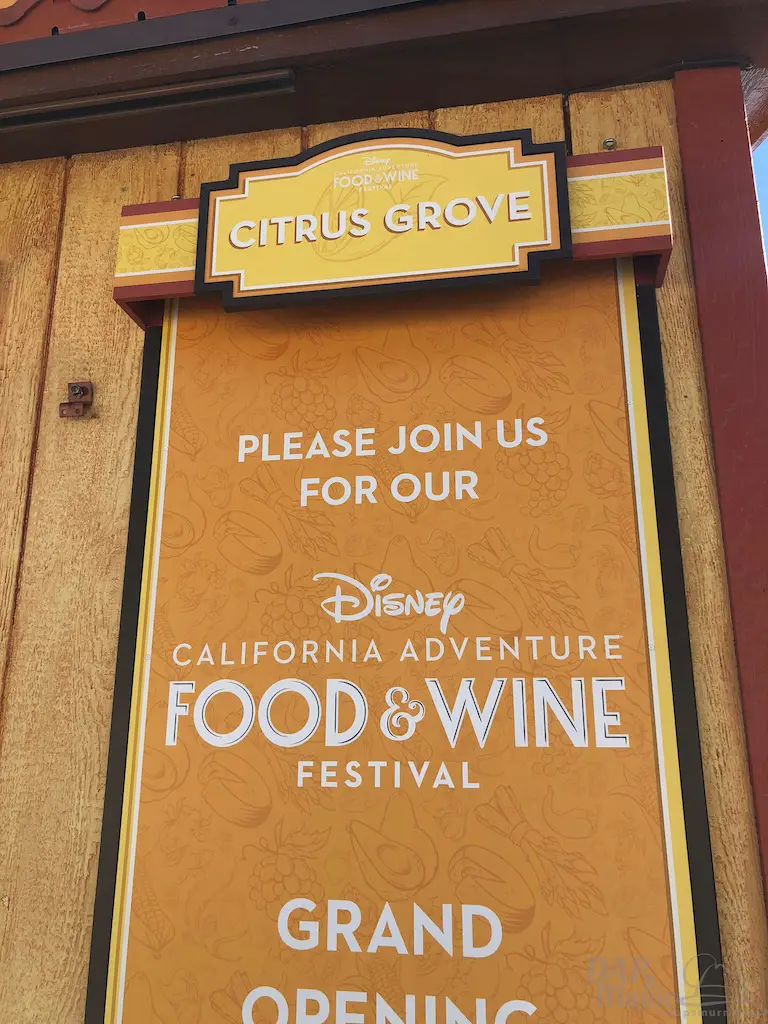 The Food and Wine festival at DCA is almost here! The booth kiosks are up but closed up as it’s not quite time to open. Here’s a look at all the names of them. Note that LA Style is in Hollywoodland again, and there’s a little Hidden Mickey in its icon.