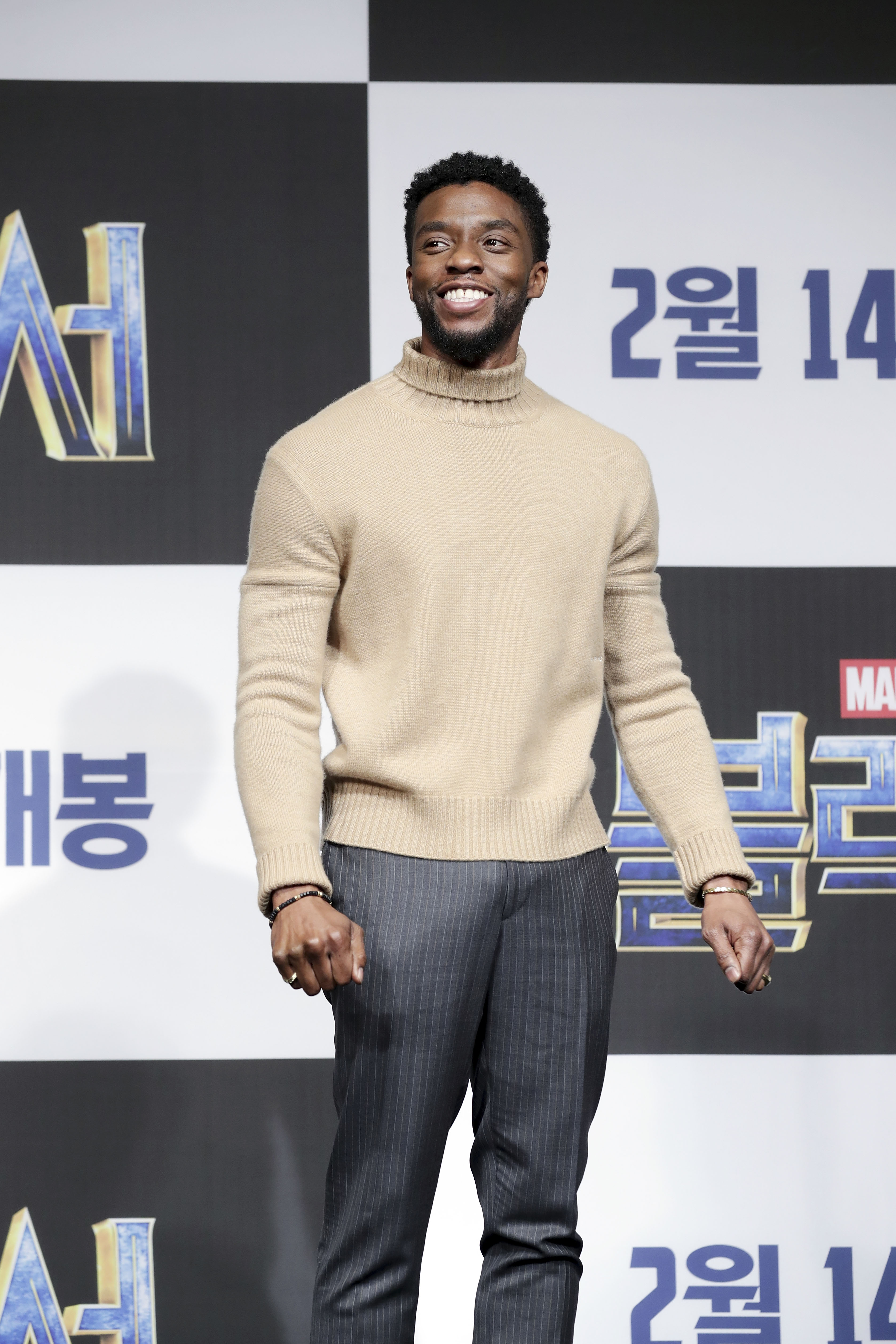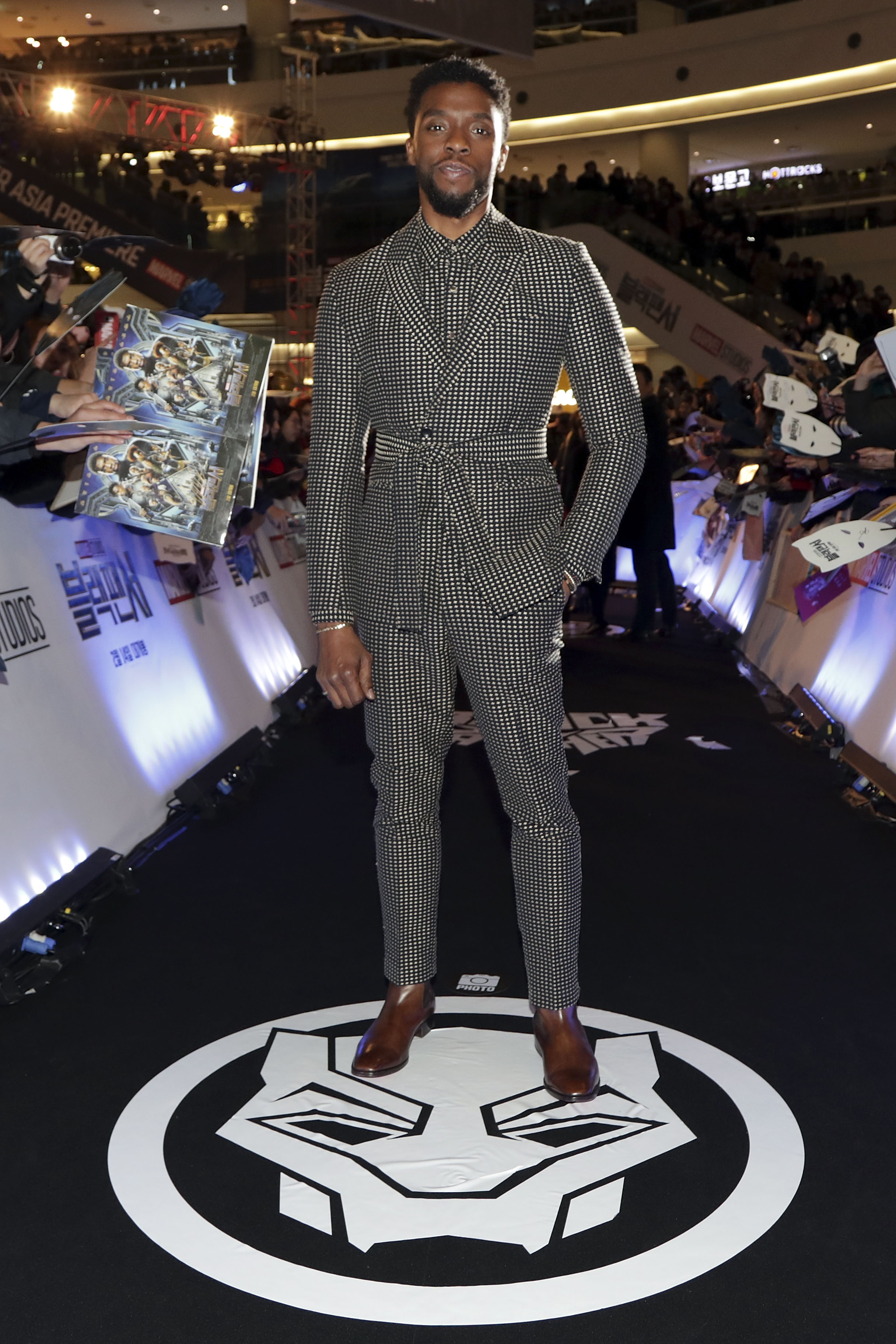 SEOUL, SOUTH KOREA – FEBRUARY 05: Actor Chadwick Boseman(center) takes part in the red carpet event for the Seoul premiere of ‘Black Panther’ on February 5, 2018 in Seoul, South Korea. (Photo by Han Myung-Gu/Getty Images for Disney) *** Local Caption *** Chadwick Boseman