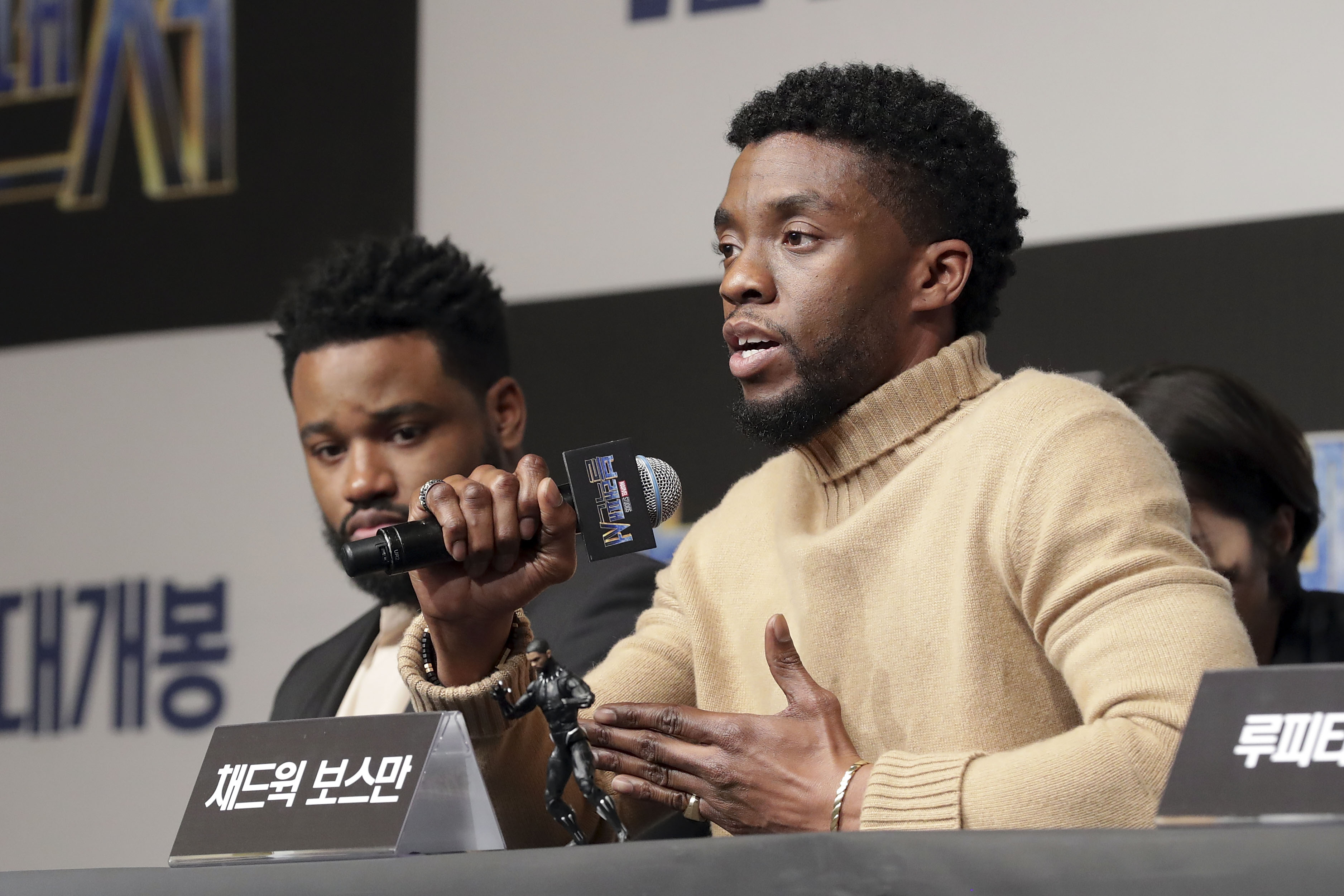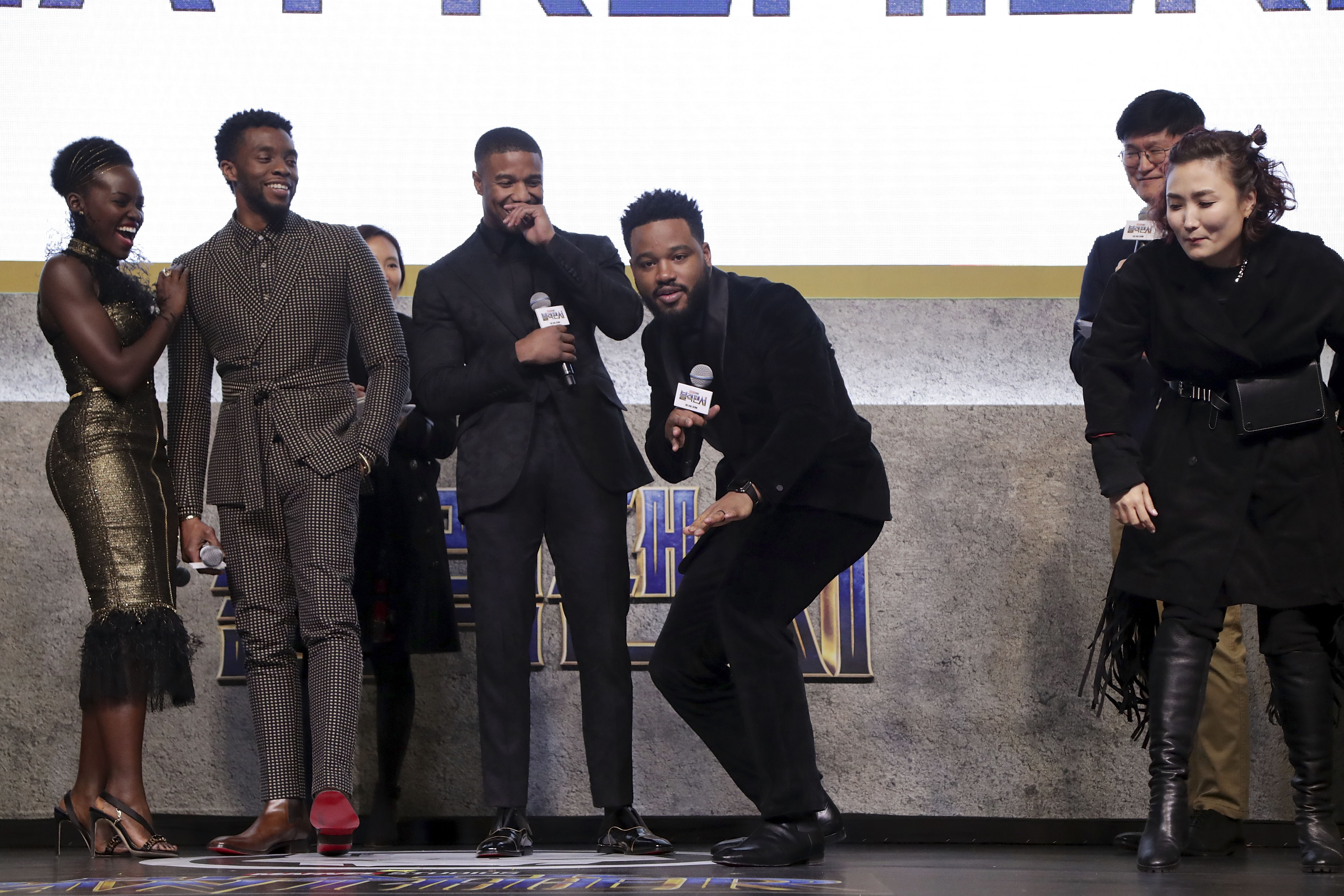 SEOUL, SOUTH KOREA – FEBRUARY 05: Director Ryan Coogler, Actor Chadwick Boseman, Lupita NyongÕo and Michael B. Jordan(from L to R) attend the press conference for the Seoul premiere of ‘Black Panther’ on February 5, 2018 in Seoul, South Korea. (Photo by Han Myung-Gu/Getty Images for Disney) *** Local Caption *** Ryan Coogler; Actor Chadwick Boseman; Lupita NyongÕo; Michael B. Jordan