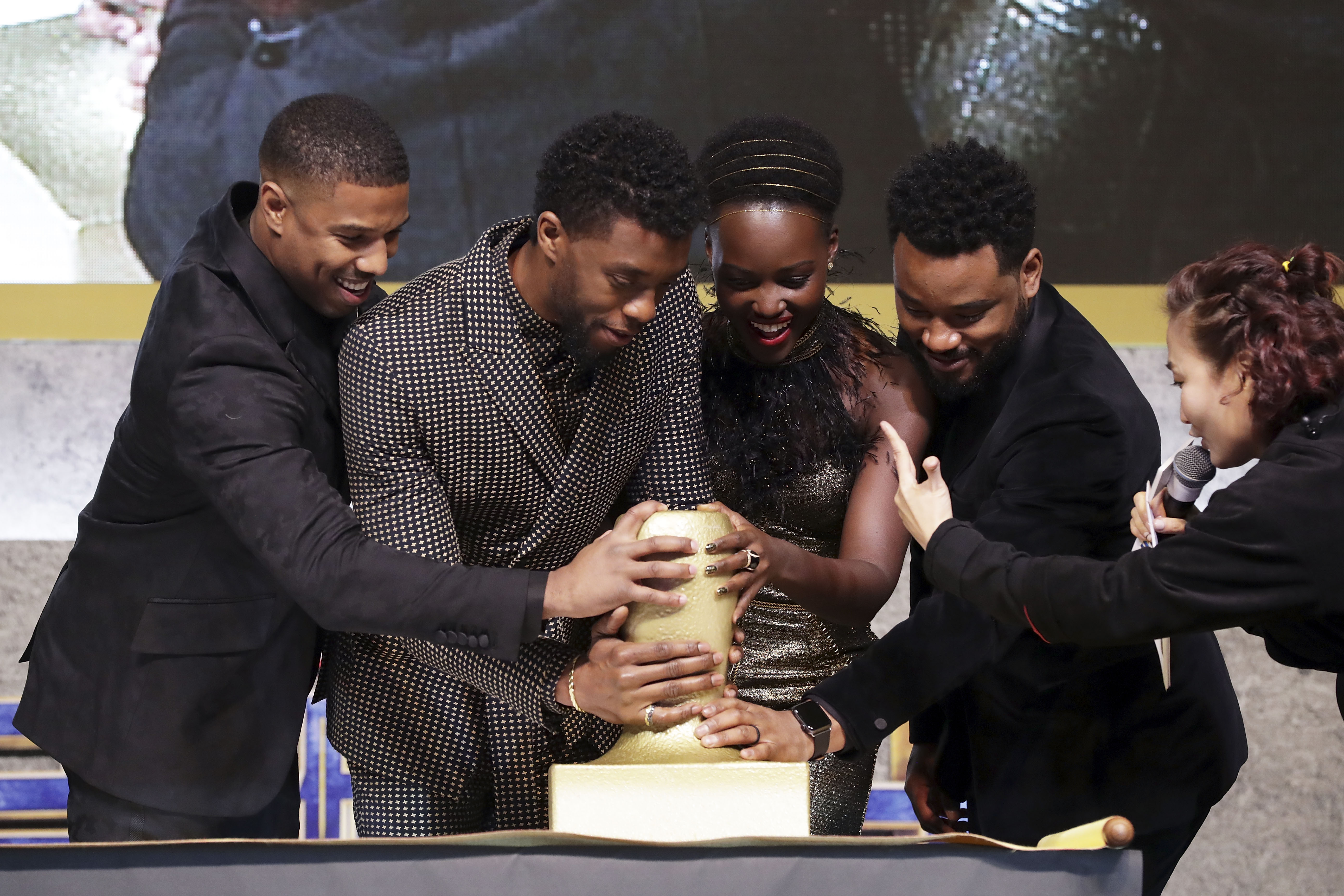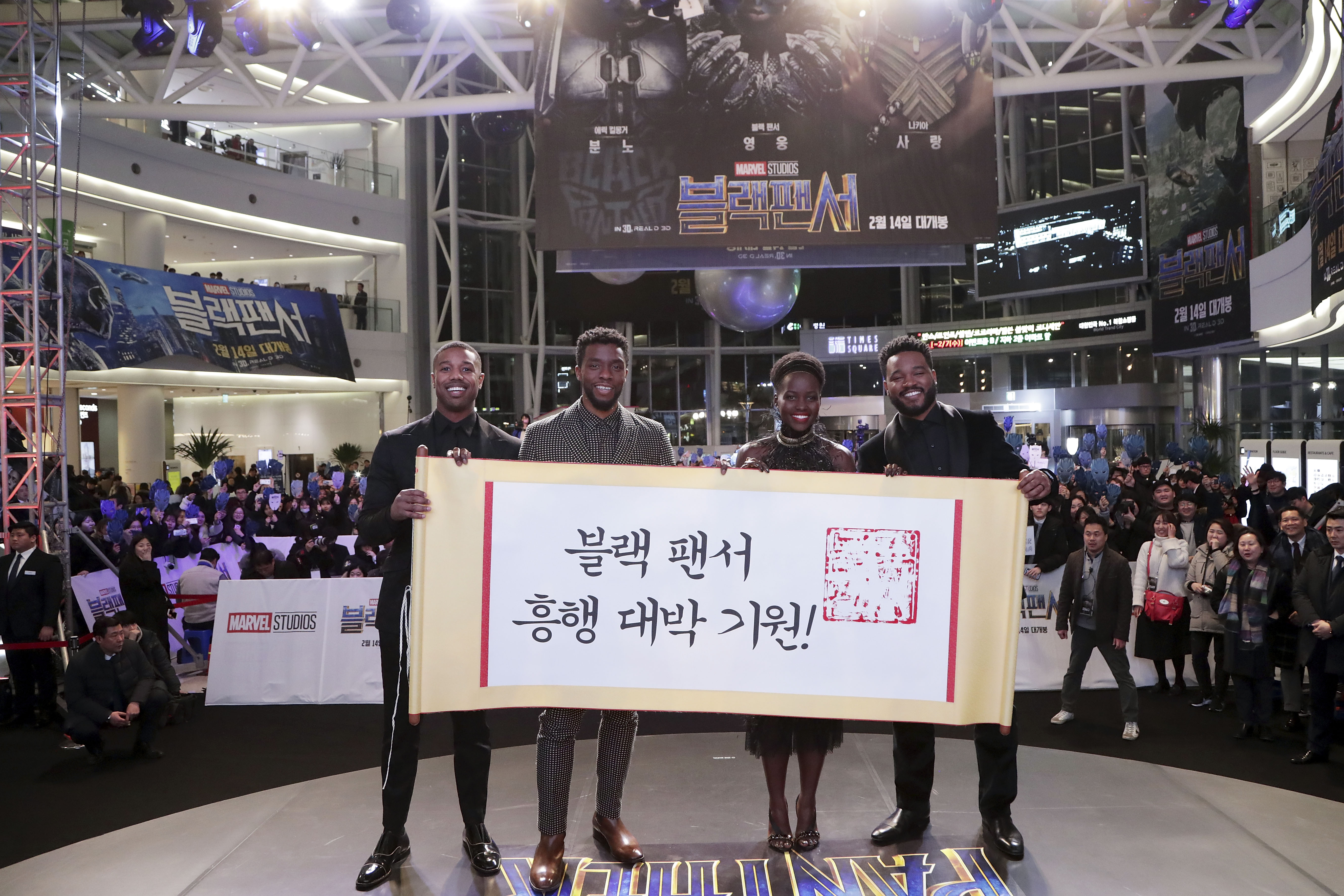 SEOUL, SOUTH KOREA – FEBRUARY 05: Actor Michael B. Jordan, Lupita Nyong’o, Chadwick Boseman and director Ryan Coogler(Left to Right) hold placard wishing the success of the movie in the red carpet event for the Seoul premiere of ‘Black Panther’ on February 5, 2018 in Seoul, South Korea. (Photo by Han Myung-Gu/Getty Images for Disney) *** Local Caption *** Michael B. Jordan; Lupita Nyong’o; Chadwick Boseman; Ryan Coogler