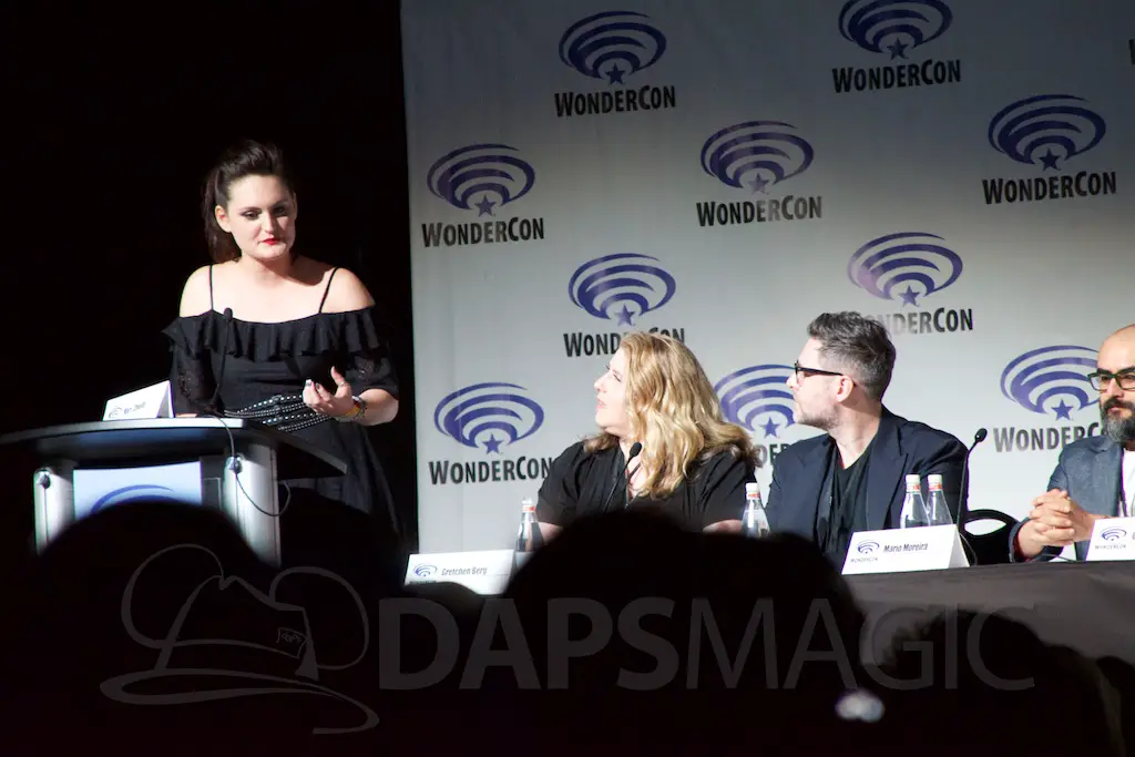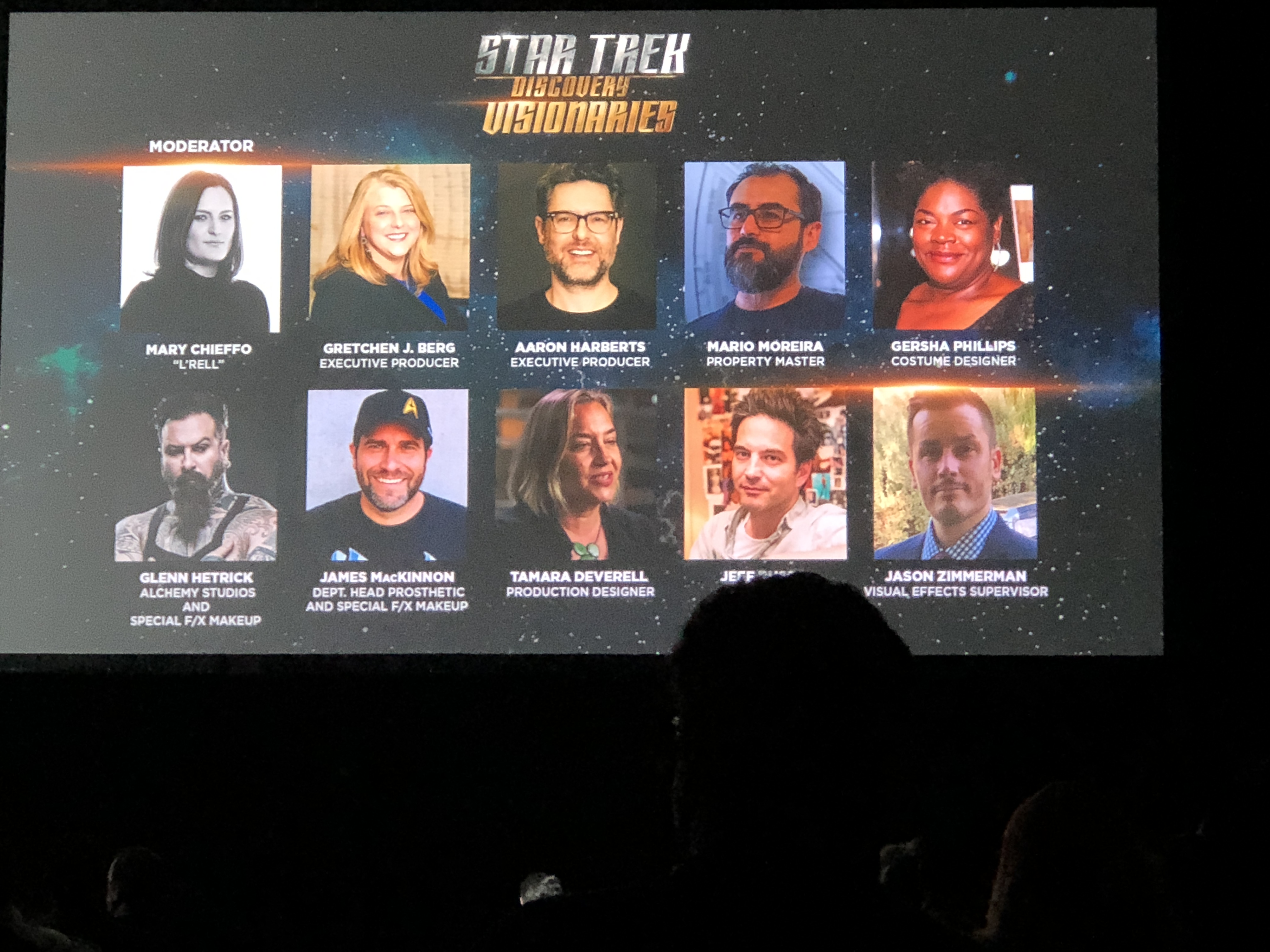 Mary Chieffo, who played L’Rell, moderated the panel of visionaries who have shaped the new Star Trek series. The Executive Producers, Gretchen Berg, and Aaron Harberts headed up the group. Mario Moreira – property master, Gersha Phillips – costume designer, Glenn Hetrick – special f/x makeup, James MacKinnon – head of prosthetic and special f/x makeup, Tamara Deverell – production designer, Jeff Russo – composer, and Jason Zimmerman – visual effects supervisor rounded out the panel.