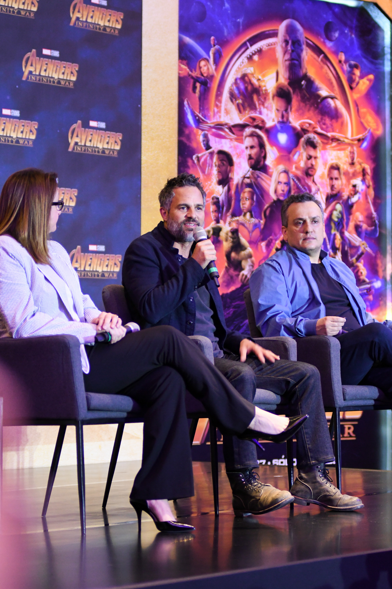 Victoria Alonso (Executive Producer), Mark Ruffalo (Bruce Banner/Hulk) and Joe Russo (Director) of Avengers: Infinity War at the press conference in Mexico City.