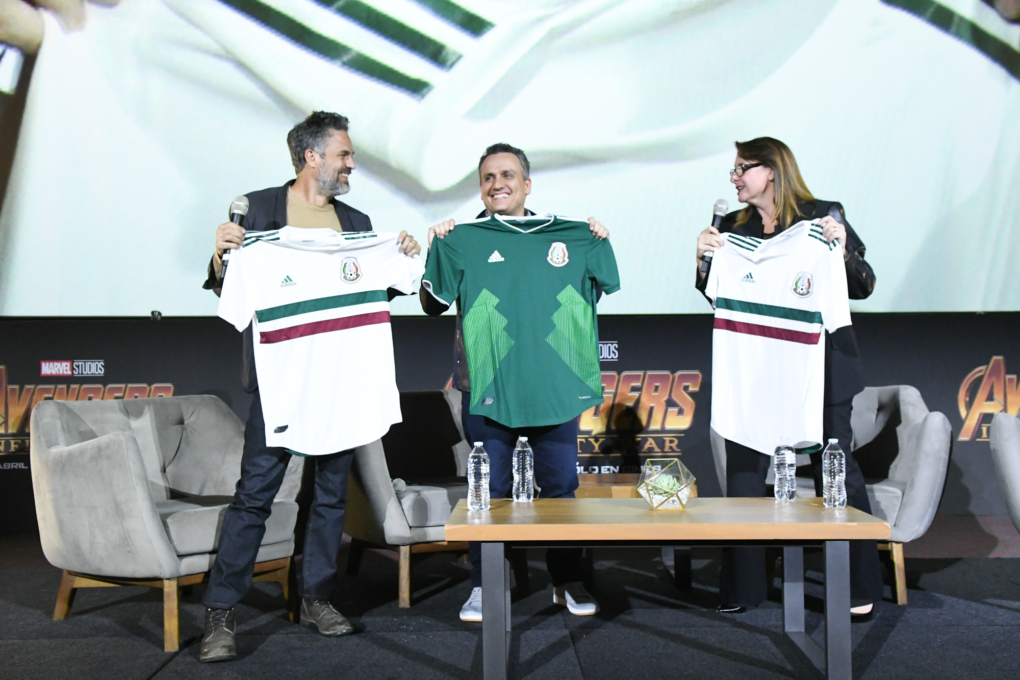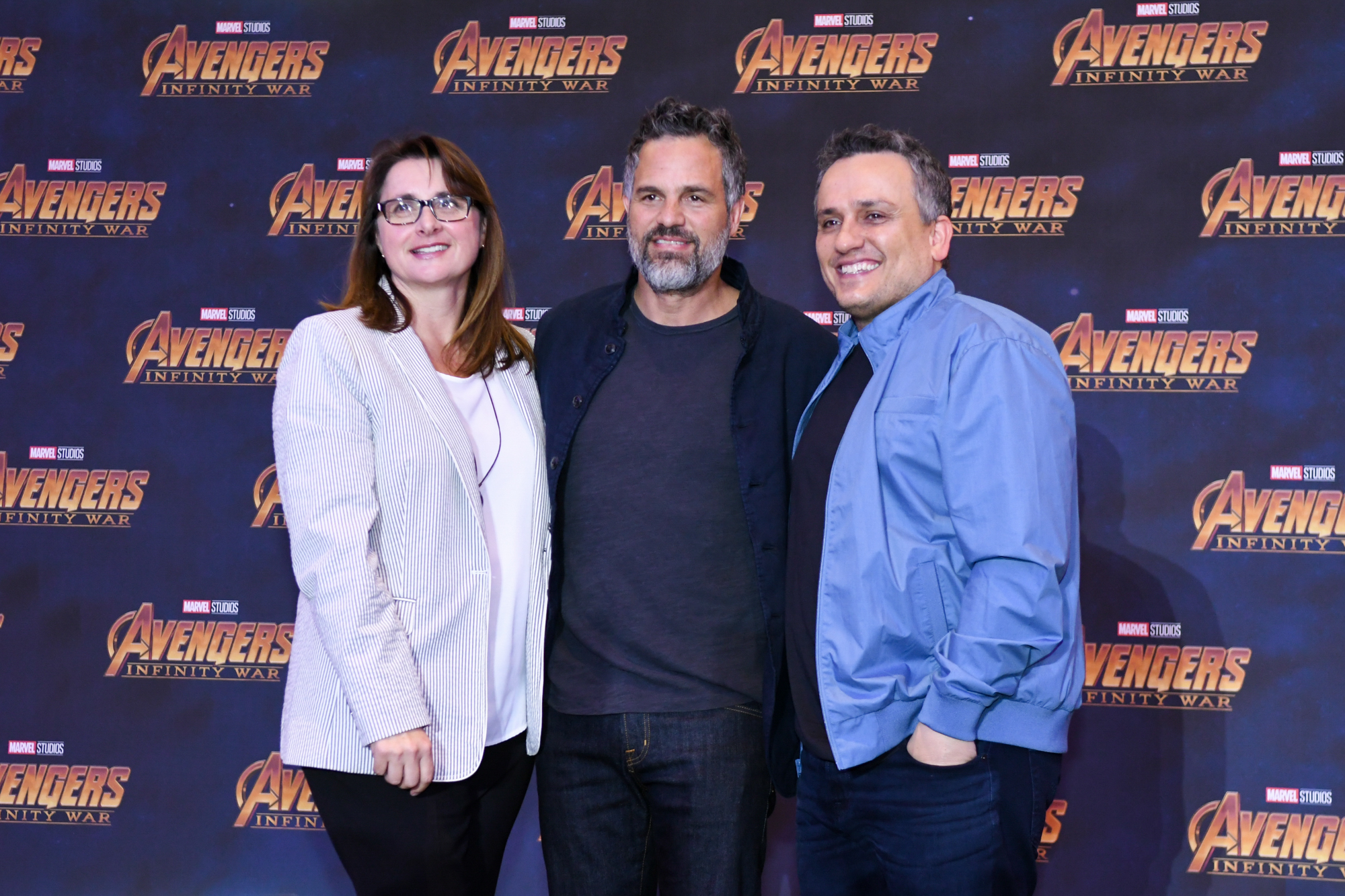 Mark Ruffalo (Bruce Banner/Hulk), Joe Russo (Director), and Victoria Alonso (Executive Producer) attend the Avengers: Infinity War fan event in Mexico City.