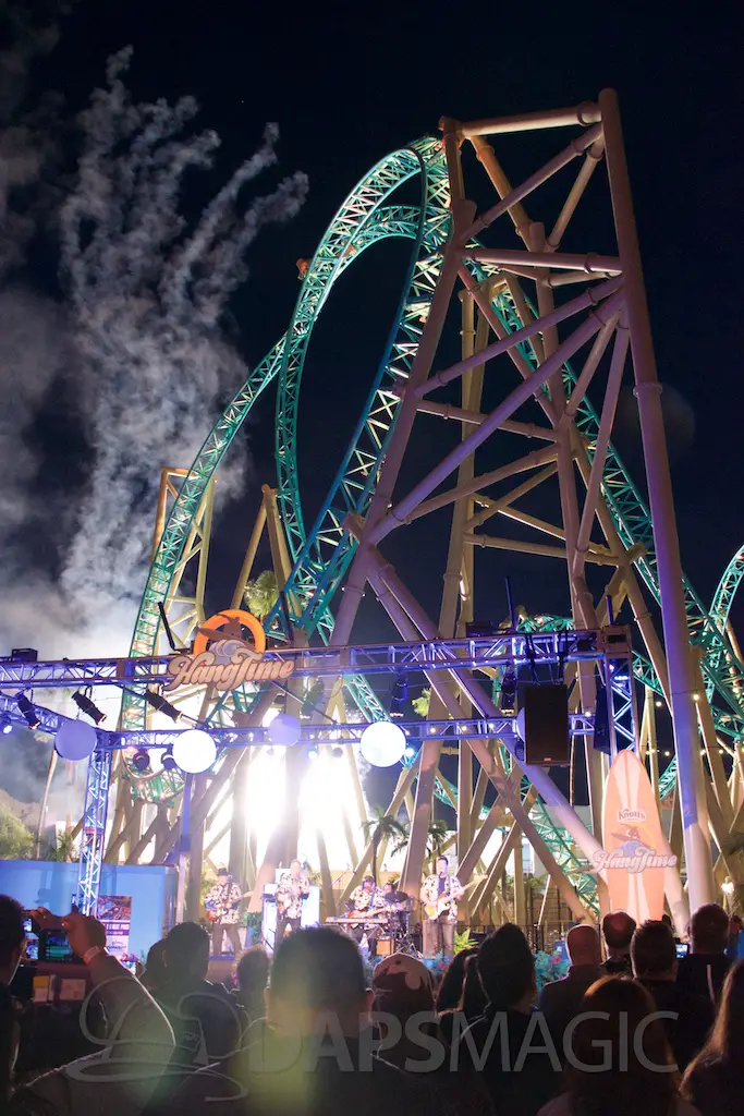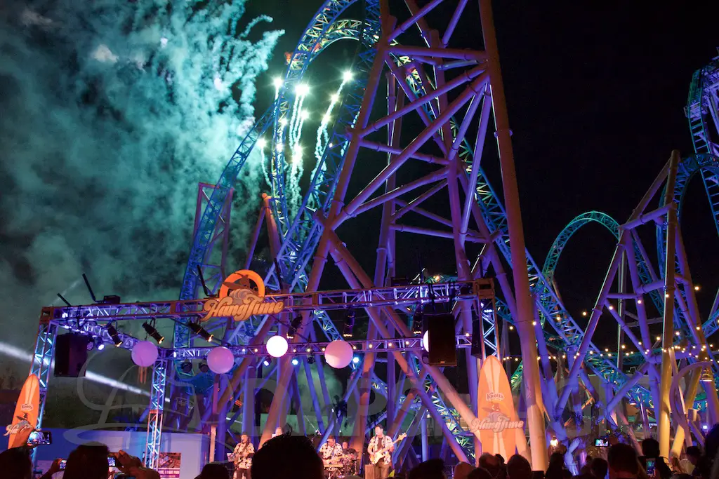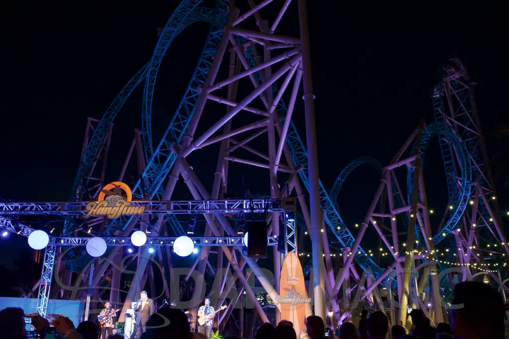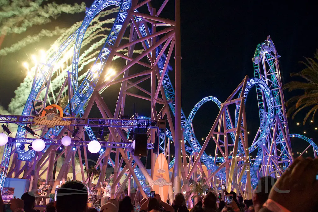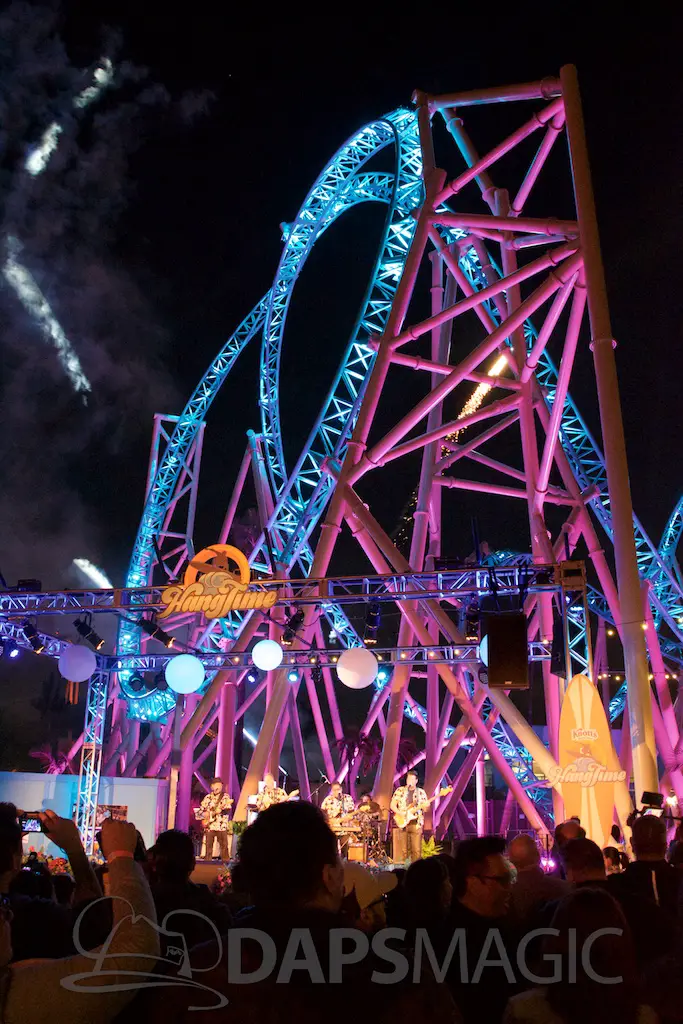 Announcements given as to what else is coming to Knott’s in the summer were given, and we’ll have those later on. After that, the band Ride the Tide played some surf tunes as the coaster cars started traveling through the track. In the background were great fireworks set off to give an explosive beginning to a great ride.