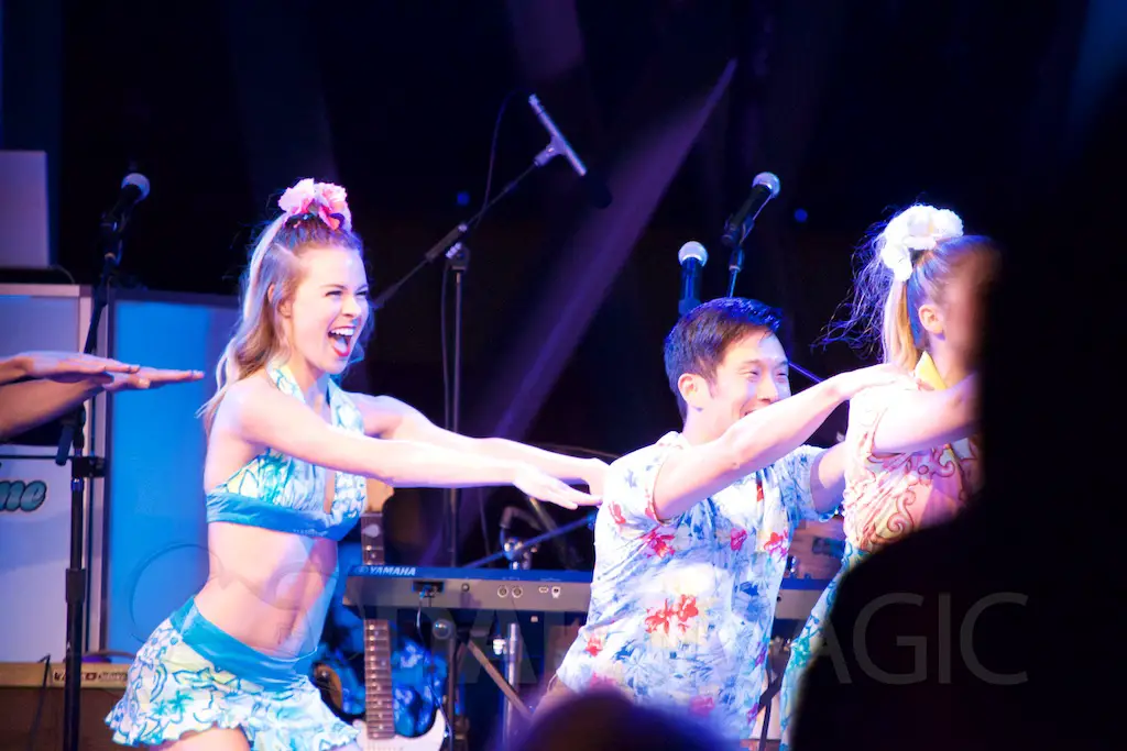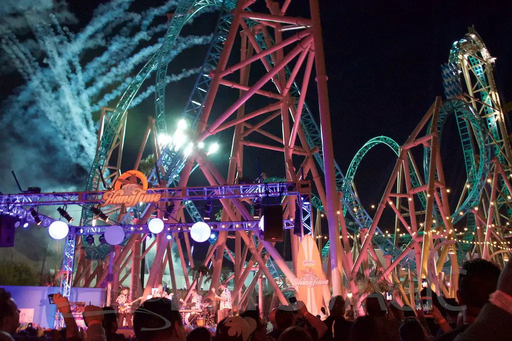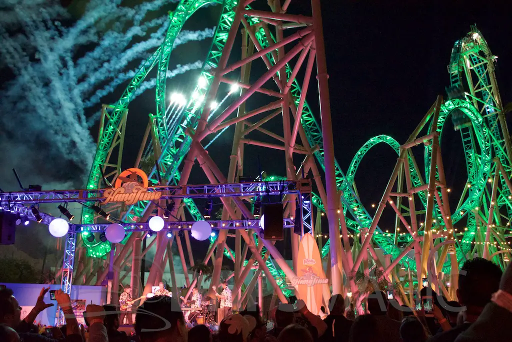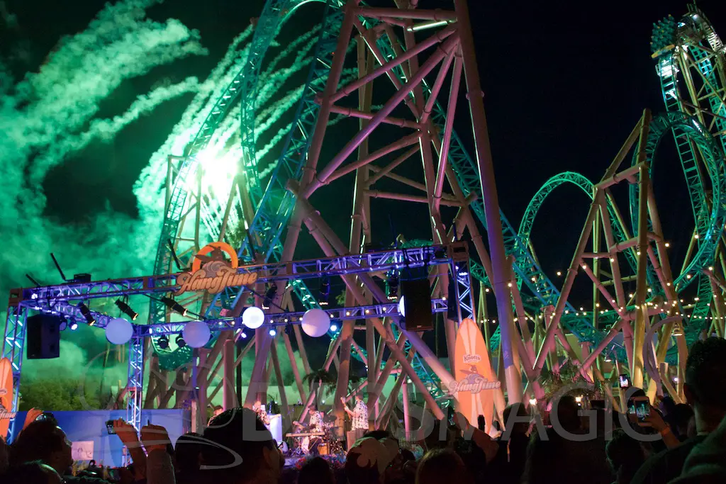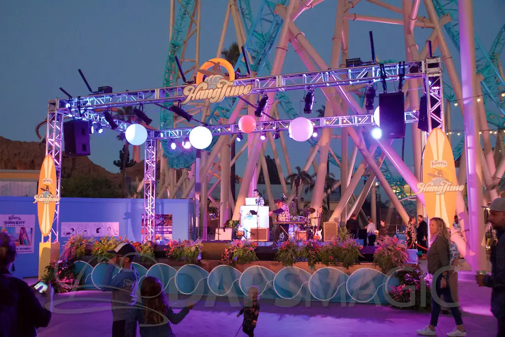 Announcements given as to what else is coming to Knott’s in the summer were given, and we’ll have those later on. After that, the band Ride the Tide played some surf tunes as the coaster cars started traveling through the track. In the background were great fireworks set off to give an explosive beginning to a great ride.