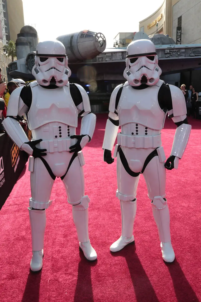 Stormtroopers attend the world premiere of “Solo: A Star Wars Story” in Hollywood on May 10, 2018.