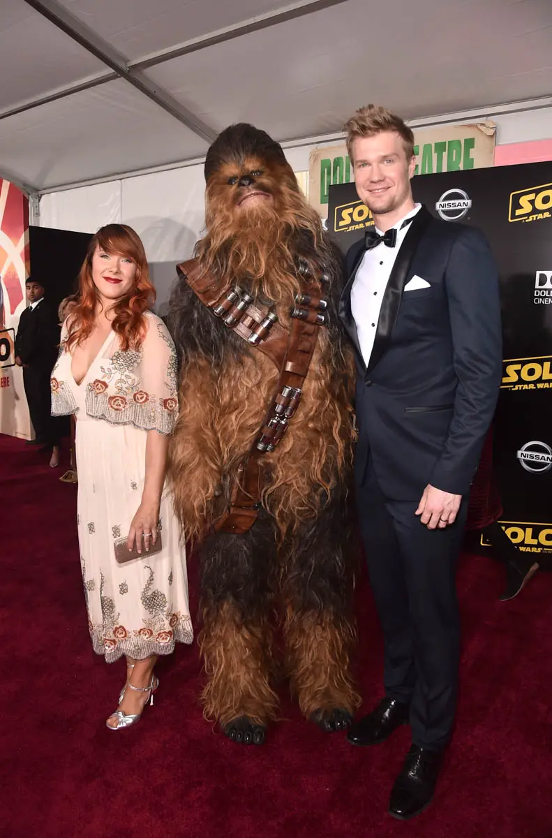 HOLLYWOOD, CA – MAY 10: Milla Pohjasvaara (L) and Actor Joonas Suotamo pose with Chewbacca at the world premiere of ìSolo: A Star Wars Storyî in Hollywood on May 10, 2018. (Photo by Alberto E. Rodriguez/Getty Images for Disney) *** Local Caption *** Milla Pohjasvaara; Joonas Suotamo