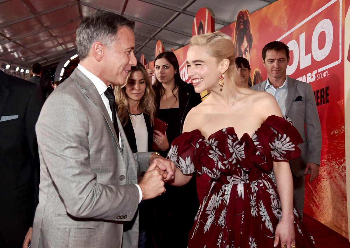 HOLLYWOOD, CA – MAY 10: President, Marketing, The Walt Disney Studios, Ricky Strauss (L) and actor Emilia Clarke attend the world premiere of ìSolo: A Star Wars Storyî in Hollywood on May 10, 2018. (Photo by Alberto E. Rodriguez/Getty Images for Disney) *** Local Caption *** Ricky Strauss; Emilia Clarke