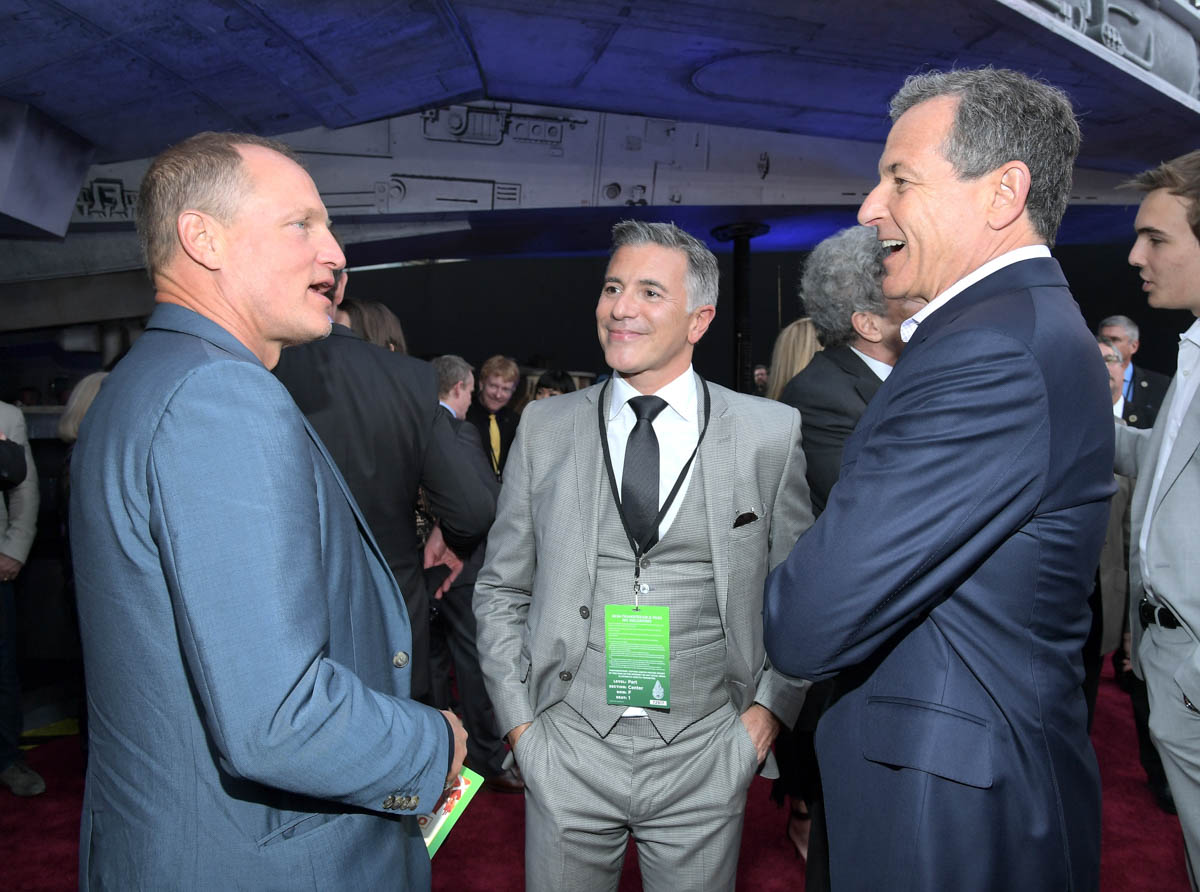 HOLLYWOOD, CA – MAY 10: (L-R) Actor Woody Harrelson, President, Marketing, The Walt Disney Studios, Ricky Strauss, and The Walt Disney Company Chairman and CEO Bob Iger attend the world premiere of ìSolo: A Star Wars Storyî in Hollywood on May 10, 2018. (Photo by Charley Gallay/Getty Images for Disney) *** Local Caption *** Bob Iger; Ricky Strauss; Woody Harrelson