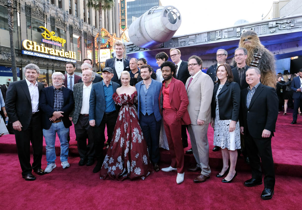 HOLLYWOOD, CA – MAY 10: Cast and crew of “Solo: A Star Wars Story” attend the world premiere of ìSolo: A Star Wars Storyî in Hollywood on May 10, 2018. (Photo by Alberto E. Rodriguez/Getty Images for Disney) *** Local Caption *** Alan Horn; George Lucas; Clint Howard; Jonathan Kasdan; John Powell; John Williams; Joonas Suotamo; Ron Howard; Woody Harrelson; Emilia Clarke; Thandie Newton; Phoebe Waller-Bridge; Alden Ehrenreich; Donald Glover; Paul Bettany; Jon Favreau; Kathleen Kennedy; Simon Emanuel; Jason McGatlin; Alan Bergman