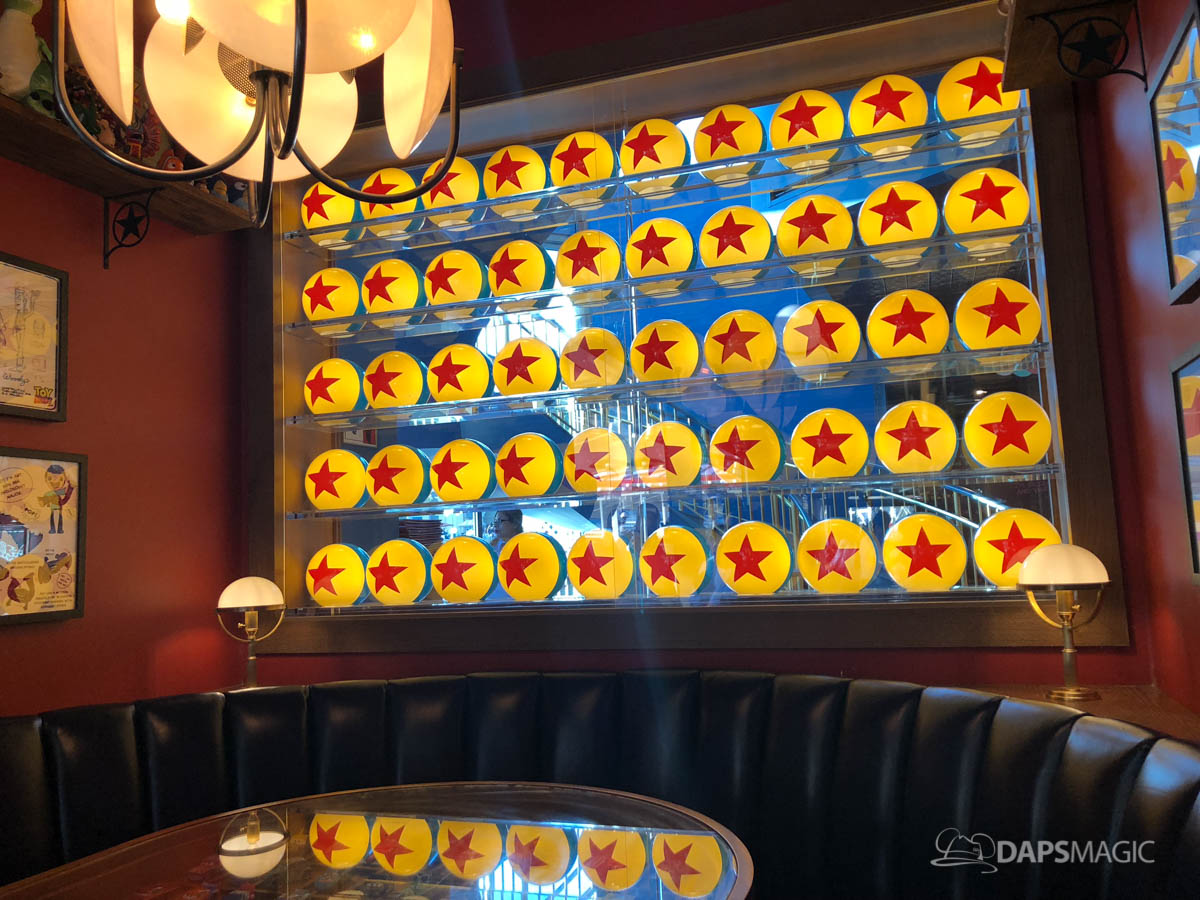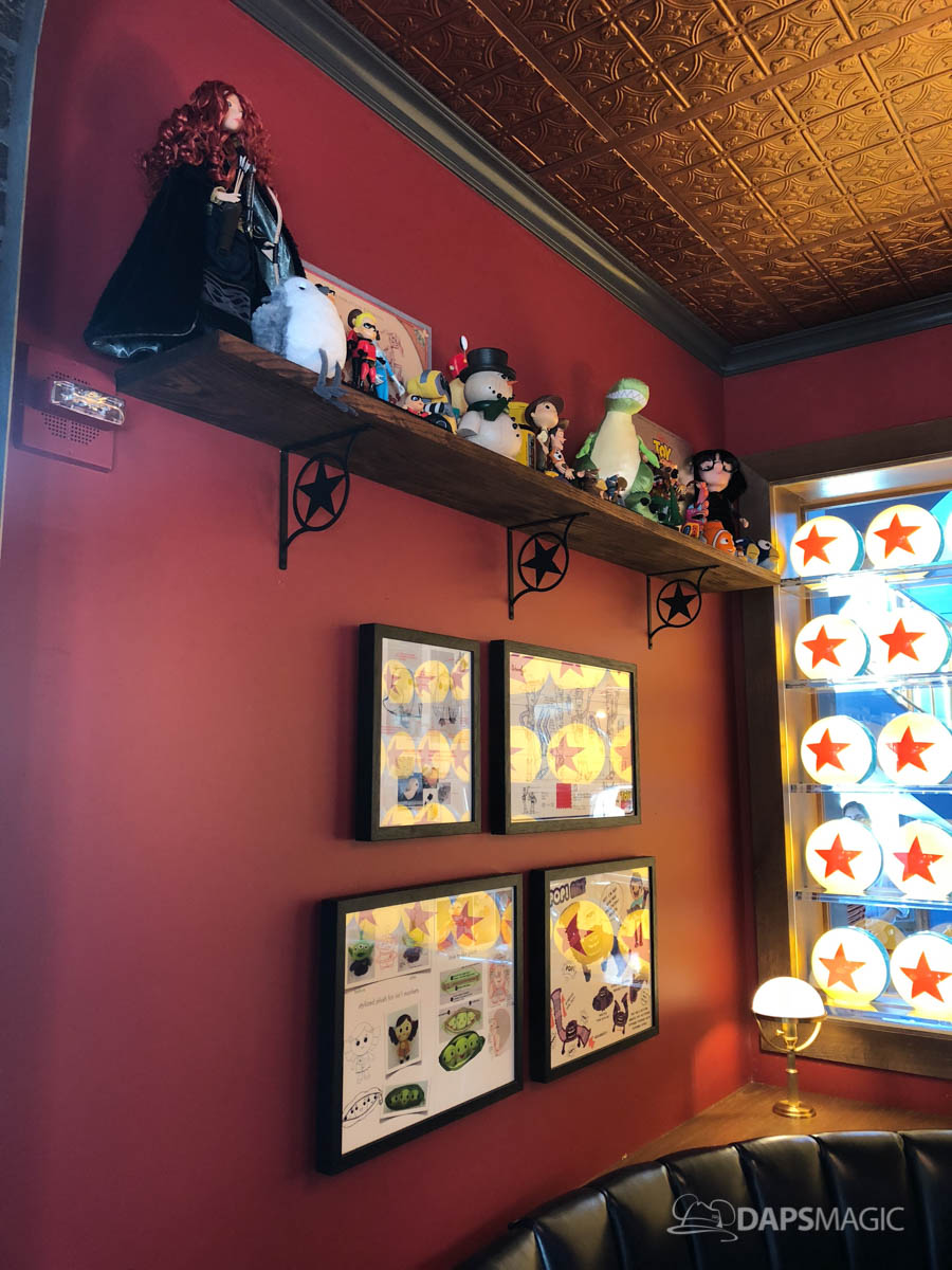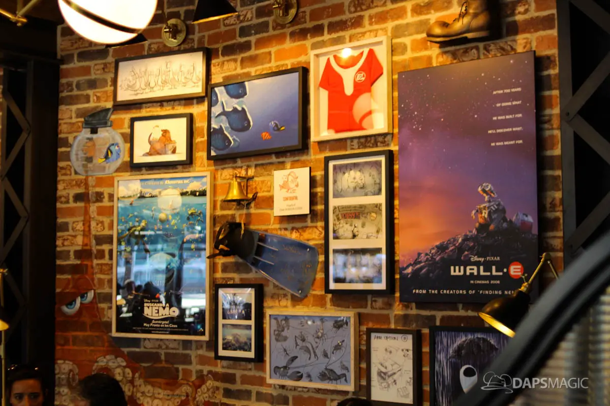 The restaurant itself is full of art and details that are fun to discover. Visit again and again and most likely new things will be discovered each time! Stroll around Lamplight Lounge and discover fun artifacts, artwork, drawings, quotes and more! There are seven Pixar facts celebrated at the restaurant that has been shared by the Disneyland Resort that DAPS MAGIC will highlight today.