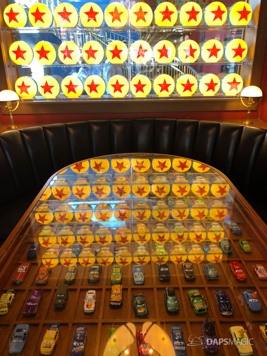 - Every toy has a story at Pixar. Right above the Cars dining table, there are some toys on display. These are from the archives at Pixar. Underneath the shelves notes can be found. These showcase the process that happens between Pixar and the toy creators to ensure that the toys are as accurate as possible. Generally, each toy goes through multiple rounds of notes. This can include drawings, creative reviews, and video conferences in the quest to create the best toys possible!