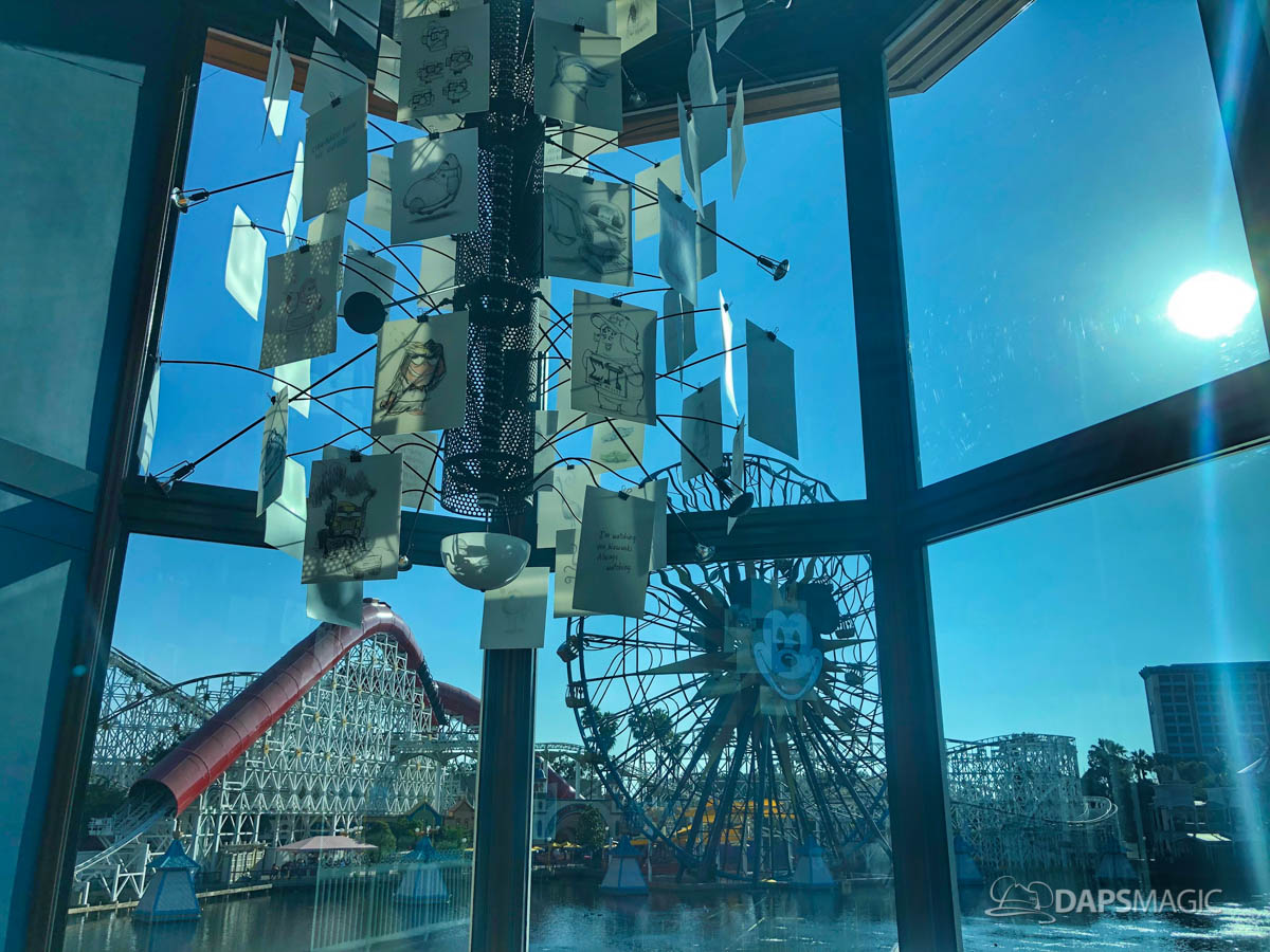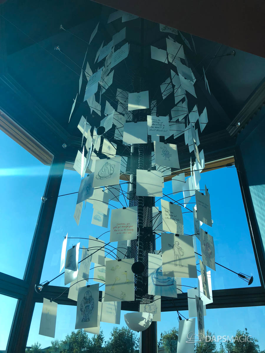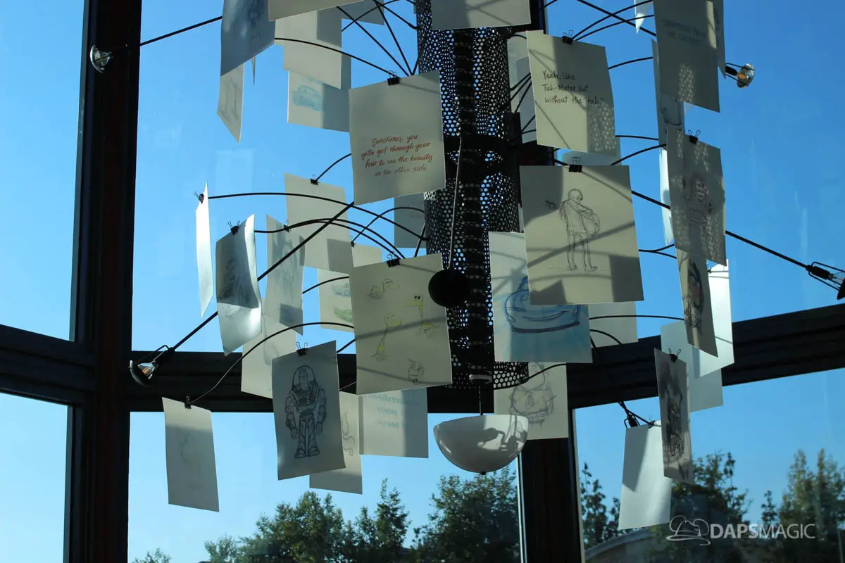 - Early sketch artwork is celebrated by Pixar. Artwork can be found throughout Lamplight Lounge. From the moment one enters the restaurant, the importance of sketch artwork is apparent. A chandelier features prominently inside the main lobby. It is made of artwork and film quotes from many Pixar animated films. It features blank pages at the top and they get more developed as they progress downward. This represents the creative process. This is something worth seeing when visiting Pixar Pier, even if just peeking in to take a look!