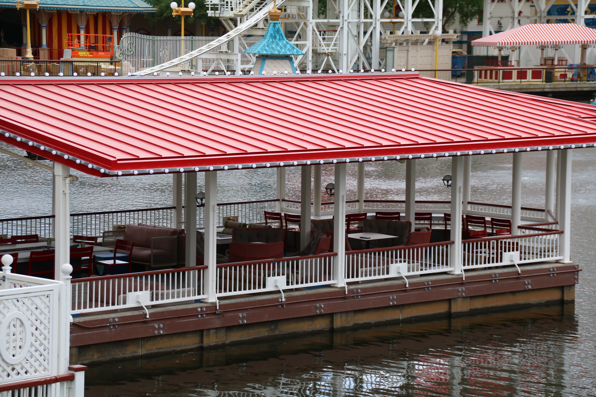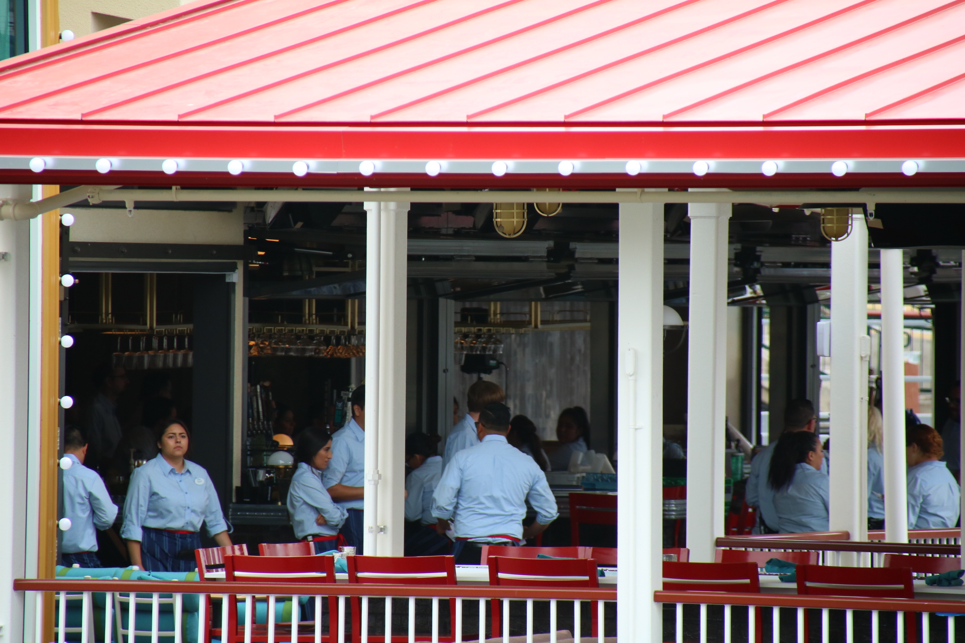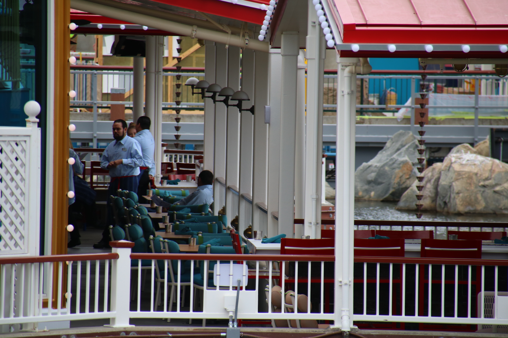 The Incredicoaster and Pixar Pal-A-Round were both testing, while training was happening for Cast Members at the Lamplight Lounge. I was able to get photos of the chandelier in the entry for the Lamplight Lounge, and it’s going to be a favorite feature of many, from what I could see. It features concept art of Pixar characters, as well as quotes, reminiscent of the chandelier in the Art of Animation Resort lobby in Walt Disney World. New couches, lounge chairs, and fire pits are ready for guests on the patio area of the lounge, and the outdoor bar area as well. The only thing that didn’t seem to have changed at all was the former Cove Bar dining location, the old signs were still on the walls. Time will tell if that area of the restaurant opens right away.