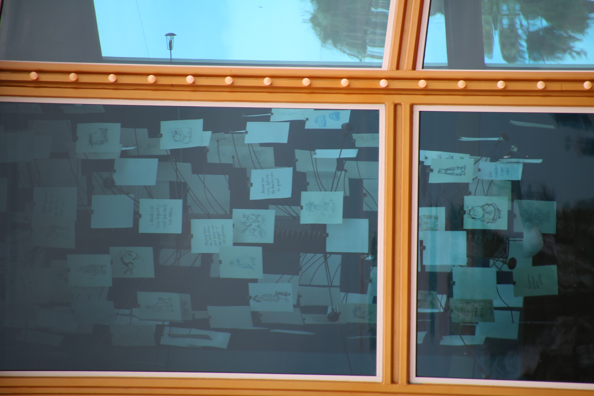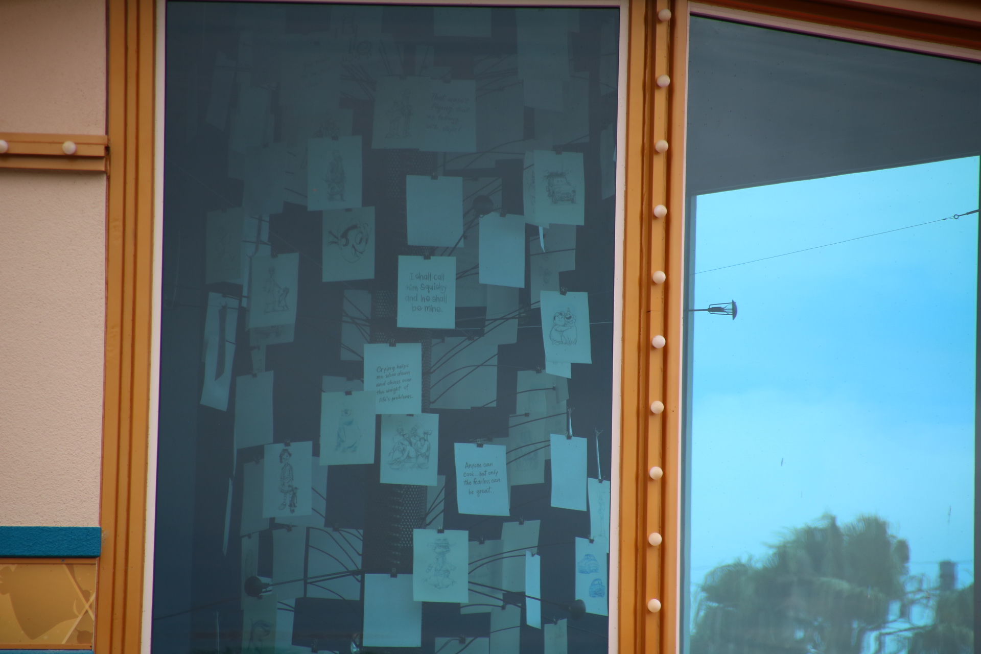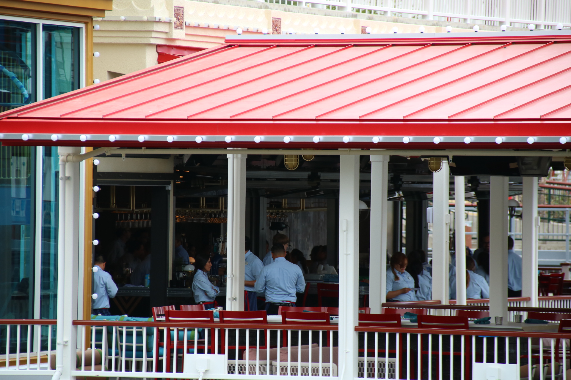 The Incredicoaster and Pixar Pal-A-Round were both testing, while training was happening for Cast Members at the Lamplight Lounge. I was able to get photos of the chandelier in the entry for the Lamplight Lounge, and it’s going to be a favorite feature of many, from what I could see. It features concept art of Pixar characters, as well as quotes, reminiscent of the chandelier in the Art of Animation Resort lobby in Walt Disney World. New couches, lounge chairs, and fire pits are ready for guests on the patio area of the lounge, and the outdoor bar area as well. The only thing that didn’t seem to have changed at all was the former Cove Bar dining location, the old signs were still on the walls. Time will tell if that area of the restaurant opens right away.