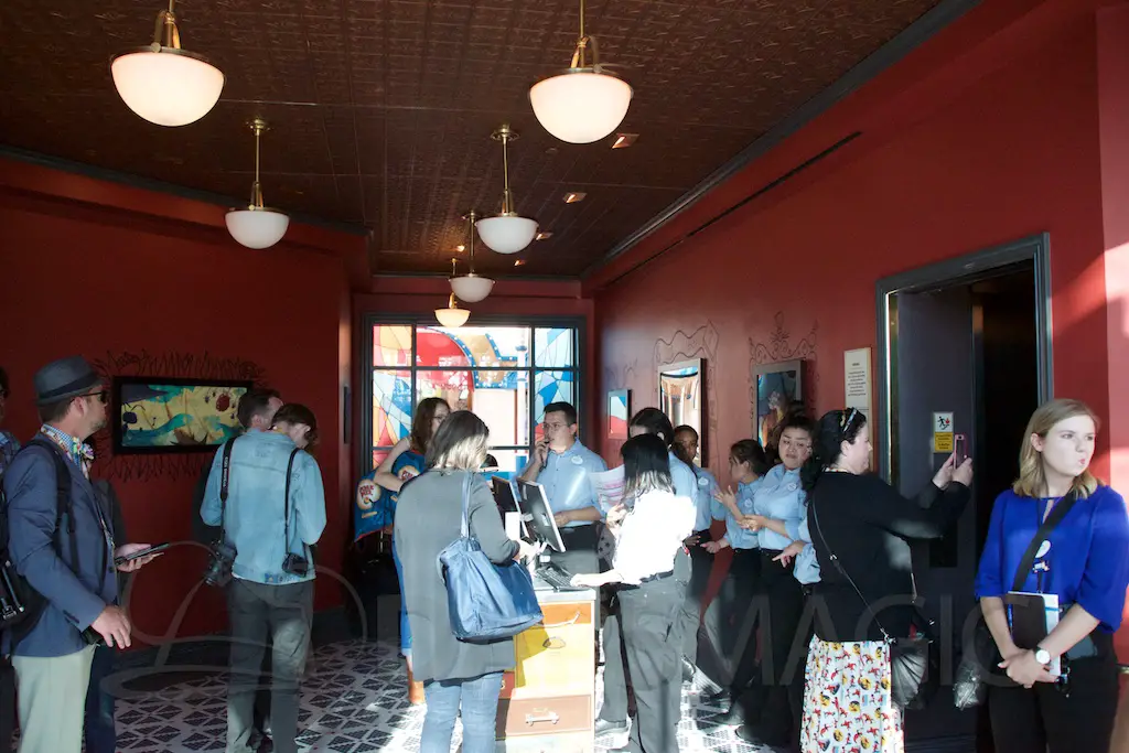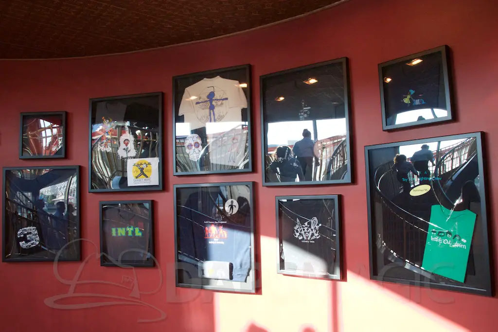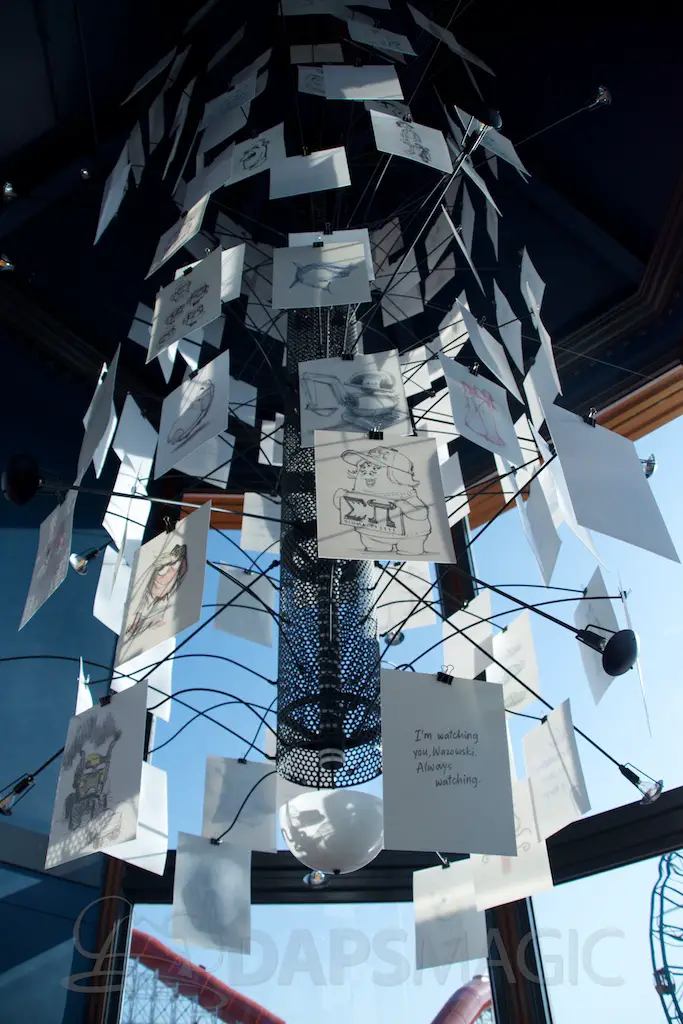 Entering Lamplight Lounge there are subtle homages to popular Pixar films. Around each frame of artwork are drawings that symbolize iconic elements of the great movies. This is just the check-in lobby for the gastropub. To get seated you wind down a spiral staircase with an amazing chandelier above. The light fixture is full of concept drawings of Pixar characters and scenes we’ve all grown to love. This brings guests into the world of Pixar Animation. Not the movies themselves, but the animator’s mind.
