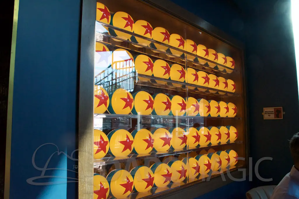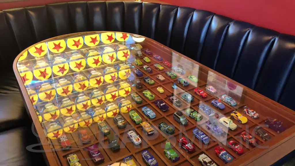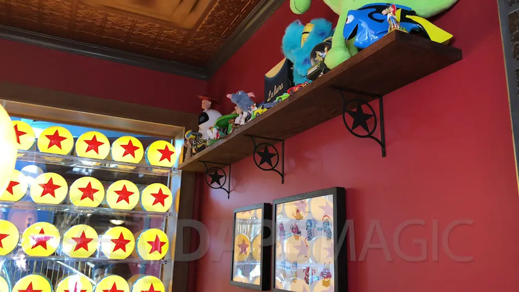 Then there’s an alcove that I would call the toy corner. The table is made of Cars diecast toys underneath a glass top. Towards the ceiling are shelves with stuffed animals and toys of beloved characters. All of this is behind a Pixar ball wall that is easily going to be a photo op for many diners.