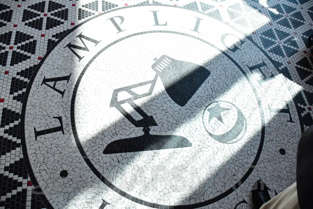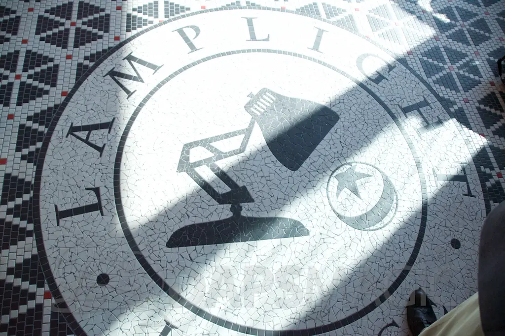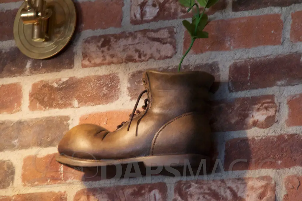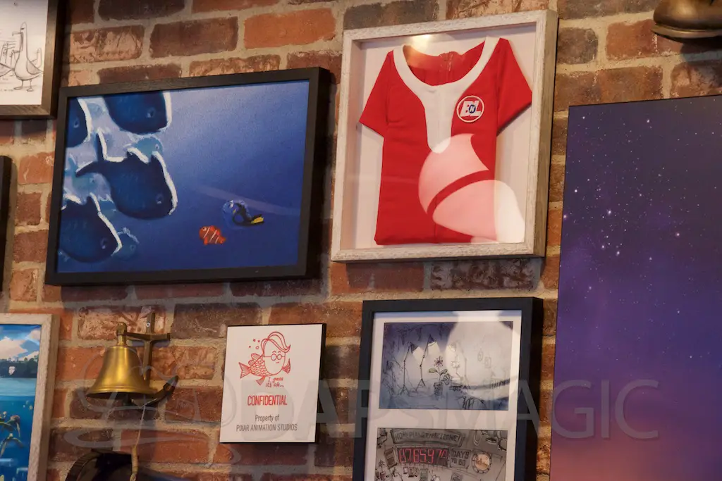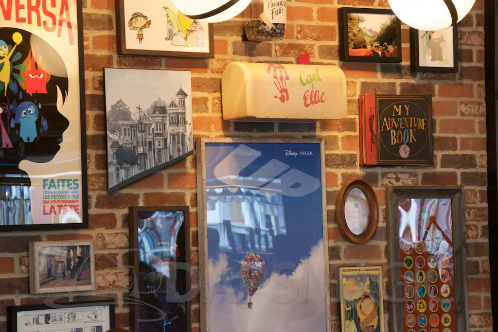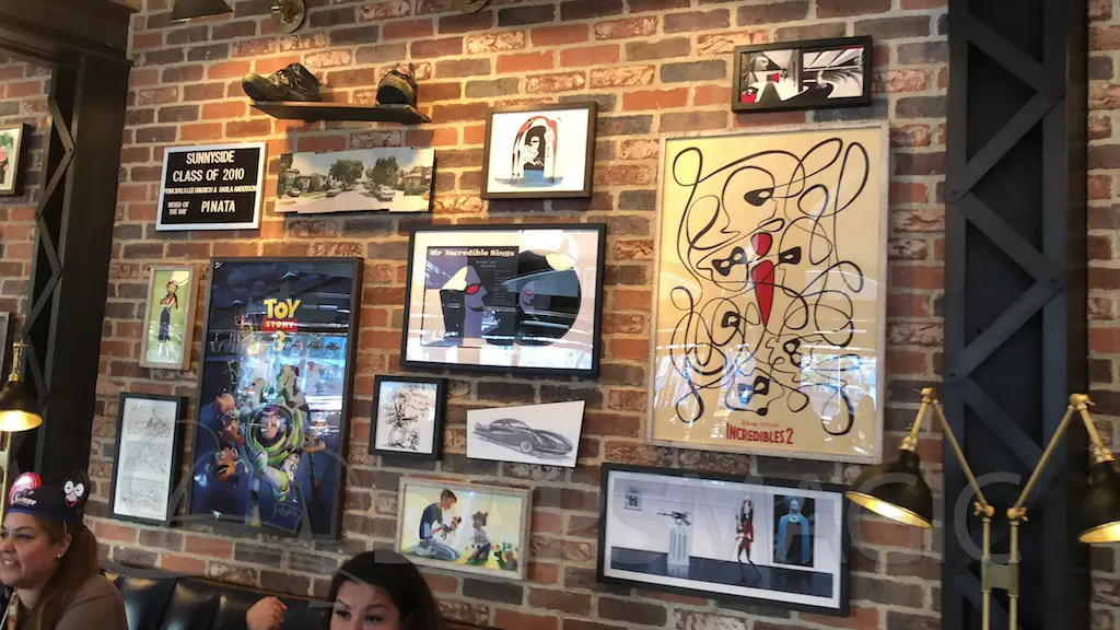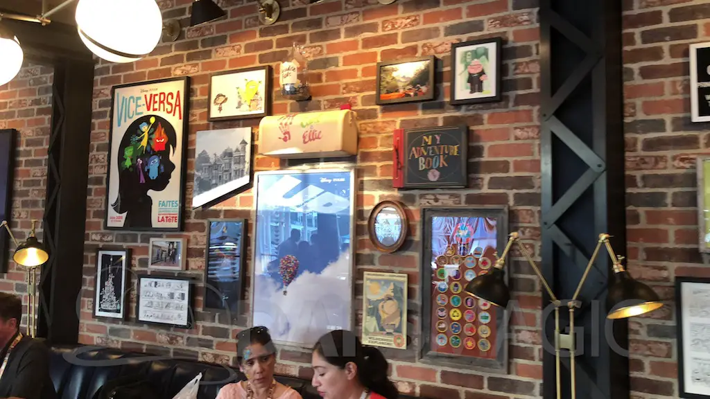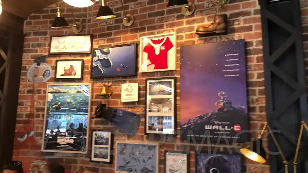 On the inside area of the restaurant is brickwork to convey a converted building. Along the walls are various pieces of art, both inspired and procedural, for Pixar films. There is a boot with a plant symbolizing an iconic item in Wall•E. Posters for various movies are actually from advertising around the world. Concept art shows off the making of Pixar favorites.