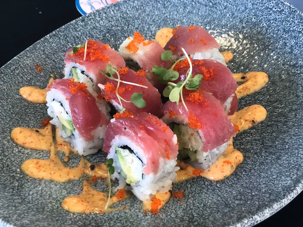 For appetizers, we had the Crab and Tuna Roll, and the Potato Skins. At first, I thought the rolls would be like spring rolls, but they were sushi rolls! I’m pretty sure that is a first at the California parks (not the Resort overall, just the parks). It had the ingredients of a tuna California roll, but with very tasty crab and some kick to the sauce and even tuna itself. It’s possible to have this as a meal in itself. The potato skins are like tater tot patties, but don’t let that description fool you! These had a good blend of salt and pepper, and a wonderful bleu-cheese-like sauce that paired well. Mr. Daps and I agreed that we’d easily just scarf down these on another day.