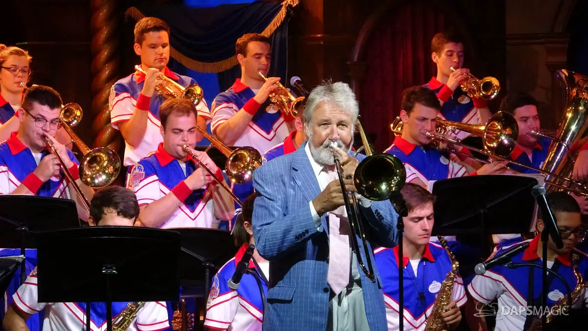 This week the 2018 Disneyland Resort All-American College Band was joined by jazz legend Jiggs Whigham for an incredible concert at the Royal Theatre at Disneyland. Whigham has been returning for over thirty consecutive years as a clinician for the Disneyland Resort College Band. Throughout the concert, Whigham brought a wonderful sense of humor to the performance. It garnered laughs from both the audience and the band members.
