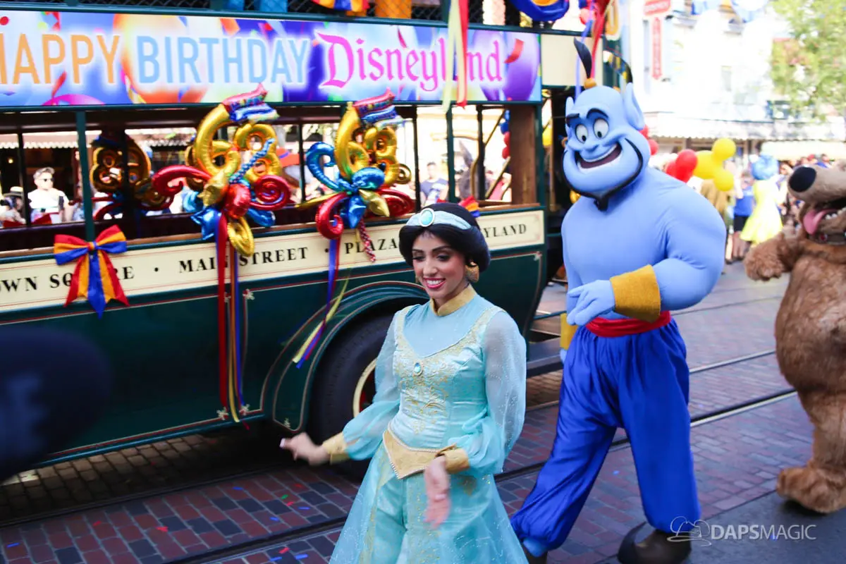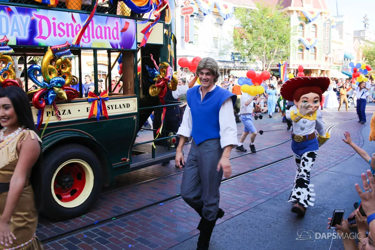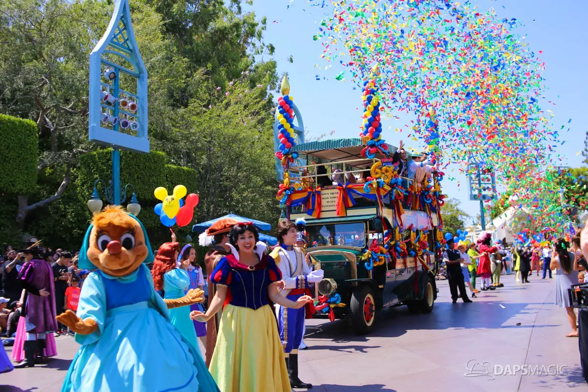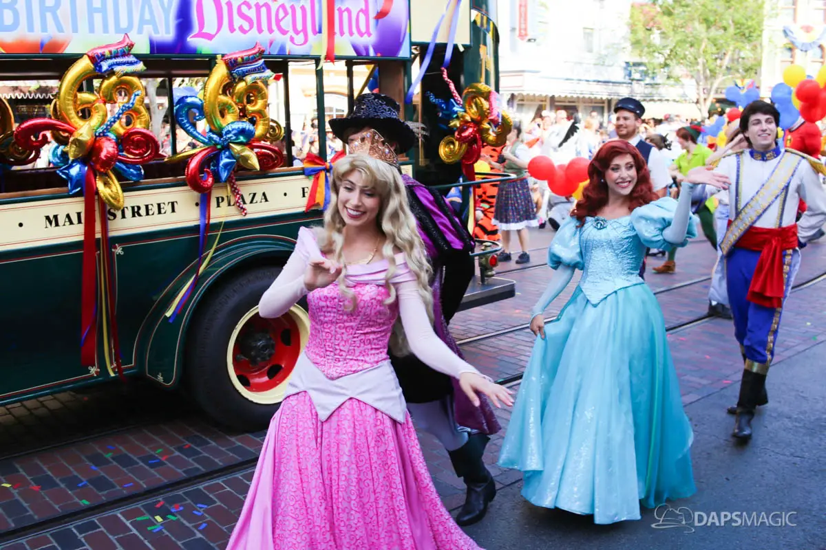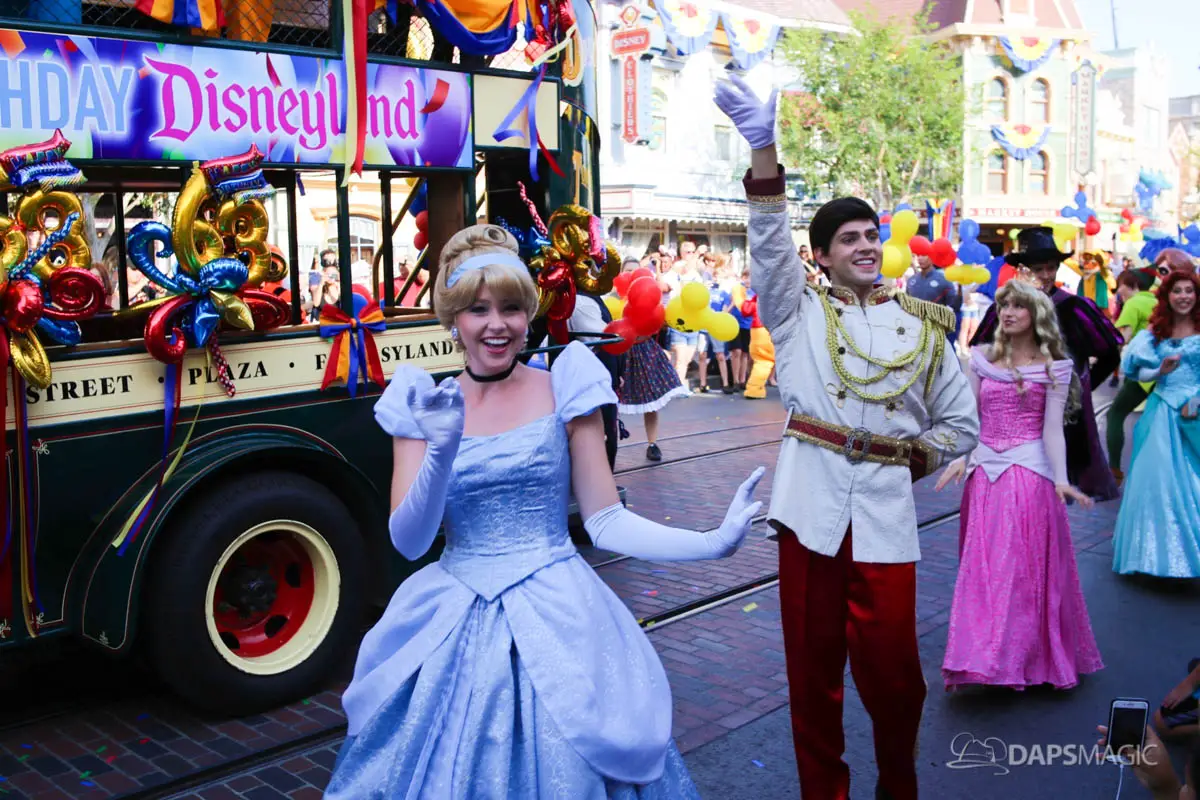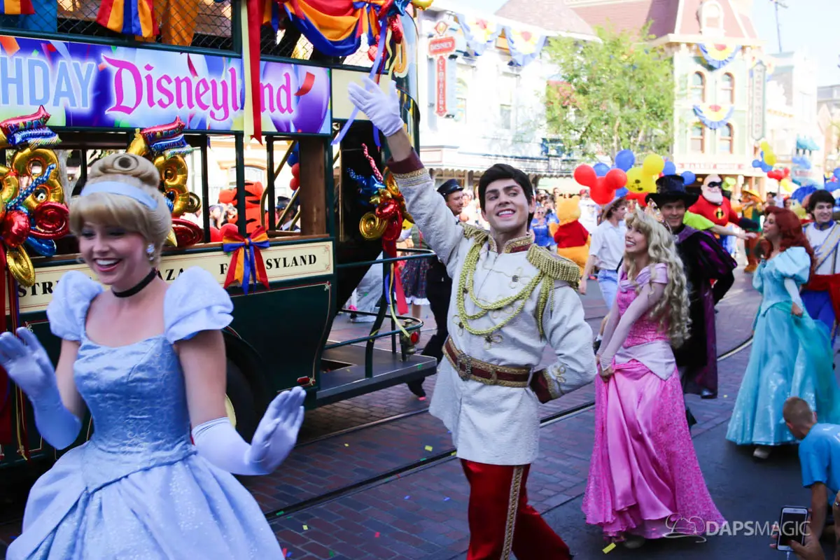 Disneyland’s 63rd Birthday Celebration Cavalcade with 63 Disney Characters at 5:25 pm