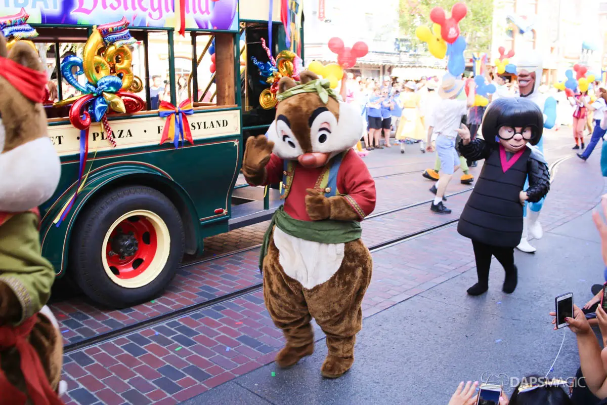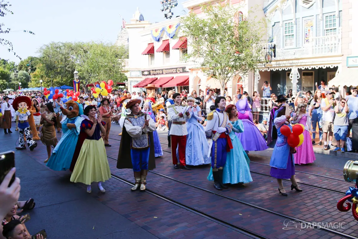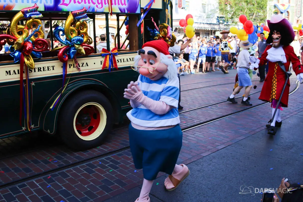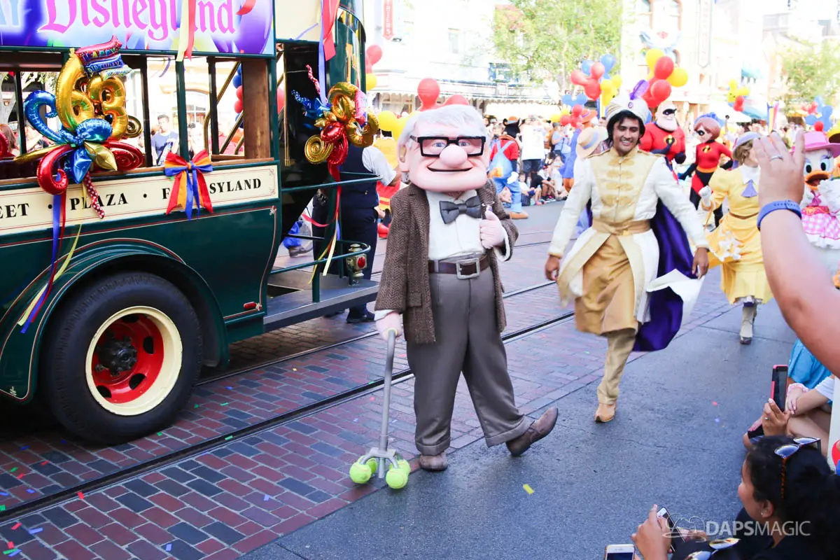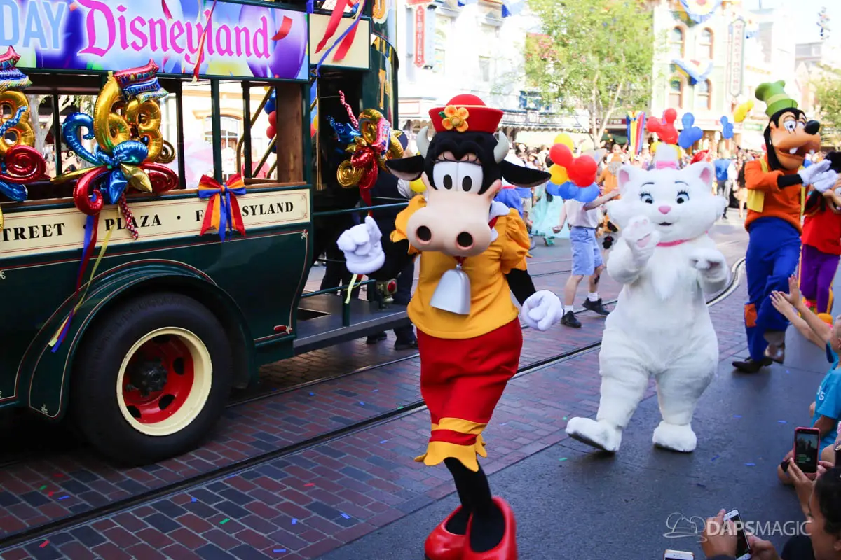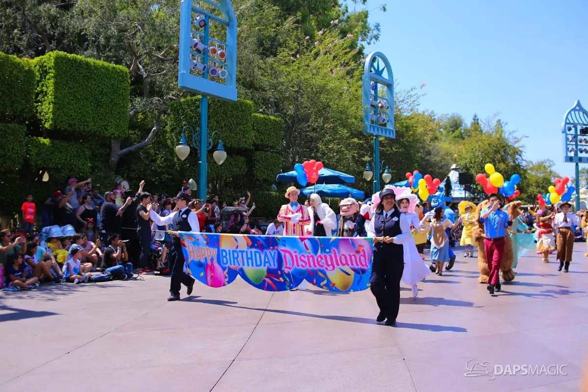 Disneyland’s 63rd Birthday Celebration Cavalcade with 63 Disney Characters at 2:50 pm