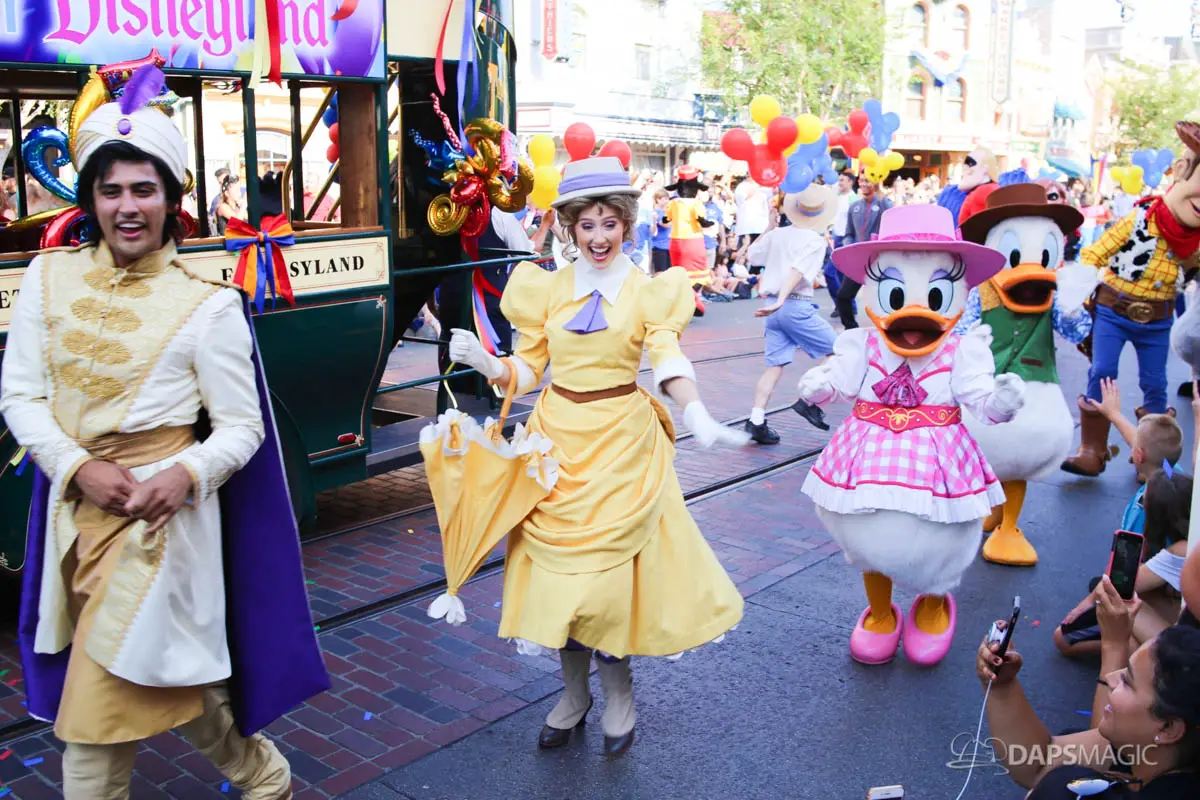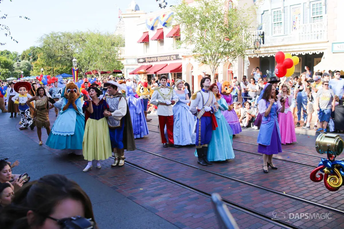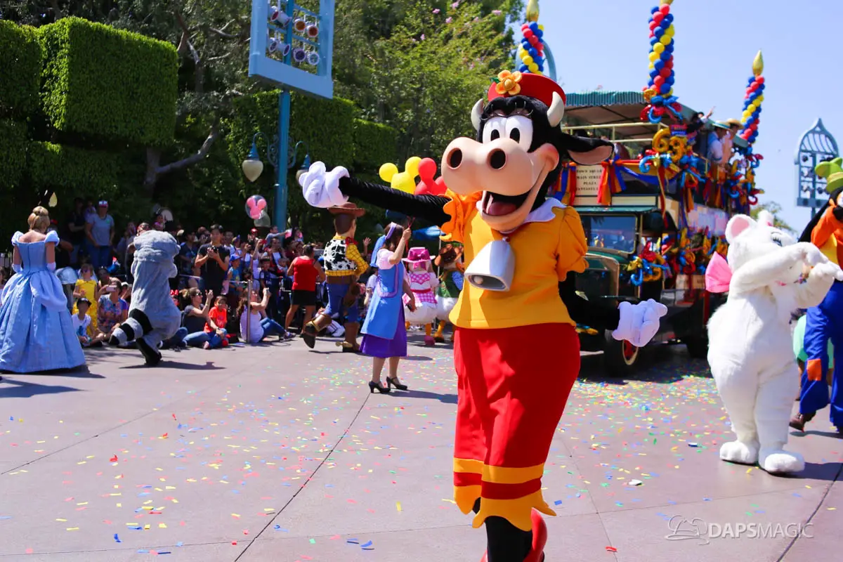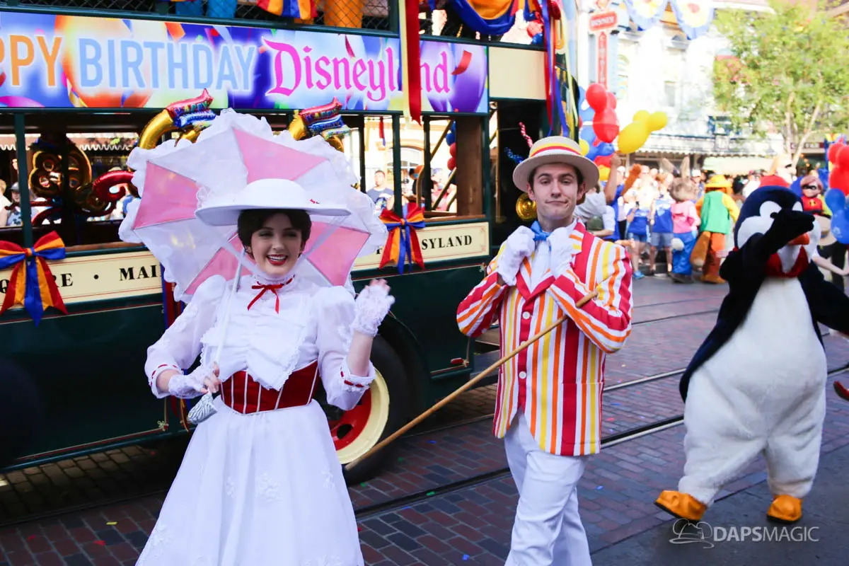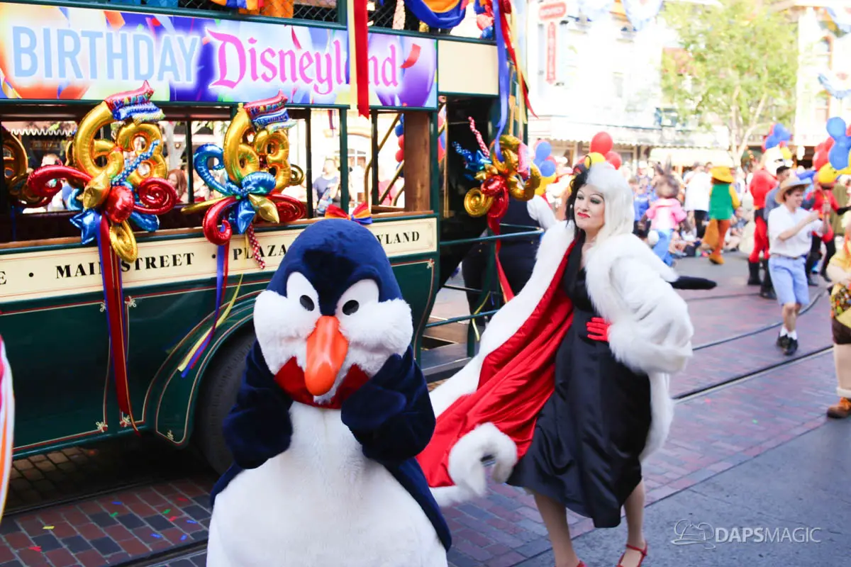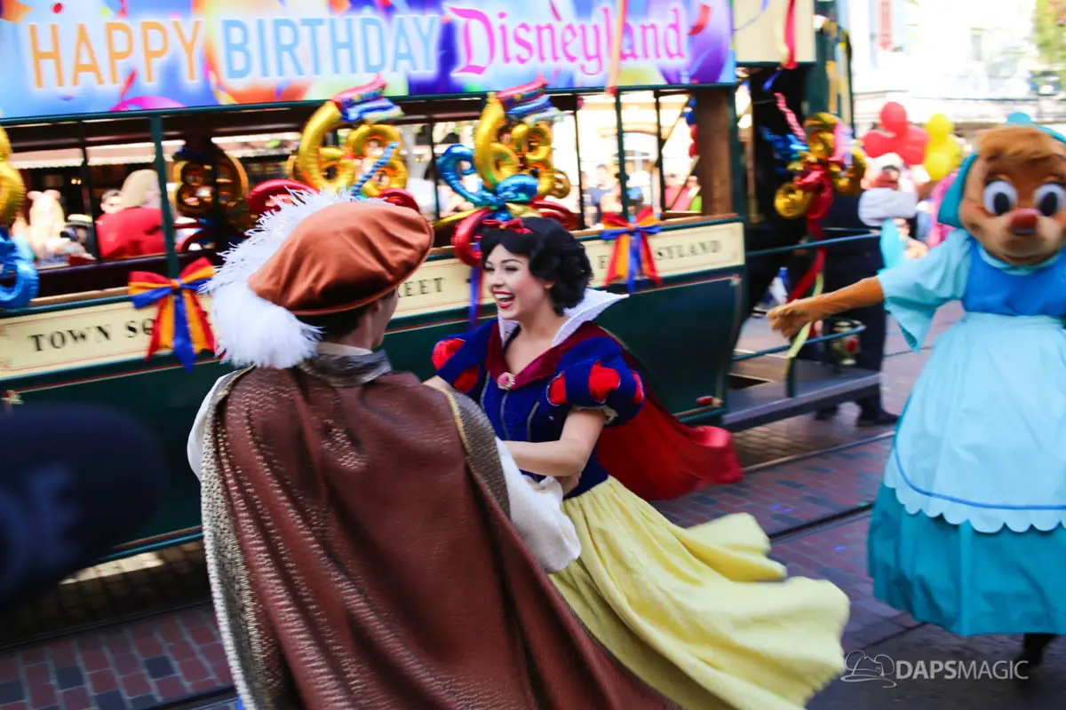 Disneyland’s 63rd Birthday Celebration Cavalcade with 63 Disney Characters at 2:50 pm