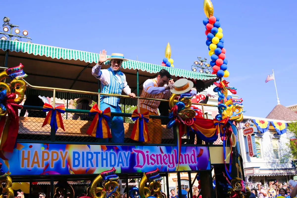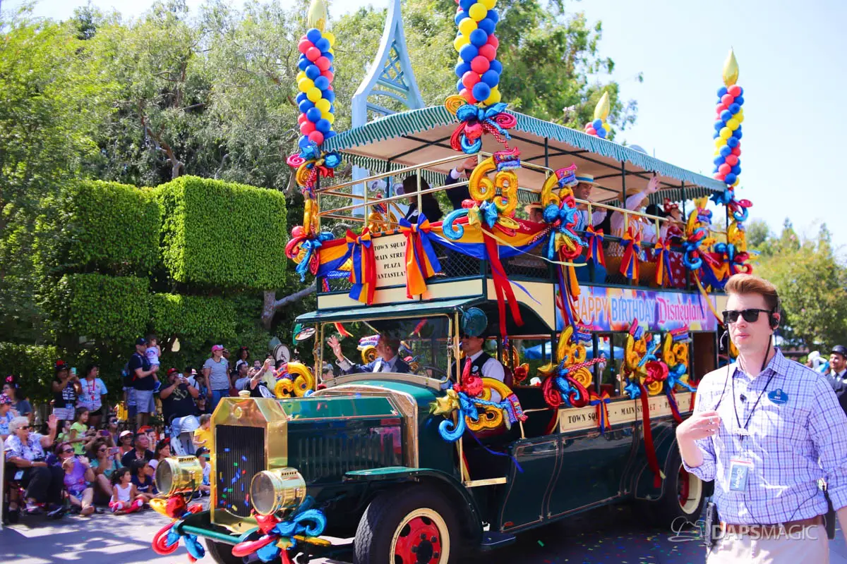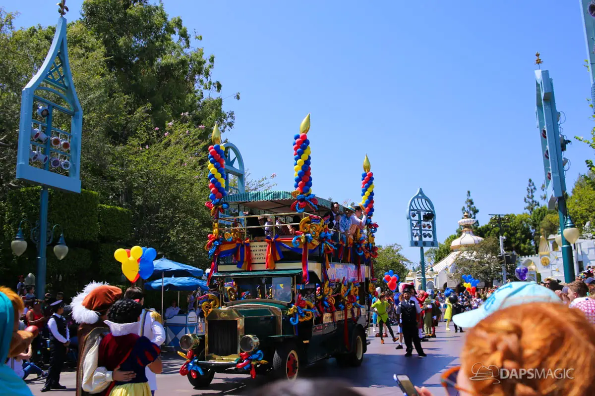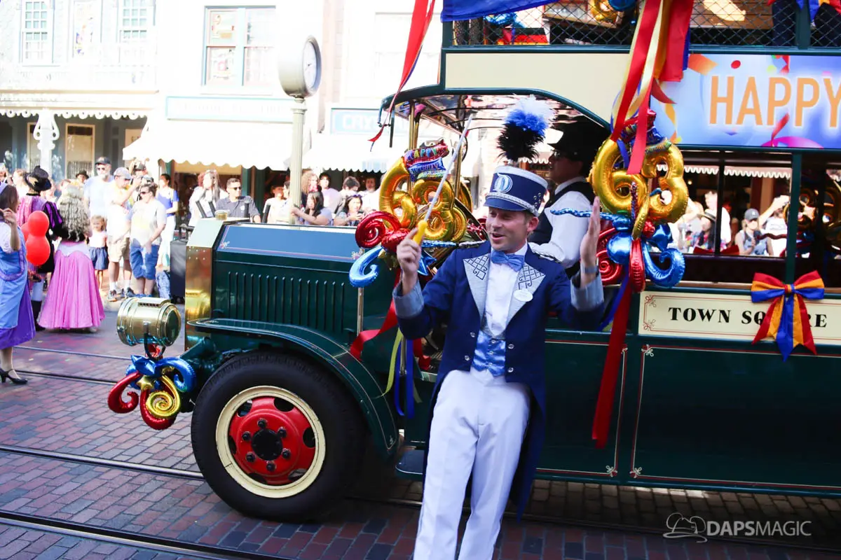 On July 17, 2018, Disneyland celebrated its 63rd birthday. The birthday was celebrated with two cavalcades that made their way through the parade route at Disneyland. The two cavalcades took place at 2:50 and 5:25 pm. Each cavalcade had four stops along the parade route. The cavalcade was comprised of 63 characters, the omnibus, the Dapper Dans of Disneyland and the Disneyland Band director. At each stop, Walt Disney’s Disneyland dedication speech was played before a rendition of Happy Birthday was sung. Then the characters made a circle around the Omnibus allowing the guests in attendance the opportunity to see each character.