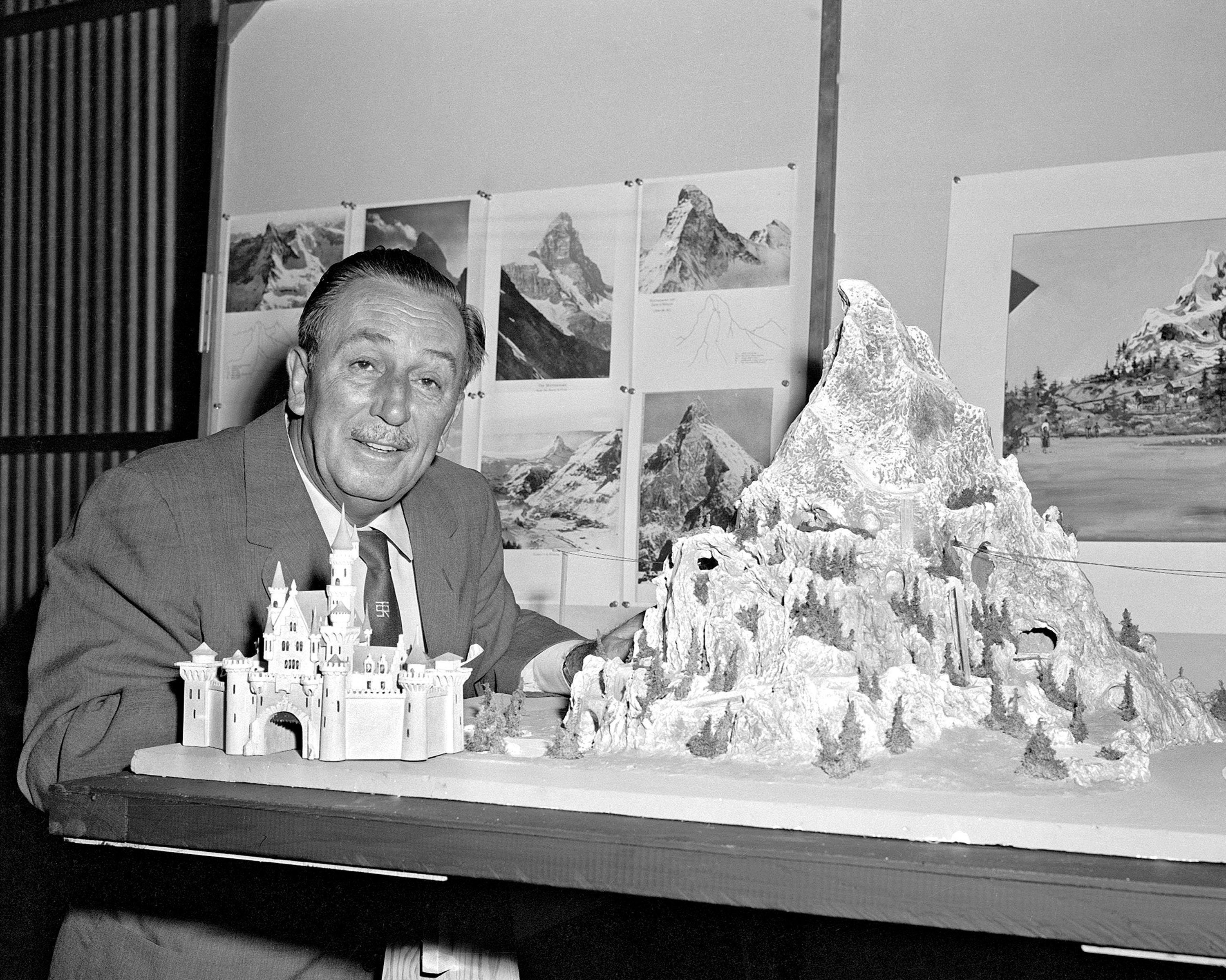 MATTERHORN MODEL (1958) — Walt Disney reviews a model for the Matterhorn Bobsleds which opened in 1959 at a height of 147 feet.