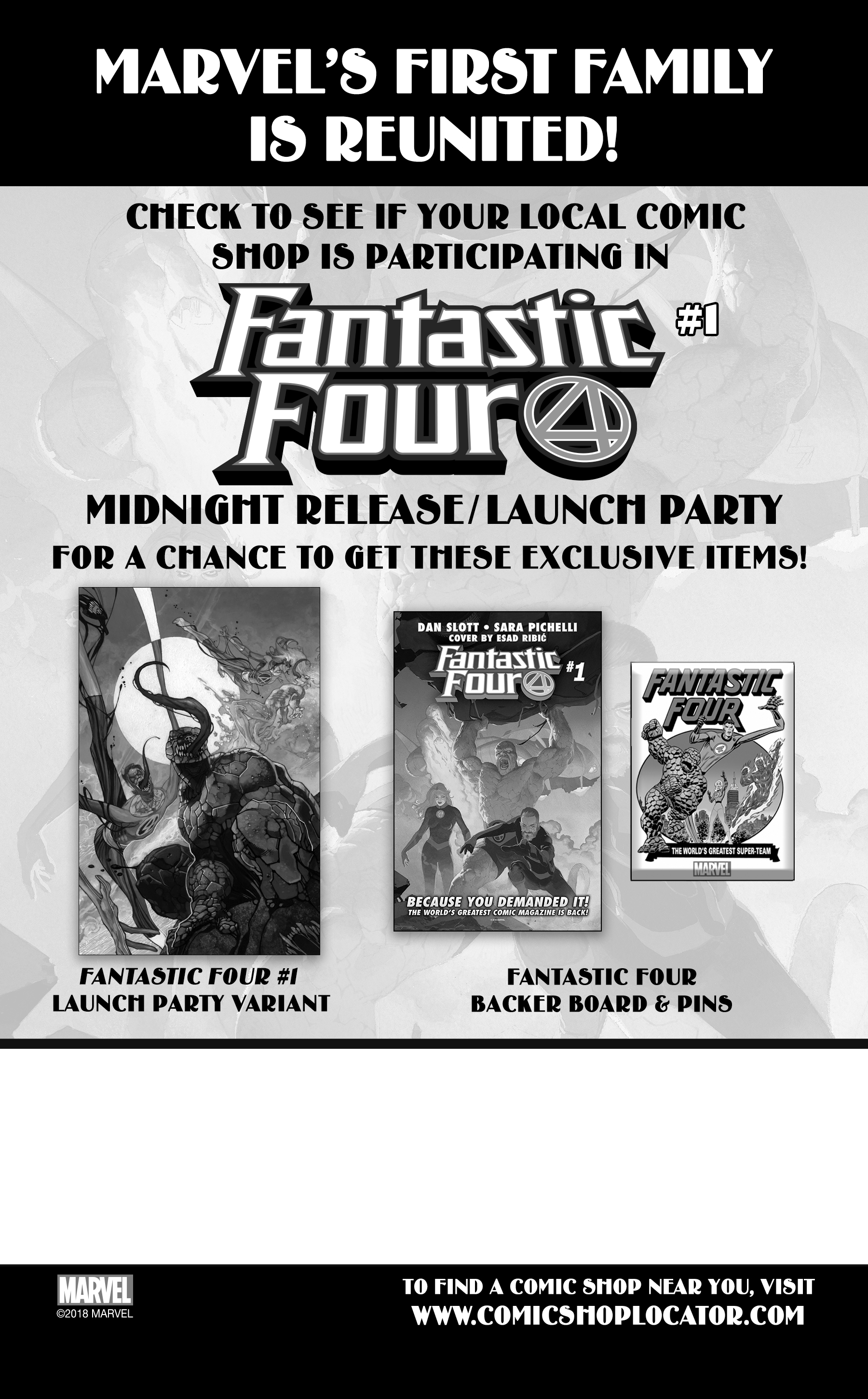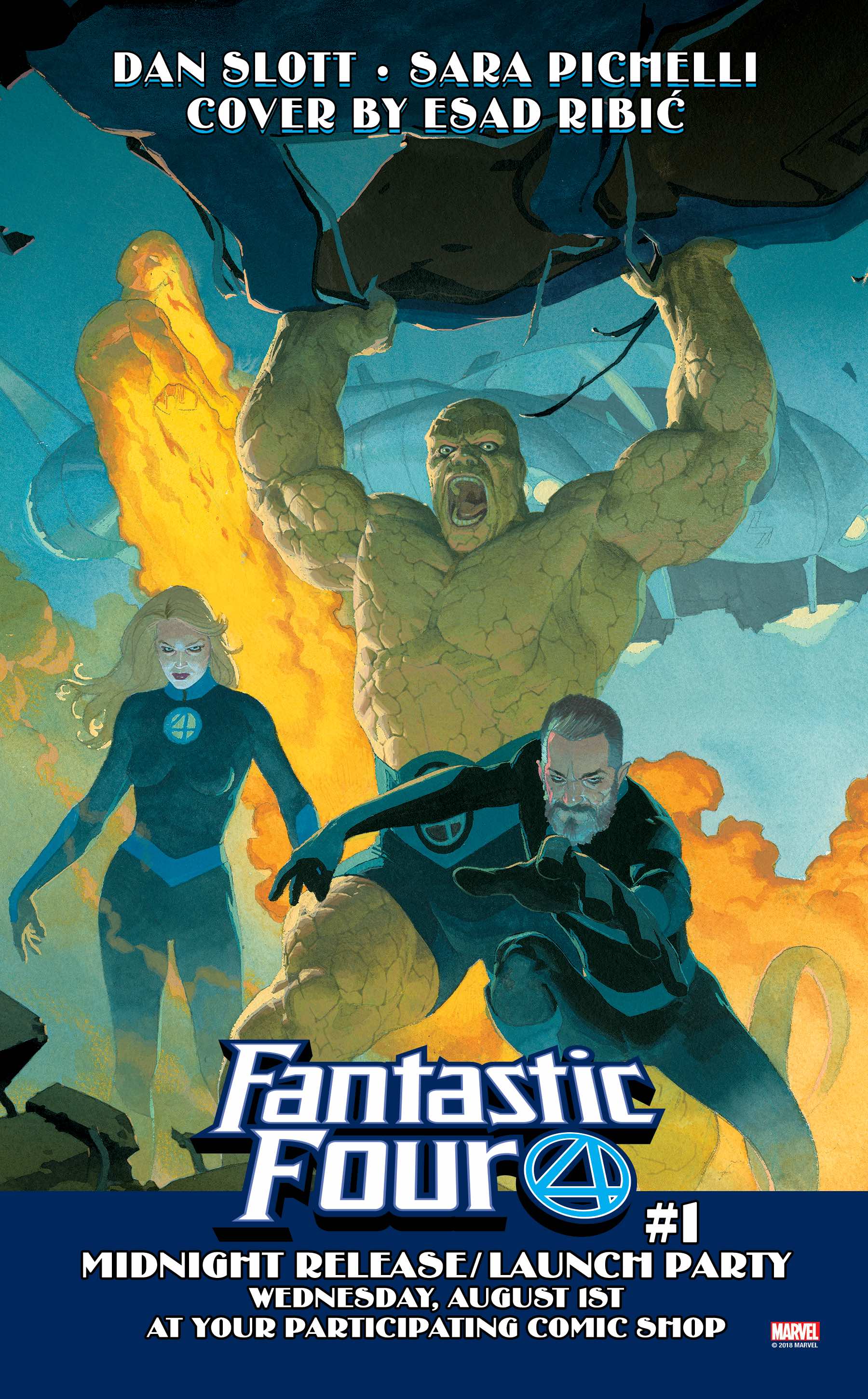 Retailers can choose to hold their launch parties on Wednesday, 8/8, or they can hold their launch parties during a special midnight release. In addition to exclusive variant covers, free window clings, and a JULY 2018 SPOTLIGHT FREE PREVIEWS issue which will have a preview of FANTASTIC FOUR #1, participating retail stores will receive exciting promotional items.