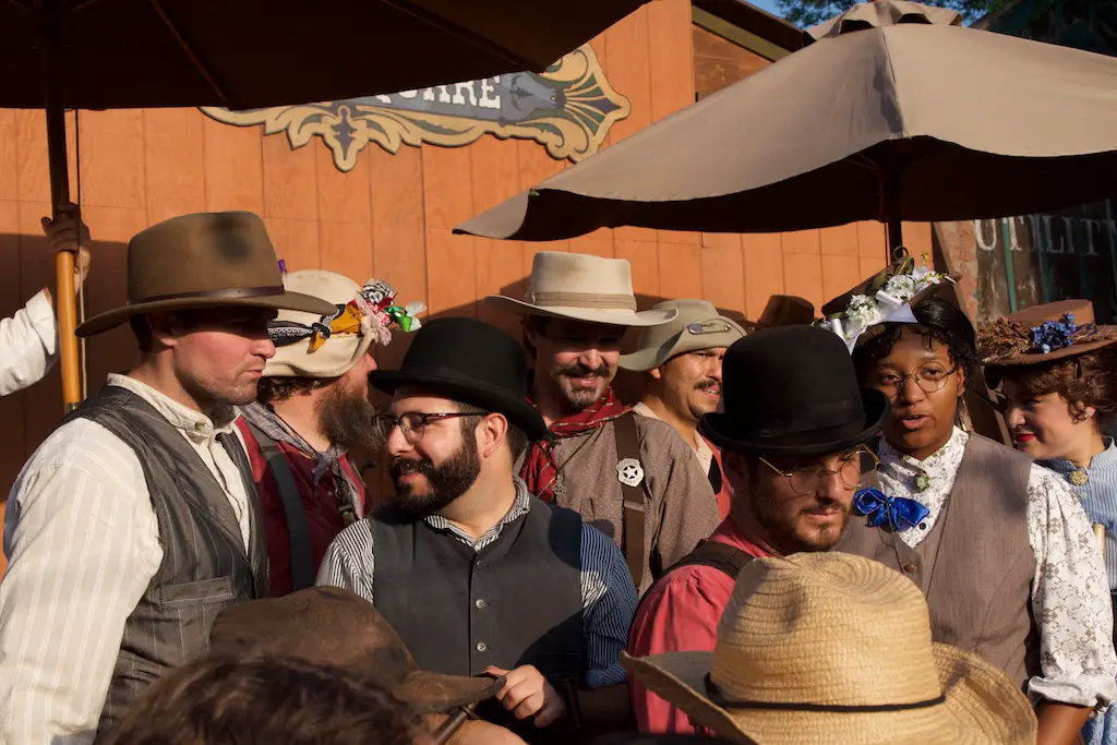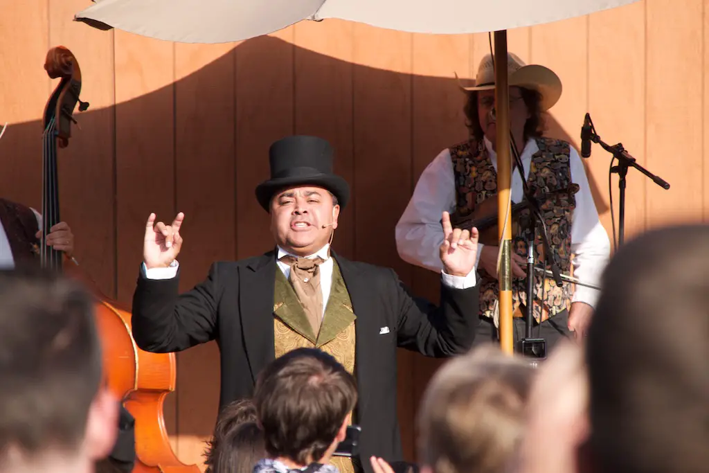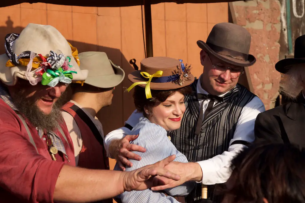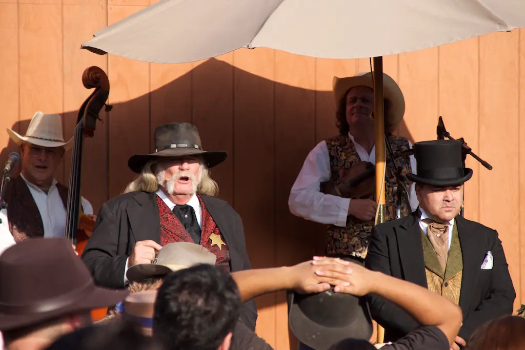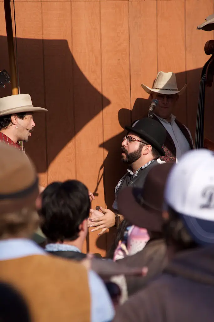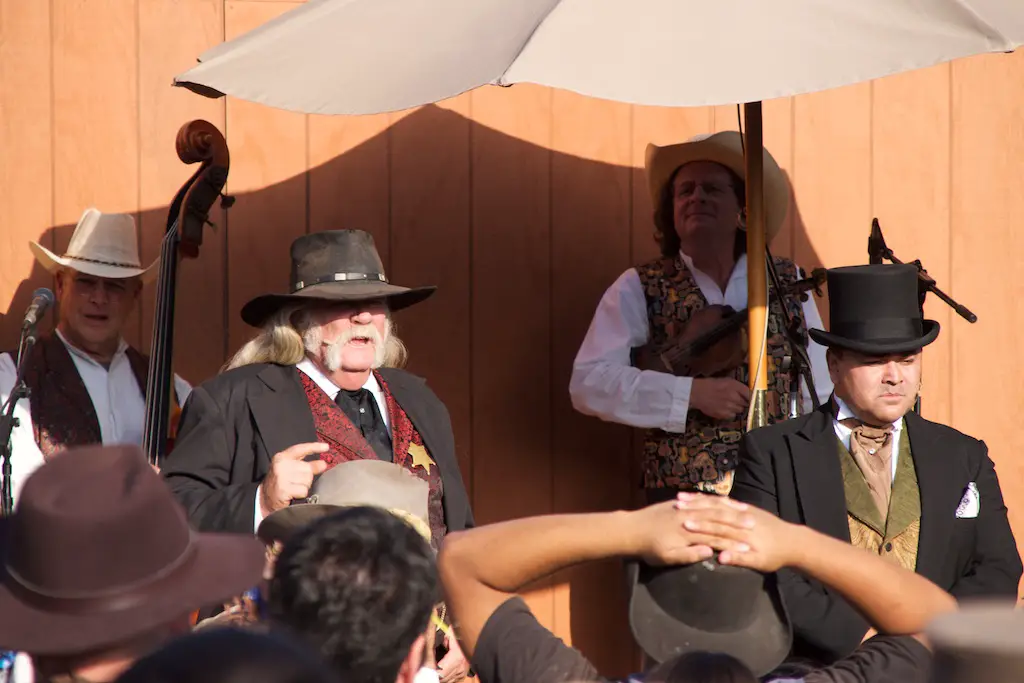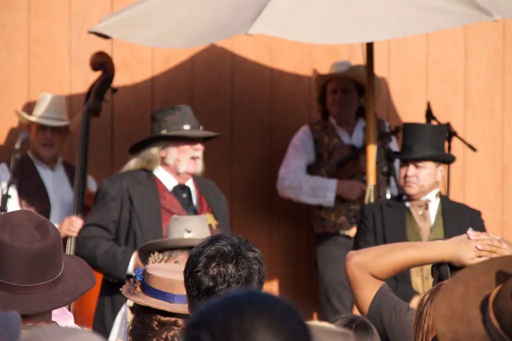 The Hoedown is the nightly finish to a day with Ghost Town Alive. It starts with the Calico Miners playing at Calico Square. Square dancing lets guests get in on the fun as one of the characters call out the actions. There is a usual theme and general story to each Ghost Town Alive, but every year there is an additional plot that gets resolved at the Hoedown. There is also a mystery that is concluded at the finale Hoedown.