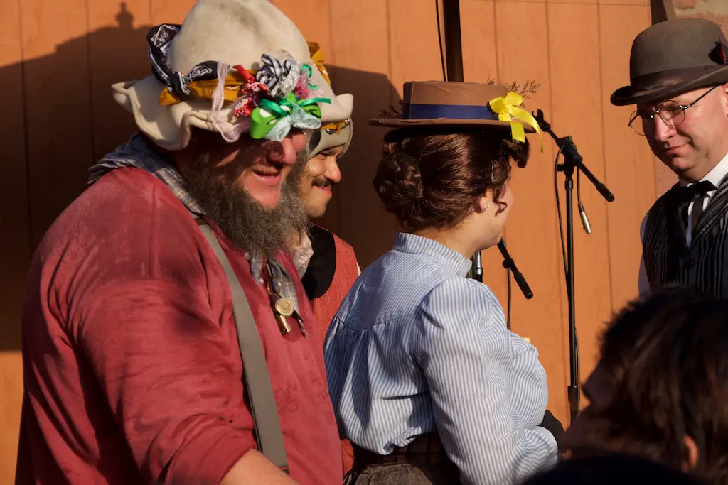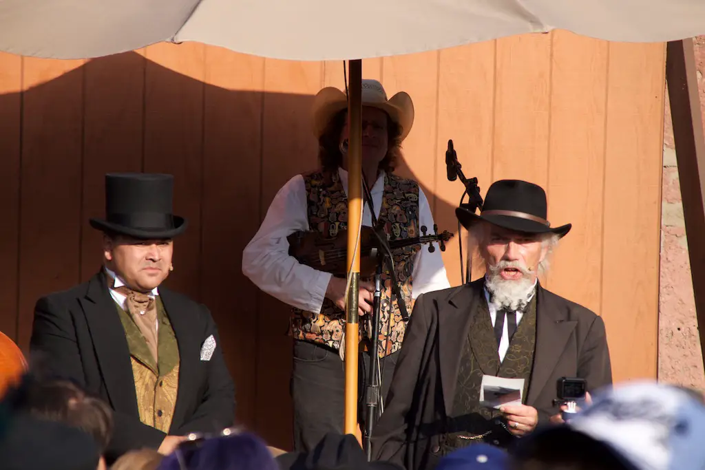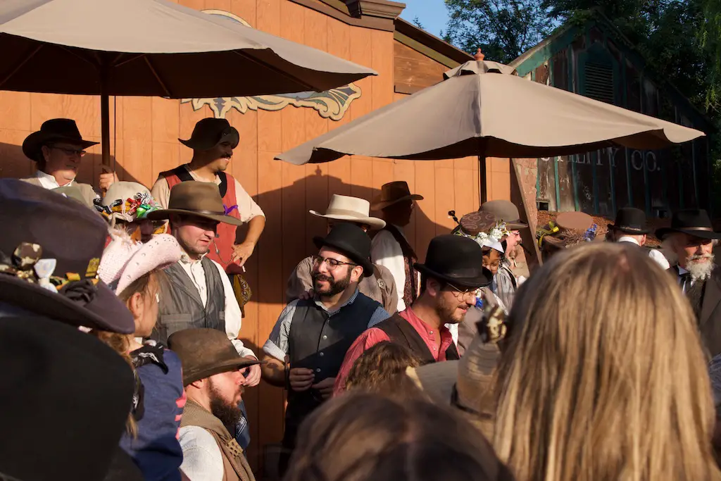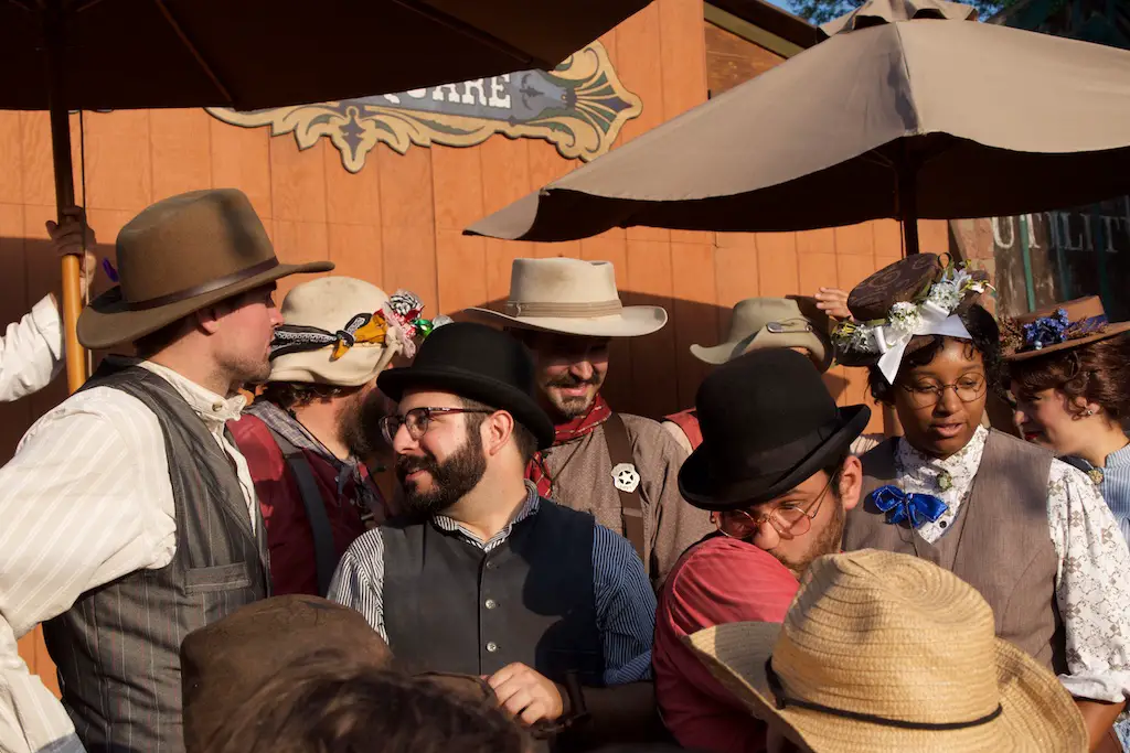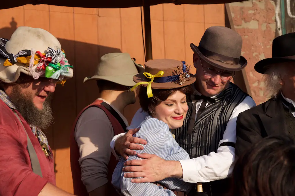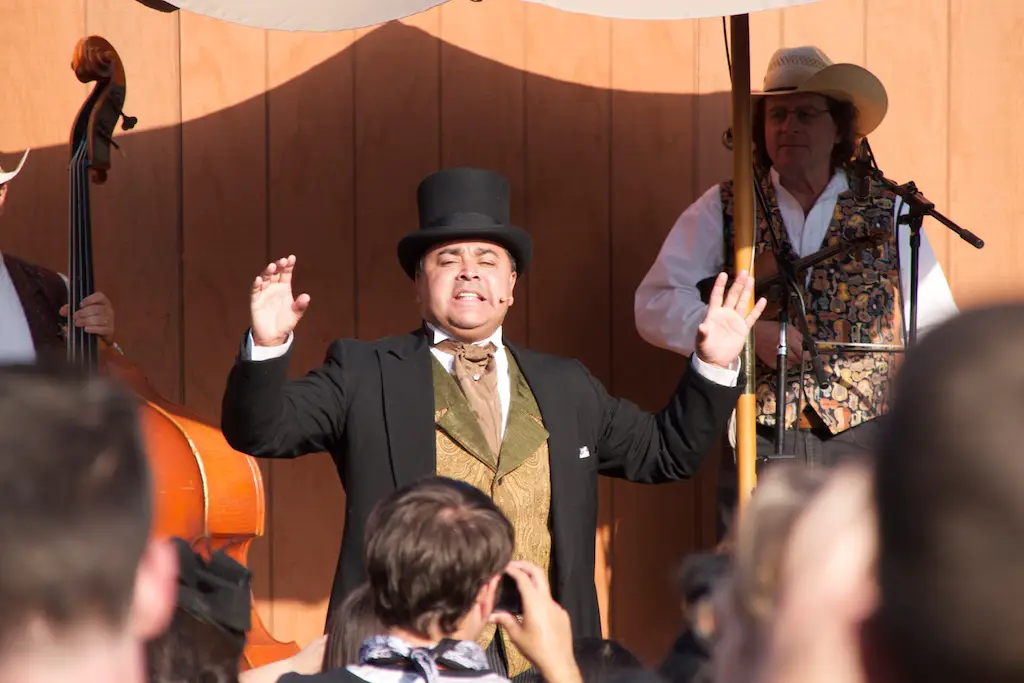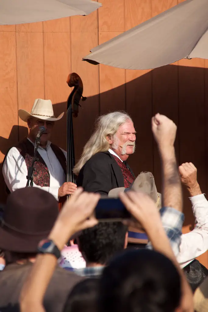 The Hoedown is the nightly finish to a day with Ghost Town Alive. It starts with the Calico Miners playing at Calico Square. Square dancing lets guests get in on the fun as one of the characters call out the actions. There is a usual theme and general story to each Ghost Town Alive, but every year there is an additional plot that gets resolved at the Hoedown. There is also a mystery that is concluded at the finale Hoedown.