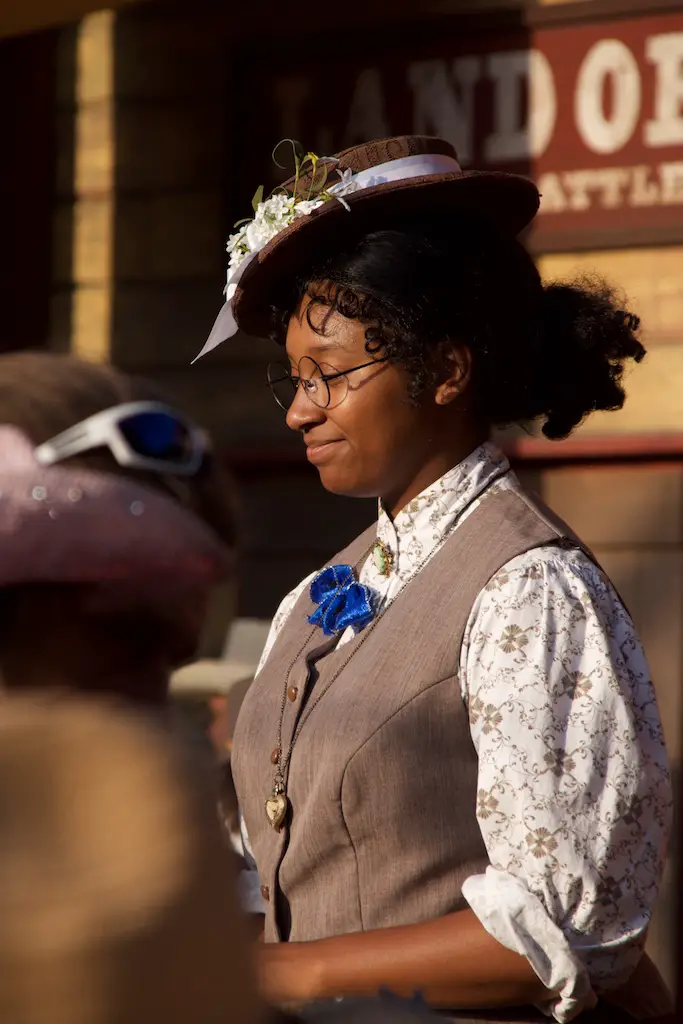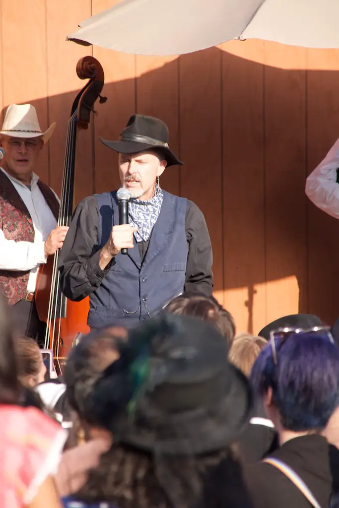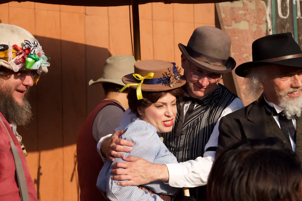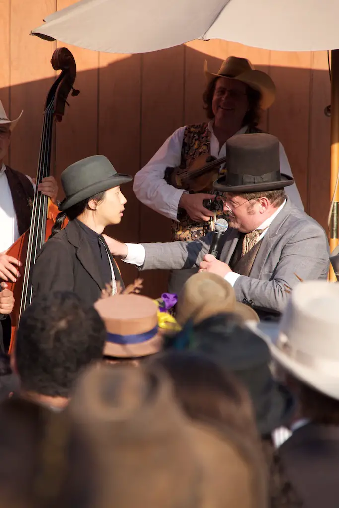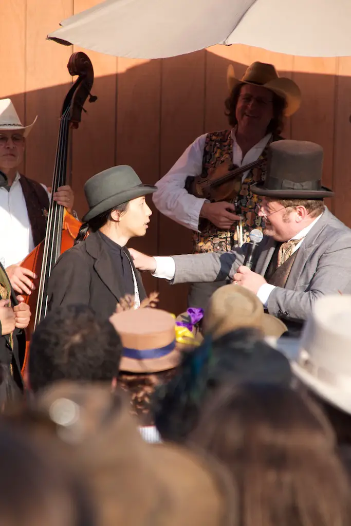 After the founders’ list was read, a lookout above the food stands across the saloon proclaimed a stagecoach was coming. It’s the stagecoach the Sheriff referred to saying was 3 days late and had his Goldie on it. Sure enough, a stagecoach pulled into Calico Square and inside wasn’t just Goldie. Hop Wing Lee came out of the same stagecoach and he was brought on stage as the owner of Calico.