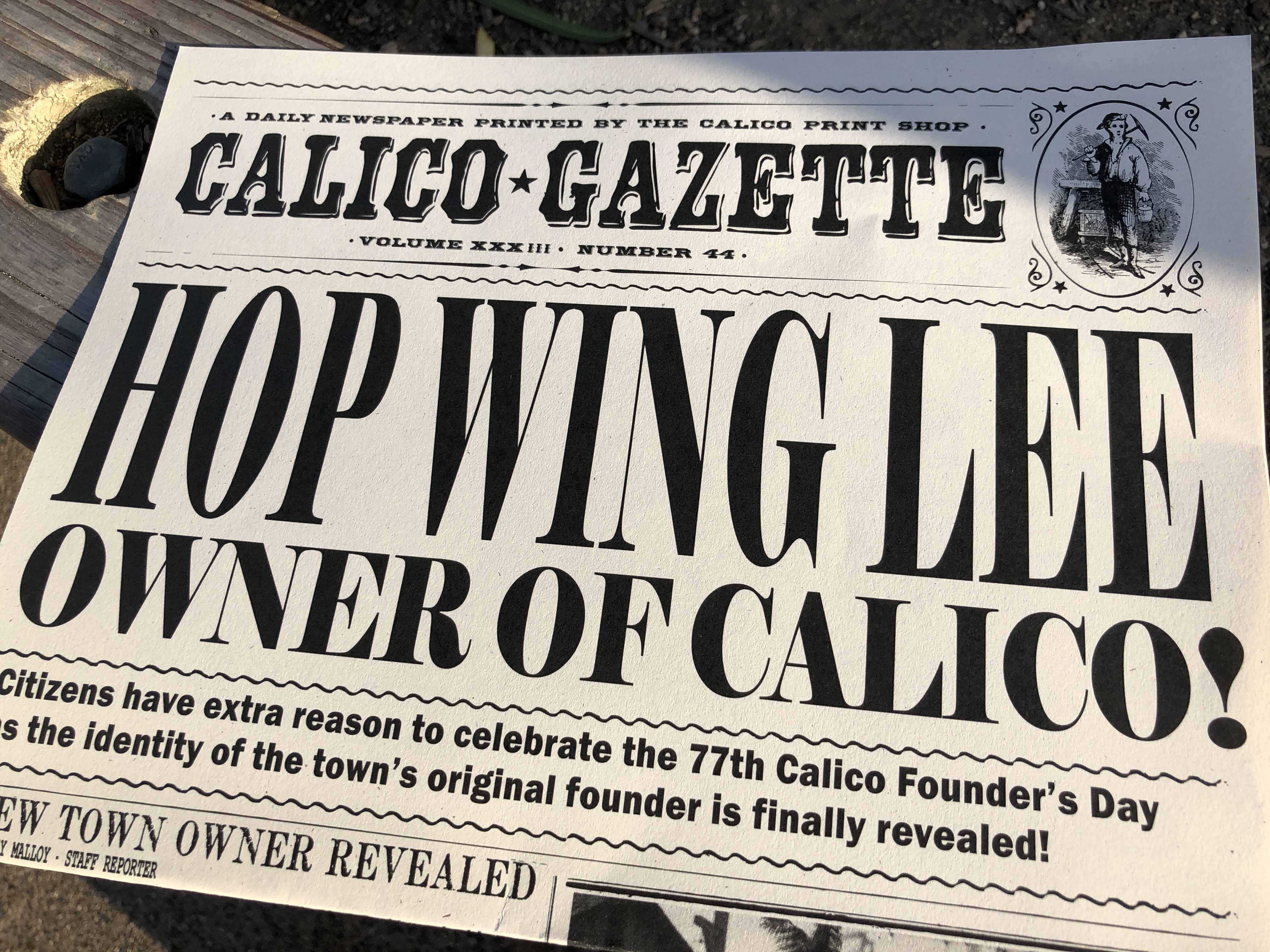 To celebrate, the town and guests did the Calico Serpentine, which was a dancing line that went through all of Calico. Newspapers were handed out declaring Hop Wing Lee as the owner of Calico.
