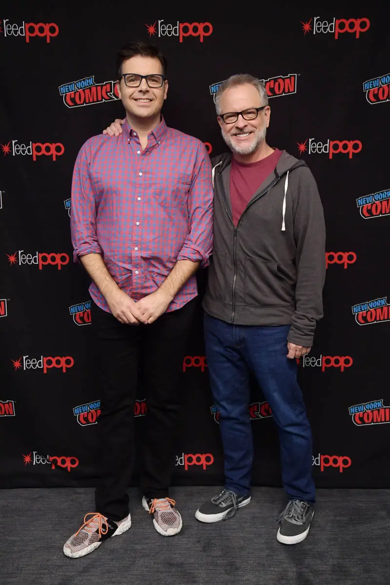 NEW YORK, NY – OCTOBER 05: RALPH BREAKS THE INTERNET writer/director Phil Johnston (L) and director Rich Moore pose backstage before revealing new details about the production and unveiling never-before-seen footage during a conversation with Dani Fernandez at New York Comic Con at Jacob Javitz Center on October 5, 2018, in New York City. (Photo by Ben Gabbe/Getty Images for Disney Studios) *** Local Caption *** Phil Johnston; Rich Moore
