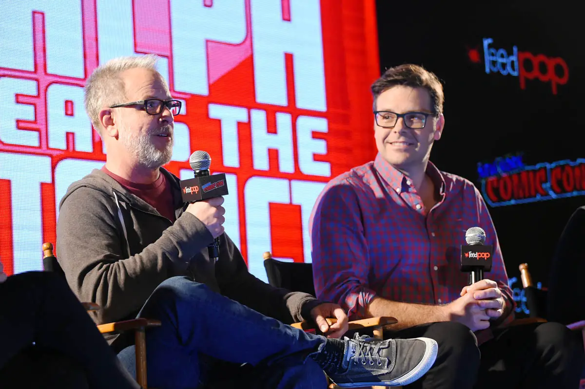 NEW YORK, NY – OCTOBER 05: RALPH BREAKS THE INTERNET directors Rich Moore and Phil Johnston (pictured) and head of story Josie Trinidad reveal new details about the production and unveil never-before-seen footage during a conversation with comedian Dani Fernandez, who makes a cameo as herself in the film, at New York Comic Con at Jacob Javitz Center on October 5, 2018, in New York City. (Photo by Ben Gabbe/Getty Images for Disney Studios) *** Local Caption *** Rich Moore; Phil Johnston