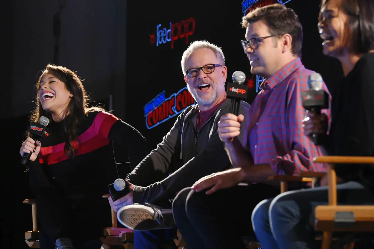 NEW YORK, NY – OCTOBER 05: RALPH BREAKS THE INTERNET directors Rich Moore, Phil Johnston and head of story Josie Trinidad reveal new details about the production and unveil never-before-seen footage during a conversation with comedian Dani Fernandez (L), who makes a cameo as herself in the film, at New York Comic Con at Jacob Javitz Center on October 5, 2018, in New York City. *** Local Caption *** Dani Fernandez; Rich Moore; Phil Johnston; Josie Trinidad